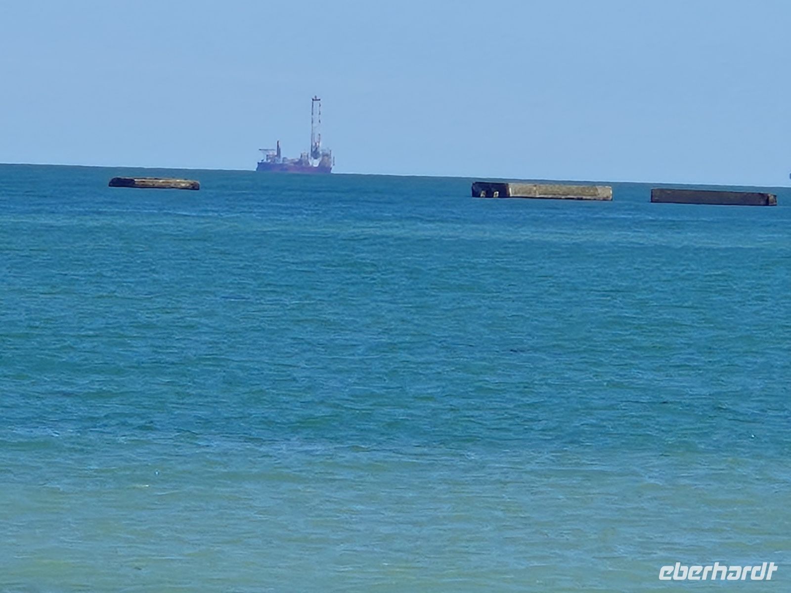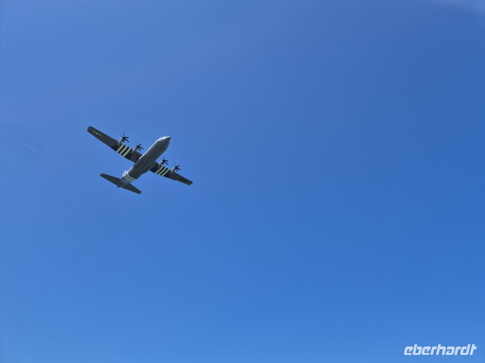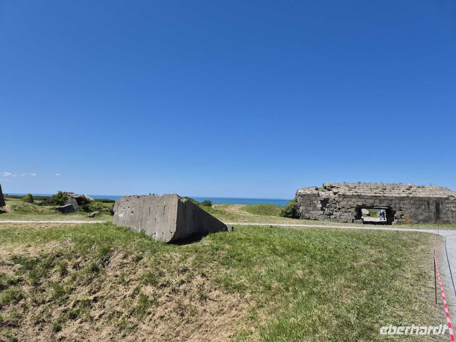 Dieser Tag war der „Bunkertag“, an dem wir die Monumente und Gedächtnisorte der Cote du Debarquement sahen. An diesen Stränden begann die Operation Overlord, die Landung der Alliierten ab dem 6.Juni 1944, die 12.000 Befreiern das Leben kostete. Noch immer trifft man hier steinalte Briten, Amerikaner und Kanadier, die an die Orte ihres Einsatzes vor 80 Jahren zurückkehren. Die Landungsabschnitte (O nach W) heißen u.a. Sword Beach, Juno Beach, Normandy Beach, Gold Beach, Omaha Beach. An letzterem (b. St. Laurent de Mer) und im 20 km östlich liegenden Arromanches (Normandy Beach) landeten die transportablen Häfen Mulberry A und B. Man sieht sie auch heute noch eindrucksvoll und bizarr im Meer liegen. Auf der Landzunge Pointe du Hoc kann man ein beeindruckendes Schlachtfeld mit Bunkerresten und Bombenkratern sehen. Da der achtzigste Jahrestag der allierten Landung gerade vorbei war, sah man an der ganzen Küste unzählige Oldtimer : Jeeps, Transporter, Tankwagen und in der Luft ganze Staffeln zeitgenössischer Propellermaschinen. Alle Veteranenvereine zeigten gleichzeitig ihr umfassendes Material.
