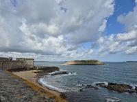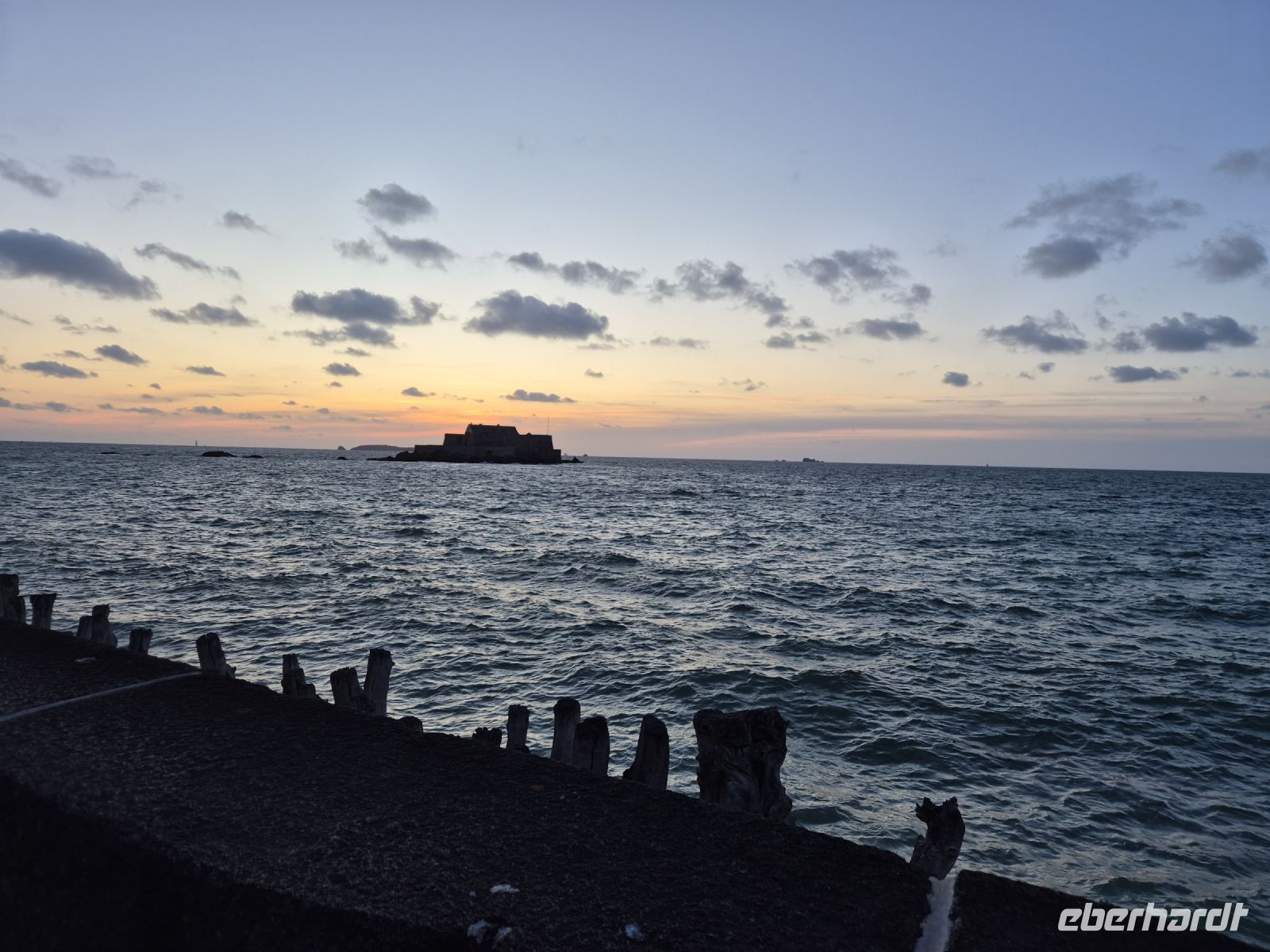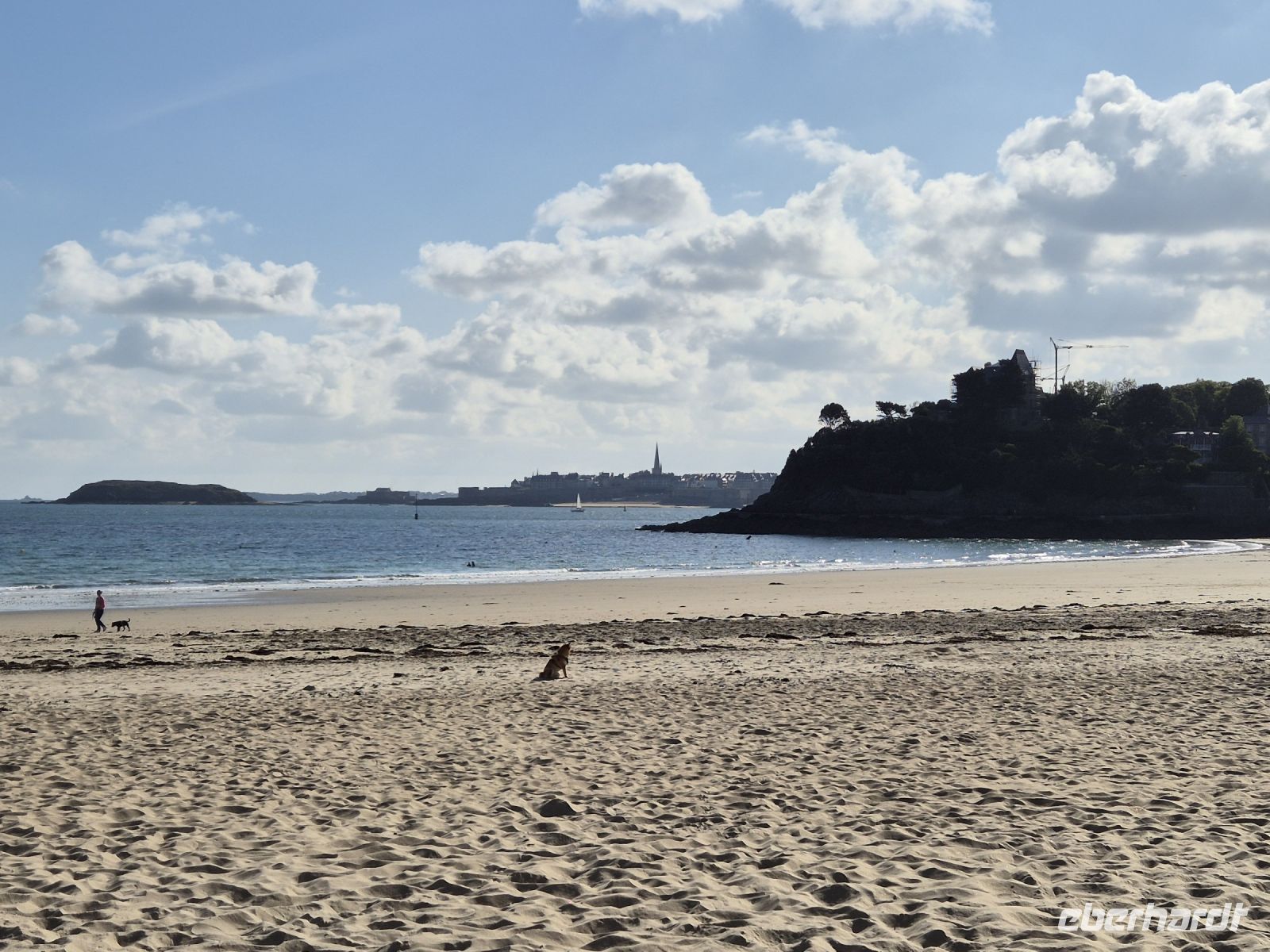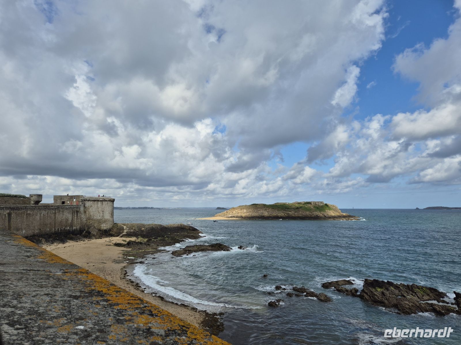 Endlich führte uns Nathalie, unsere örtliche Führerin, durch St. Malo, wo wir schon seit 2 Tagen übernachteten. Die graubraune Stadt in imposanter Lage ist von drei Seiten vom Meer umgeben. Die Altstadt intra muros, innerhalb der dicken Mauern, wurde zu 80 Prozent im alliierten Bombenhagel zerstört. Wie Le Havre und Brest ist St. Malo ein wichtiges Zeugnis des Wiederaufbaus. 33 verlorene Gebäude wurden kopiert. Insgesamt wirkt die Stadt kühl, aber sehr beeindruckend. Ein Muss ist der Rundgang über die Festungsmauern.