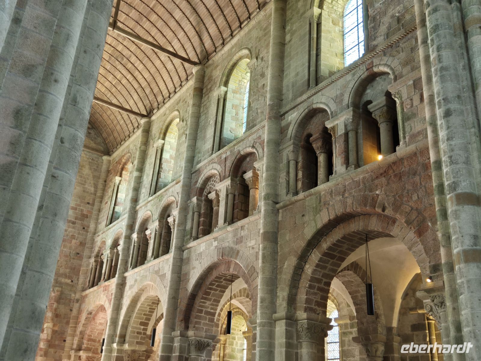 Der Bau der Abtei ging sehr langsam voran wegen technischer und statischer Schwierigkeiten. Immer wieder gab es Einstürze und obendrein Brände. Erst um 1150 konnte die Kirche inkl. Gewölbe und Vierungsturm vollendet werden. Die zwei Türme der Westfassade waren 1184 vollendet. Wie schon gesagt, stammt der heutige Vierungsturm aus dem 19. Jh.. Überhaupt gibt es, wie mancherorts in Frankreich auch, sehr viele Teile aus dem 19. Jh., dass man fast von Rekonstruktion sprechen kann.