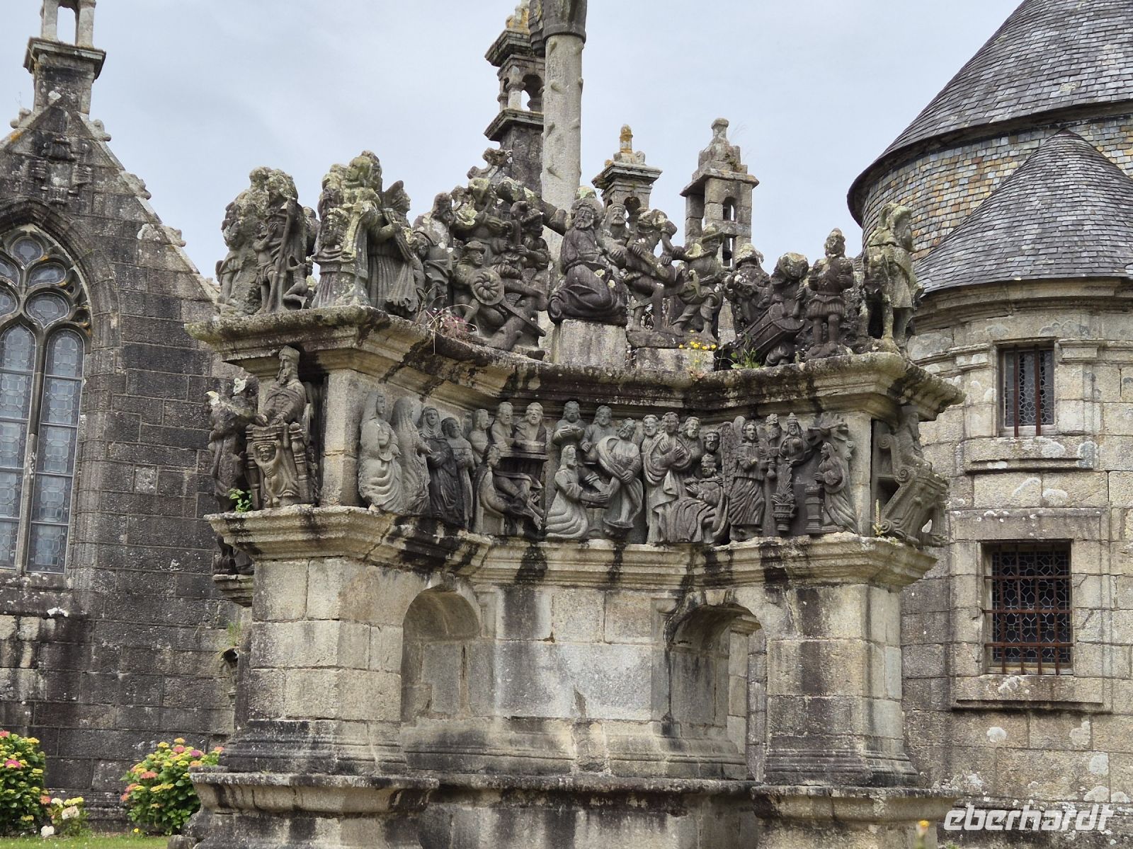 Das Léon ist Frankreichs „Wilder Westen“. Reich geworden durch Tuchhandel mit England, Leineweberei und Gerberei, entstanden hier, in Konkurrenz zueinander, die berühmten umfriedeten Pfarrbezirke. Diese „Enclos paroissial“ des 15. und 16.Jh. sind ein Sonderfall der Kunstgeschichte. Neben den Kirchen entstanden hinter Mauern prachtvolle Beinhäuser und Bildstöcke (calvaires) mit Szenen aus dem Leben Jesu, zu denen ein Triumphtor Einlass vom Profanen ins Sakrale gewährt. Es sind theatralische Bilderbücher, pittoreske Zeichen einer „Pfeffersackfrömmigkeit“. In Guimiliau entstand der Enclos nur 5 km entfernt zur Konkurrenz in St. Thégonnec. Auf dem Triumphtor befinden sich zwei Reiter, auf dem Kalvarienkreuz sieht man Tumultszenen: eine wohl 200köpfige Schar begleitet Christus auf seinem Leidensweg. Das Beinhaus zeigt ein Memento Mori-Relief. Die Kirche zwischen Gotik und Renaissance beherbergt eine Fülle von Heiligen und einen wertvollen Taufstein.