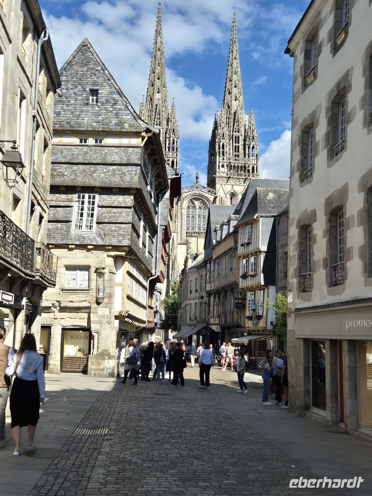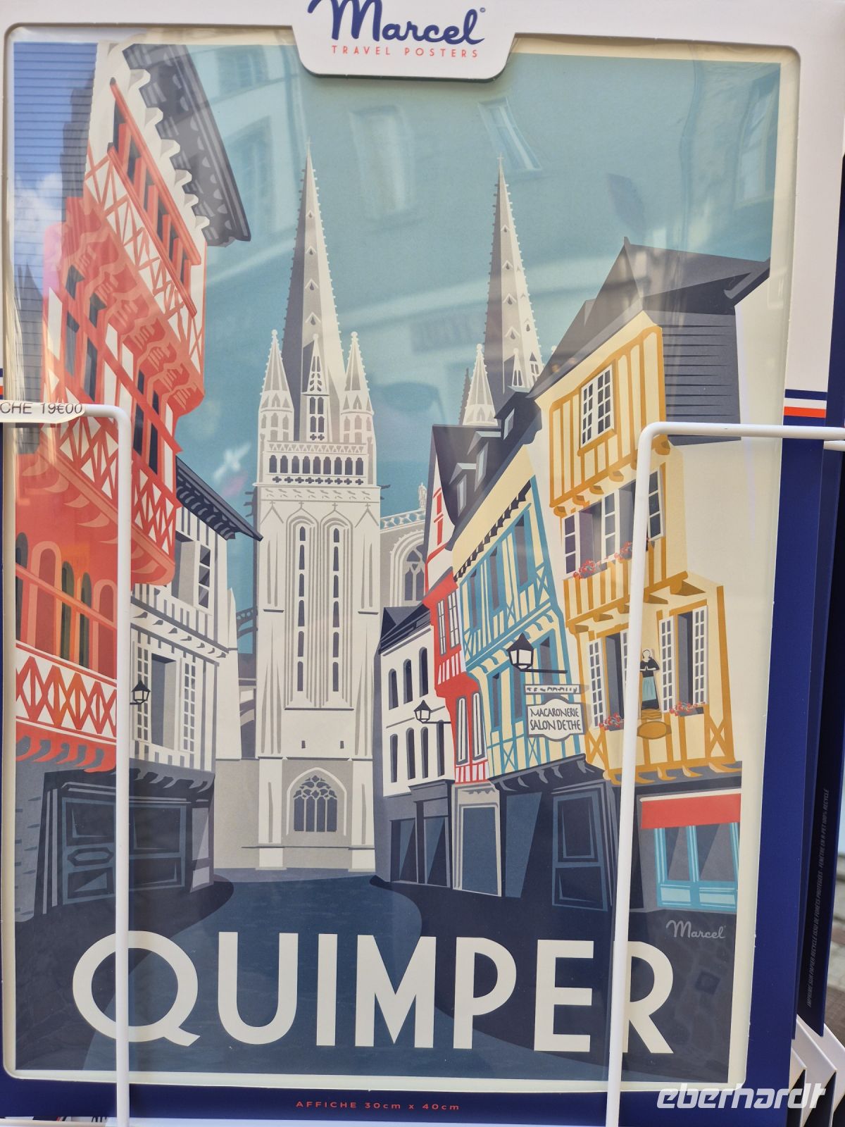 Am sicheren breiten Odet entstand die Hafenstadt an einem Ort, der schon römisches Militärlager war. Quimper ist eine Bischofs- und Fachwerkstadt, die durch die bleigraue Kathedrale St. Cotentin geprägt wird, deren Türme aus dem 19.Jh. stammen. Der Chor driftet leicht links ab, aus Rücksicht auf eine ältere Kapelle. Zum Odet gibt es Reste der Stadtmauern. Der Bischofspalast ist seit 1911 Museum. An der Nordseite der Kathedrale gibt es das Musée des Beaux Arts von 1872. Interessant sind die Viertel um die Rue Kéréon (Fachwerk) und der Place Terre au Duc; die Rue du Sallé, die Rue des Boucheries mit der Maison des Cariatides; der Place au Beurre. Auf dem Boulevard Amiral de Kerguelen schließlich finden sich einige bemerkenswerte Gebäude der Klassischen Moderne: Kodak 1933, Citroengarage 1934, Restaurant Felle Blanche 1932.