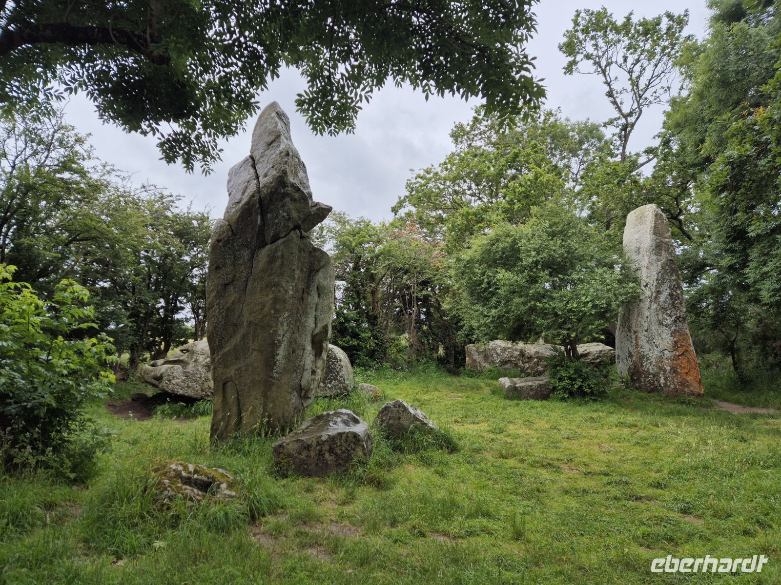 Menhire nennt man die hoch aufragenden Einzelstücke (es gibt in der Bretagne insgesamt 5000), Dolmen sind Ganggräber aus geschichteten Steinen (etwa 1000). Wer sie errichtet hat und was ihre Bedeutung ist, bleibt rätselhaft. Reliefs von Schlangen, konzentrischen Kreisen, Krummstäben, Dolchen und Beilen sind festzustellen.