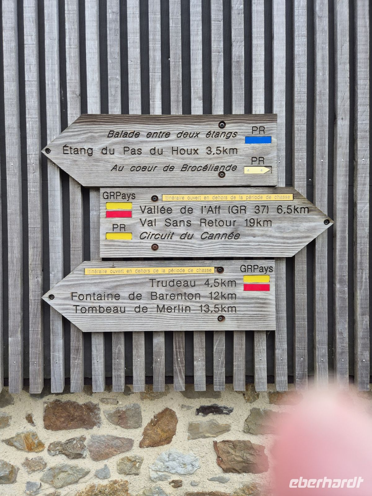 Lancelot wird übrigens im See von Comper (das ist hier um die Ecke) in einem Kristallschloss aufgezogen, und zwar von der Fee Viviane, mit der wiederum Merlin ein romantisches Verhältnis hatte. Hier im Wald liegt übrigens Merlins letzte Ruhestätte (ausgeschildert), ferner die Heilige Quelle von Barenton und der „Feenspiegel“-Teich im Val sans Retour, wo die böse Fee Morgane untreue Ritter gefangen hält.