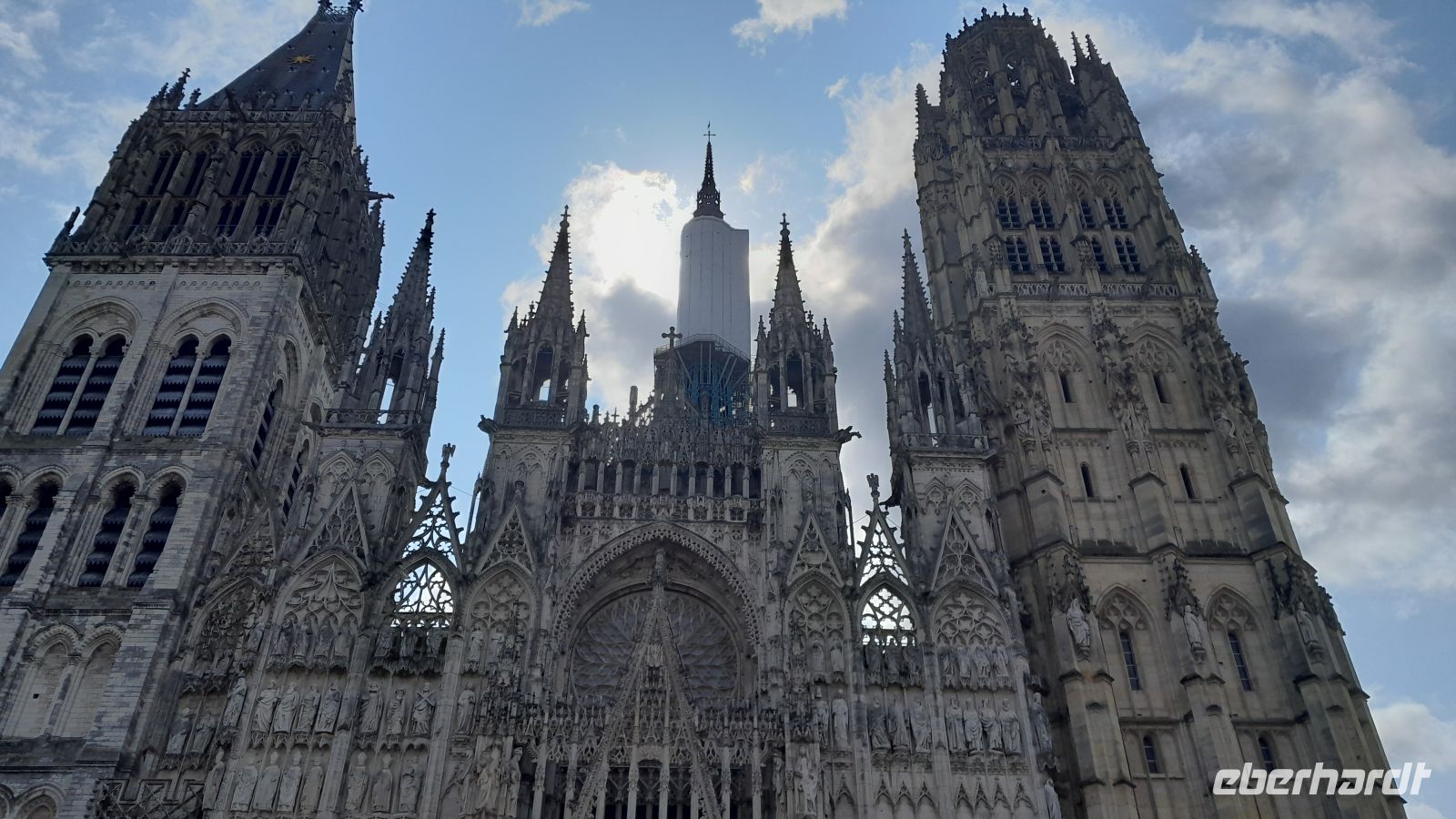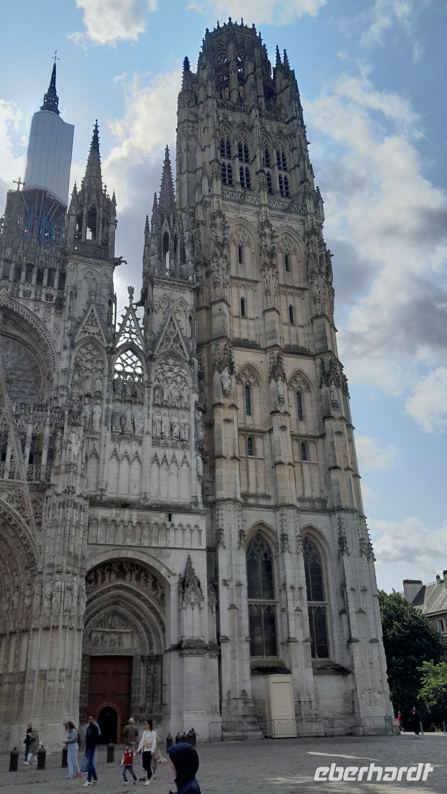 Schneller als erwartet kommen wir in Rouen an. Unser Fahrer David kennt sich sehr gut aus und wir starten nach einer kurzen Toilettenpause unseren Stadtrundgang durch Rouen. Die Altstadt von Rouen erstreckt sich entlang der Seine, sodass man sich gut orientieren kann. Wir nähern uns der Kathedrale von der Seite, wenden uns dann aber zum Westportal welches beginnend vom 12.Jahrhundert in unterschiedlichen Epochen entstand und eine interessante Ansicht bildet. Gegenüber dem Eingang befindet sich das Renaissancegebäude von dem Monet seine berühmten Kathedralen Bilder gemalt haben soll. Heute ist dort das Fremdenverkehrsamt untergebracht. Weiter geht es entlang der ältesten Fußgängerzone Frankreichs mit schönen Fachwerkhäusern zu einer etwas makabren Sehenswürdigkeit, dem Pestfriedhof aus dem Mittelalter. Heute gibt es hier zahlreiche Künstlerwerkstätten aber auch viele Restaurants und Kaffees. Alles das ist eine Entwicklung der letzten Jahre. An einer Ecke ist hinter Glas eine Katzenmumie zu sehen die wohl einst als schwarze Katze eingemauert wurde um den Teufel fernzuhalten.