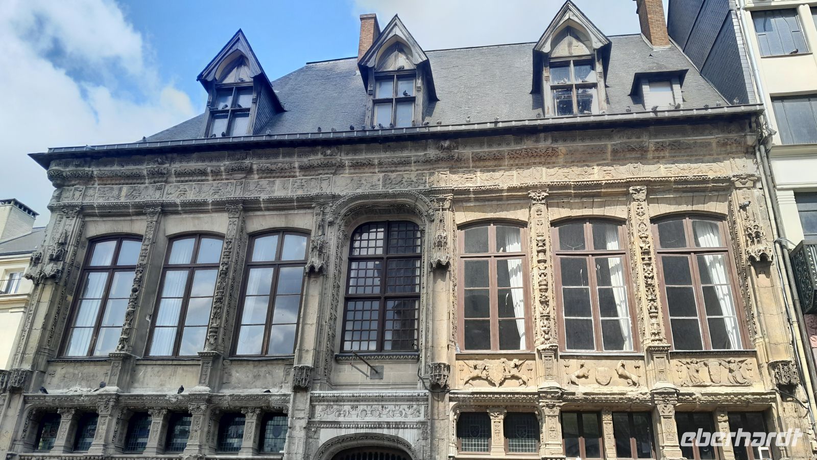 Wir laufen zurück durch die Fußgängerzone bis zum Justizpalast. Es ist ein prachtvoller Bau aus dem 15.Jahrhundert. Ein weiteres Juwel ist die Uhr aus dem 15. Jahrhundert die von den reichen Wollwebern gestiftet wurde. Schließlich kommen wir am Place du Vieux Marché an auf dem, umrahmt von zahlreichen Fachwerkhäusern, die Hinrichtungsstätte von Jeanne d'Arc durch ein hohes Kreuz markiert ist. Die neue Kirche aus den 70er Jahren des 20.Jahrhunderts hat leider zu.