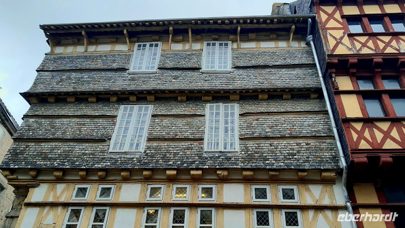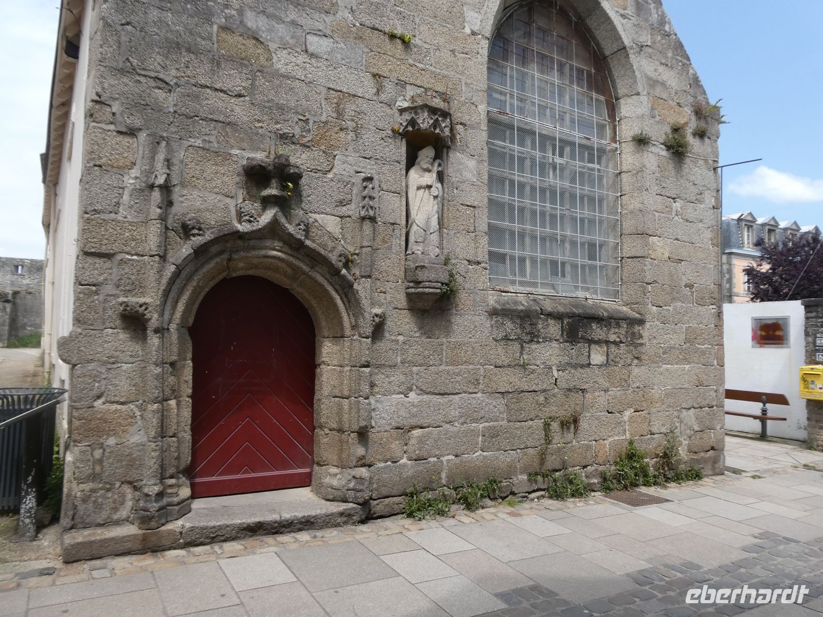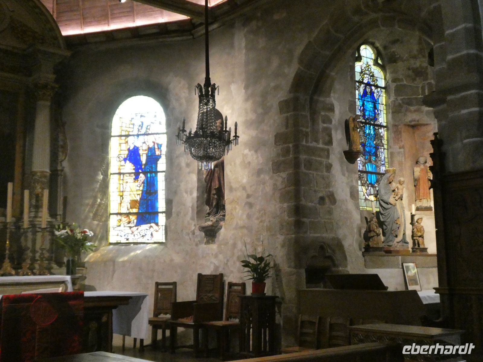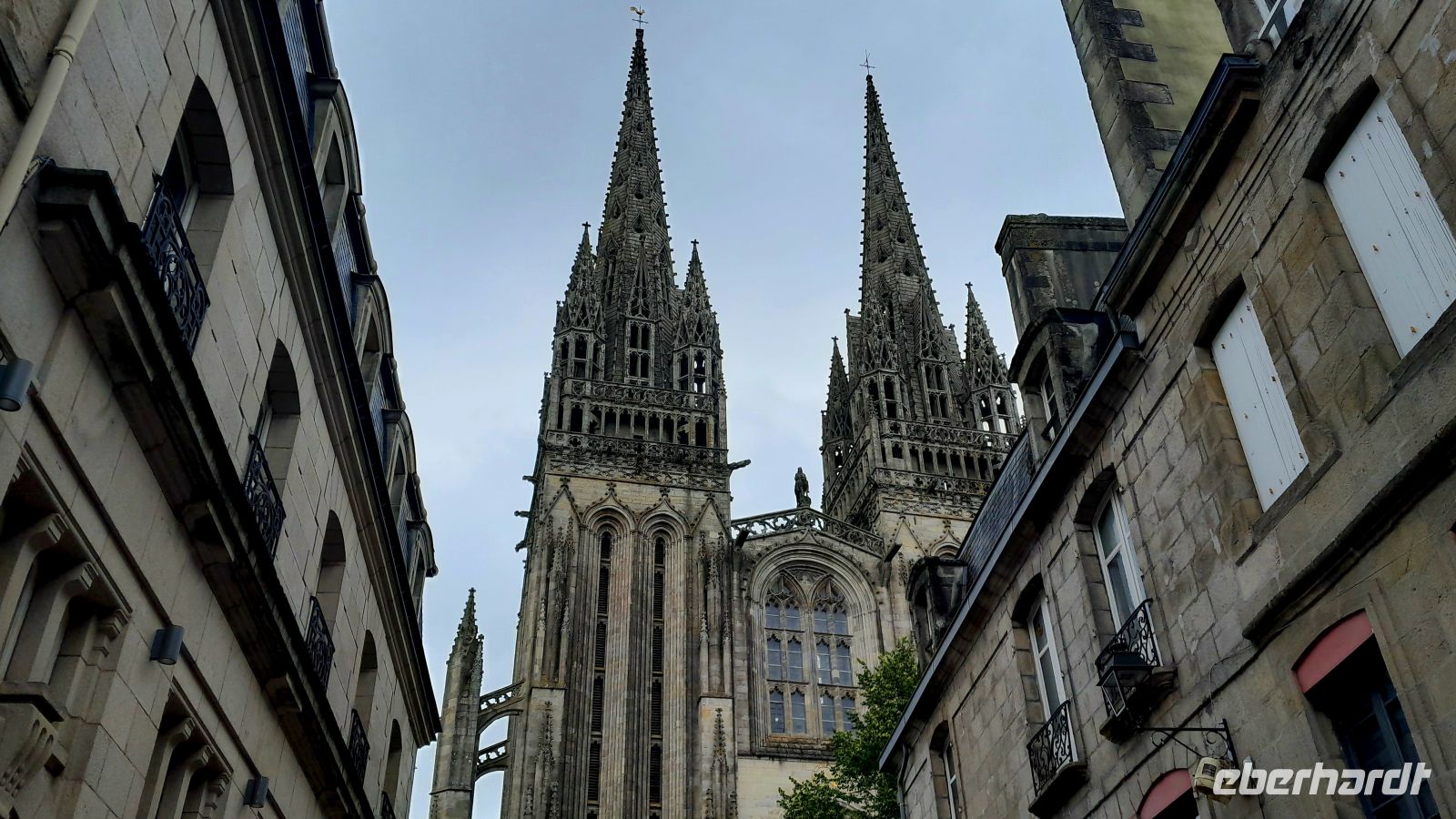 Also beeilen wir uns nach Quimper zu kommen. Dort begeben wir uns gleich zur Kathedrale welche einer der größten der Bretagne ist. Zwischen den beiden Türmen sitzt Gradlon auf seinem Pferd und grüßt von oben. Natürlich ist er aus Stein. Das Besondere an dem Gebäude ist auch das abgeknickte Mittelschiff, was wohl dem Gelände am Fluss Odet geschuldet ist.