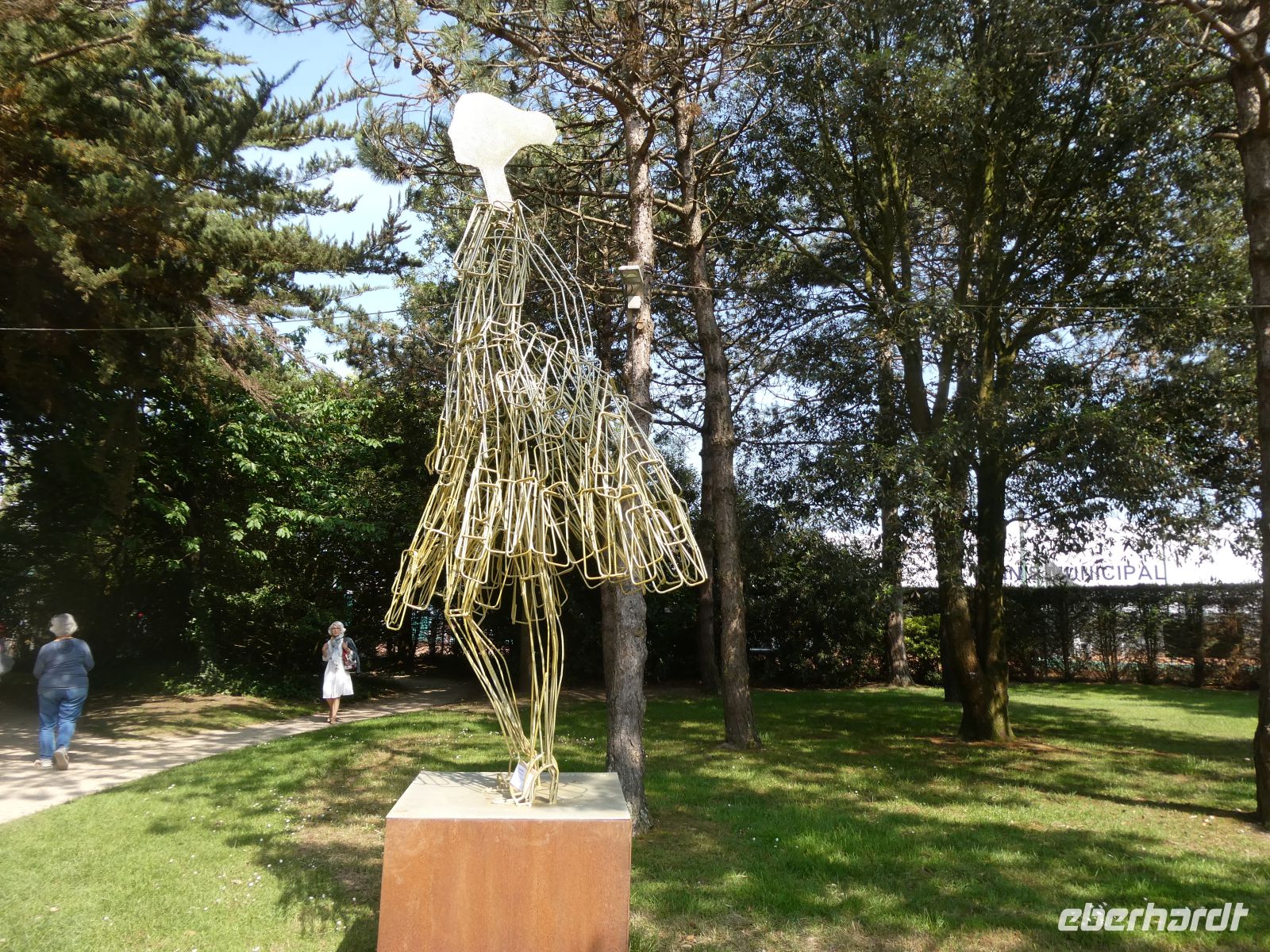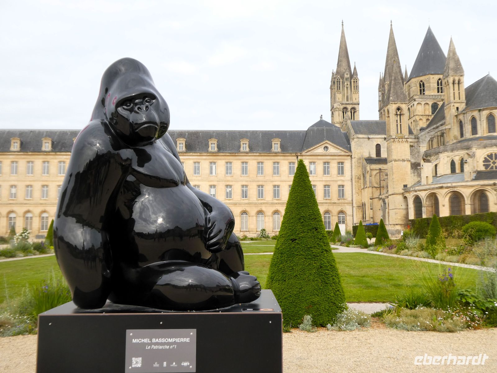 Auch haben wir von hier oben einen Weitblick und können schon unser nächstes Ziel von Weitem entdecken: die Abbaye-aux-Hommes welche zusammen mit der Abbaye-aux-Dames Heinrich errichten ließ um die Kirche wegen seiner Heirat einer nahen Verwandten gewogen zu stimmen. Wir spazieren durch die heute am Pfingstmontag ruhige Fußgängerzone in Richtung Abteikirche St.Étienne. Bald erreichen wir das imposante Rathaus mit einer interessanten Kunstausstellung im Garten vor dem Gebäude. Uns beeindruckt vor allem der gelungene "Silberrücken". Was meint man wohl mit dem Gorilla vor dem Rathaus?