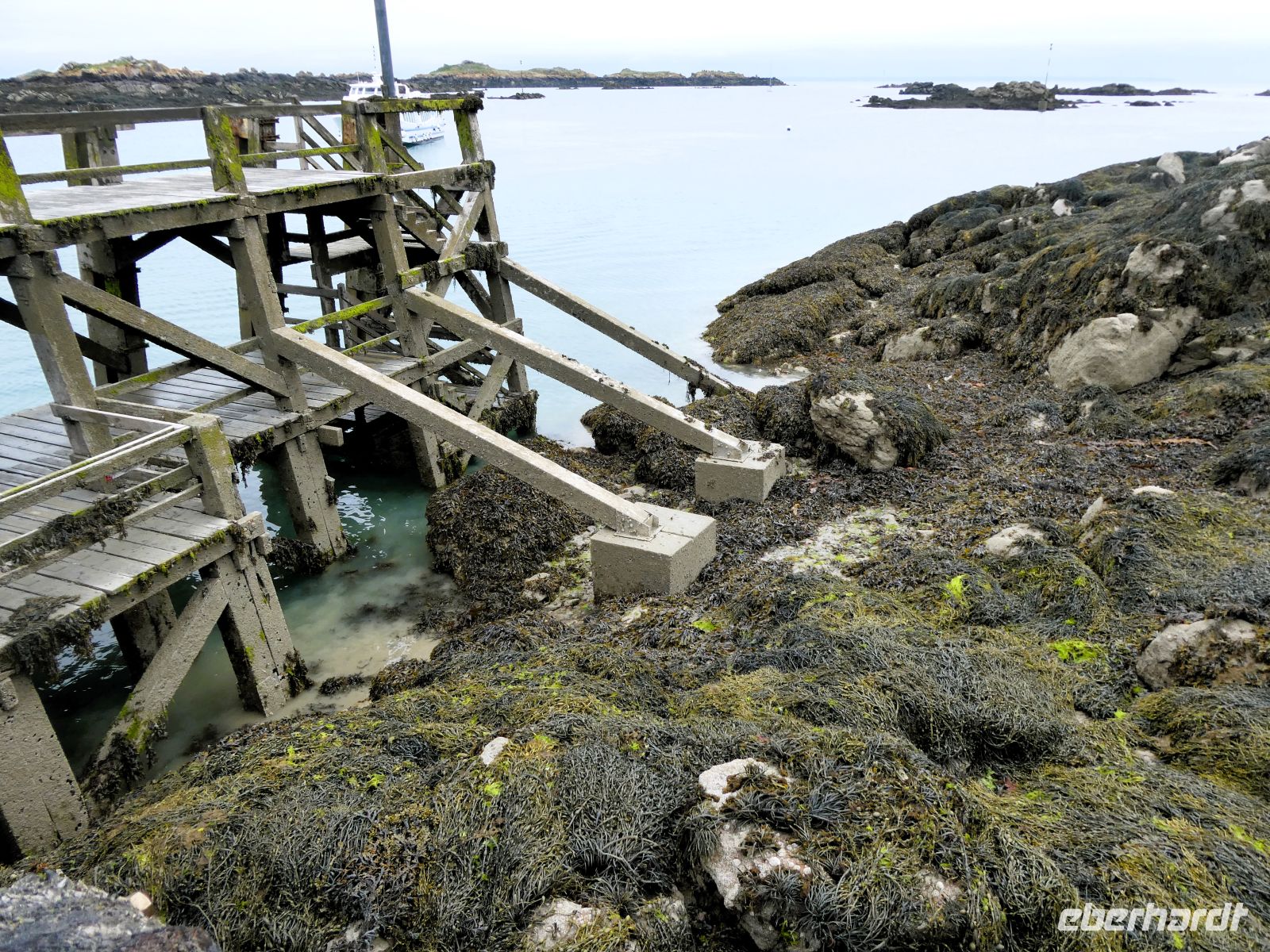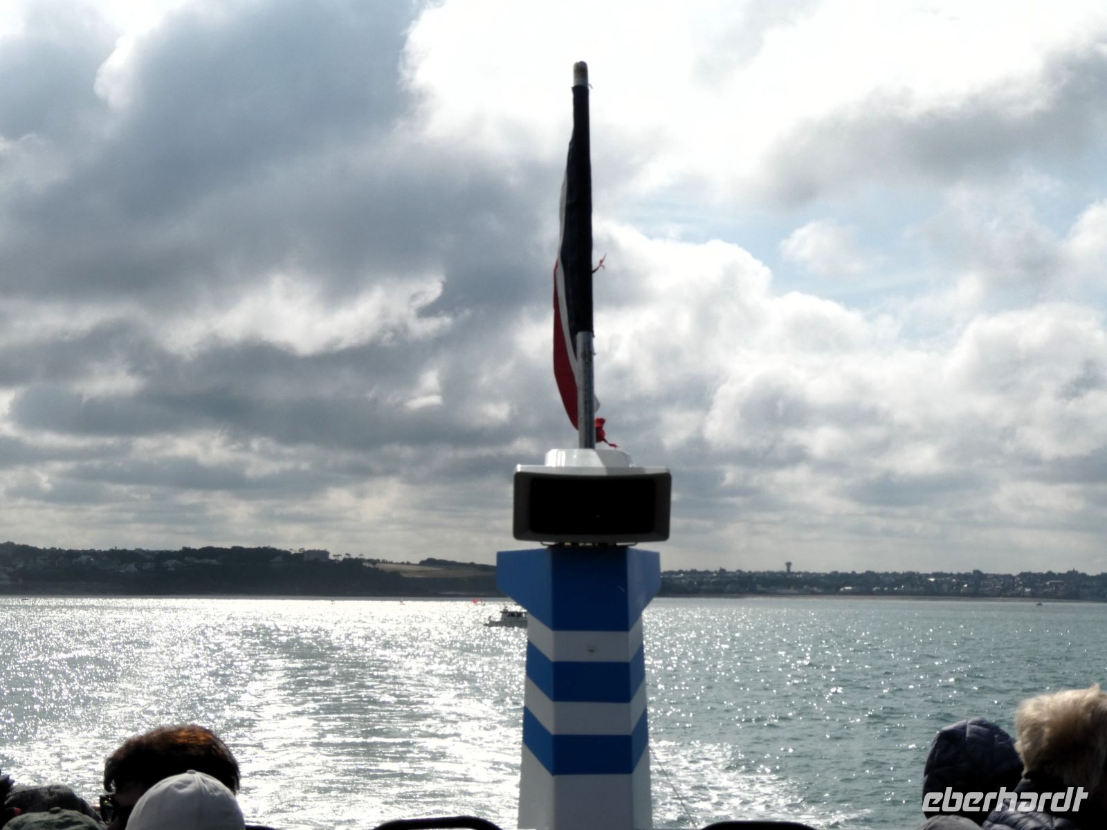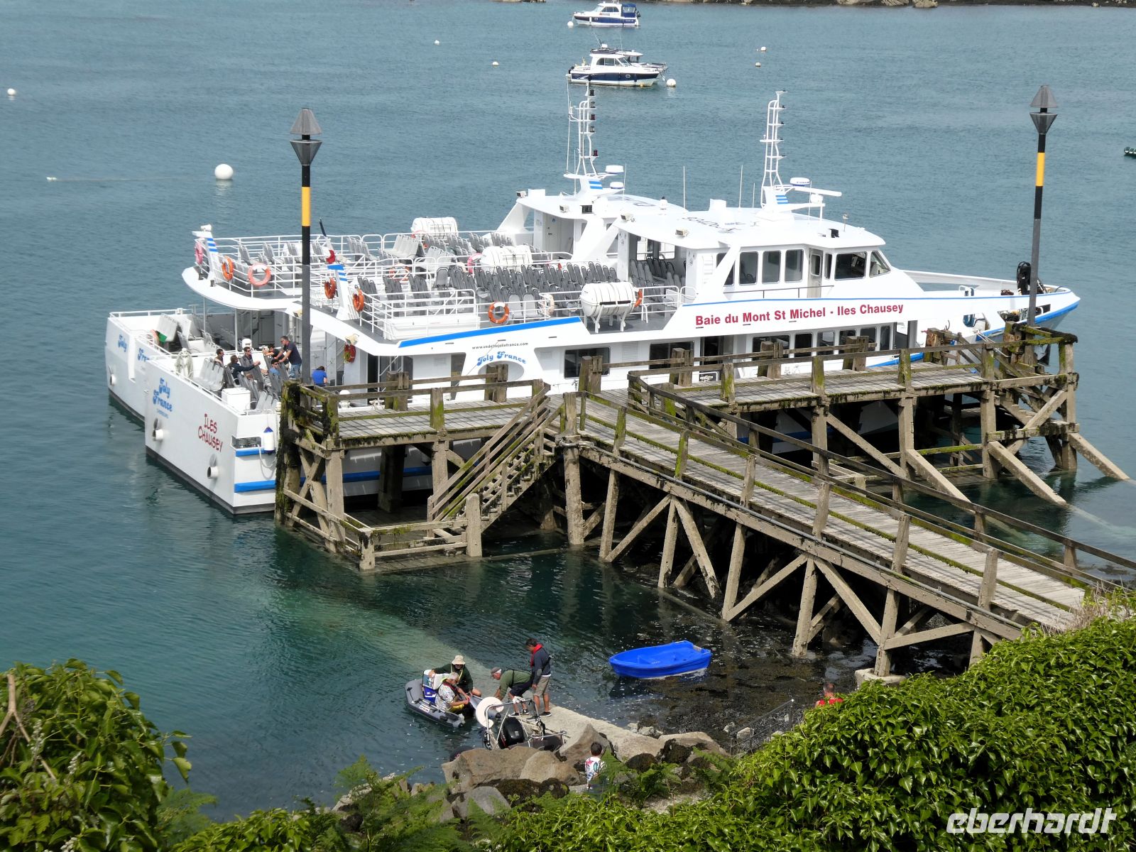 Der größte Teil unserer Gruppe trifft sich zur angekündigten Schiffsexkursion durch den Chausey-Archipel wieder. Inzwischen ist auch der Wasserspiegel gewaltig gesunken und wir steigen vom Kai eine Etage tiefer in dasselbe Schiff welches uns hergerichtet hat.