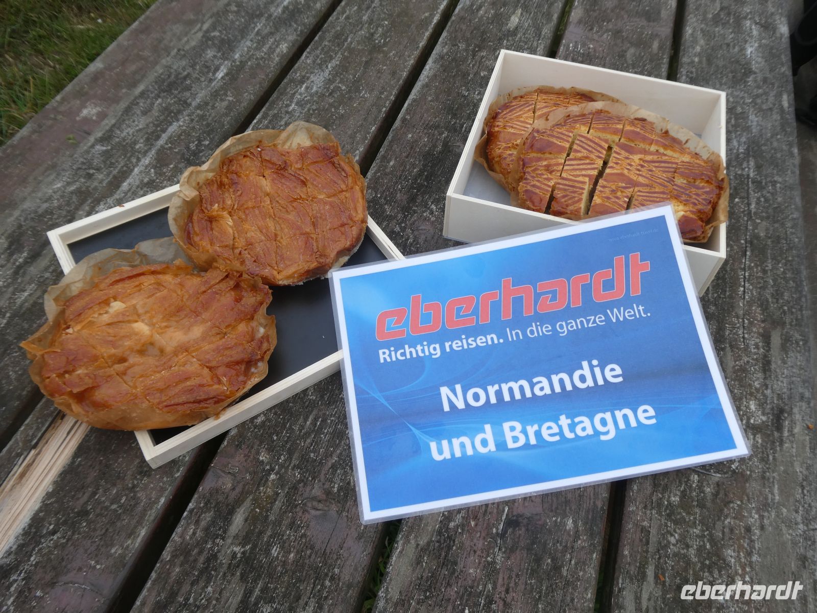 Dor wartet nach unserem Spaziergang eine süße Überraschung auf uns: 2 Sorten verschiedener bretonischer Kuchen: der sehr gehaltvolle Kouign Amann und eine etwas trockenere Variante.