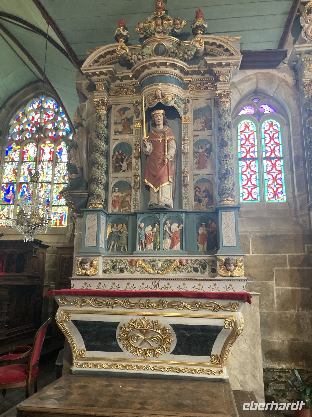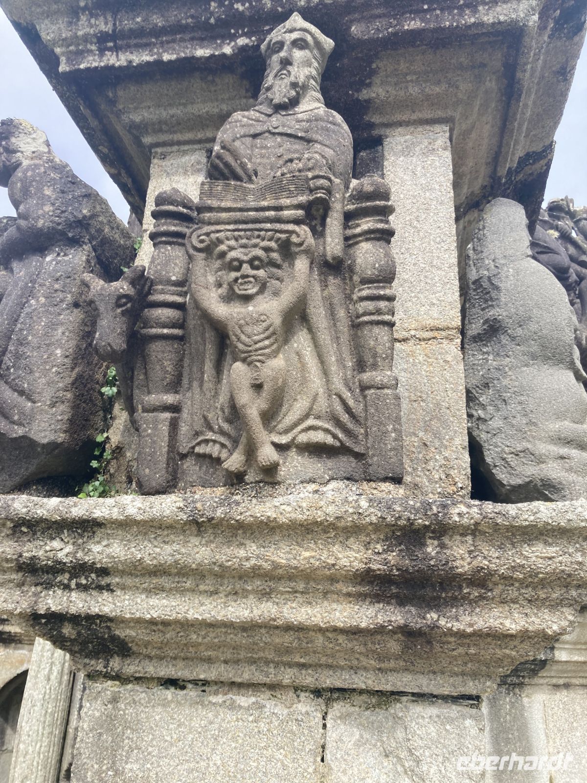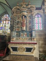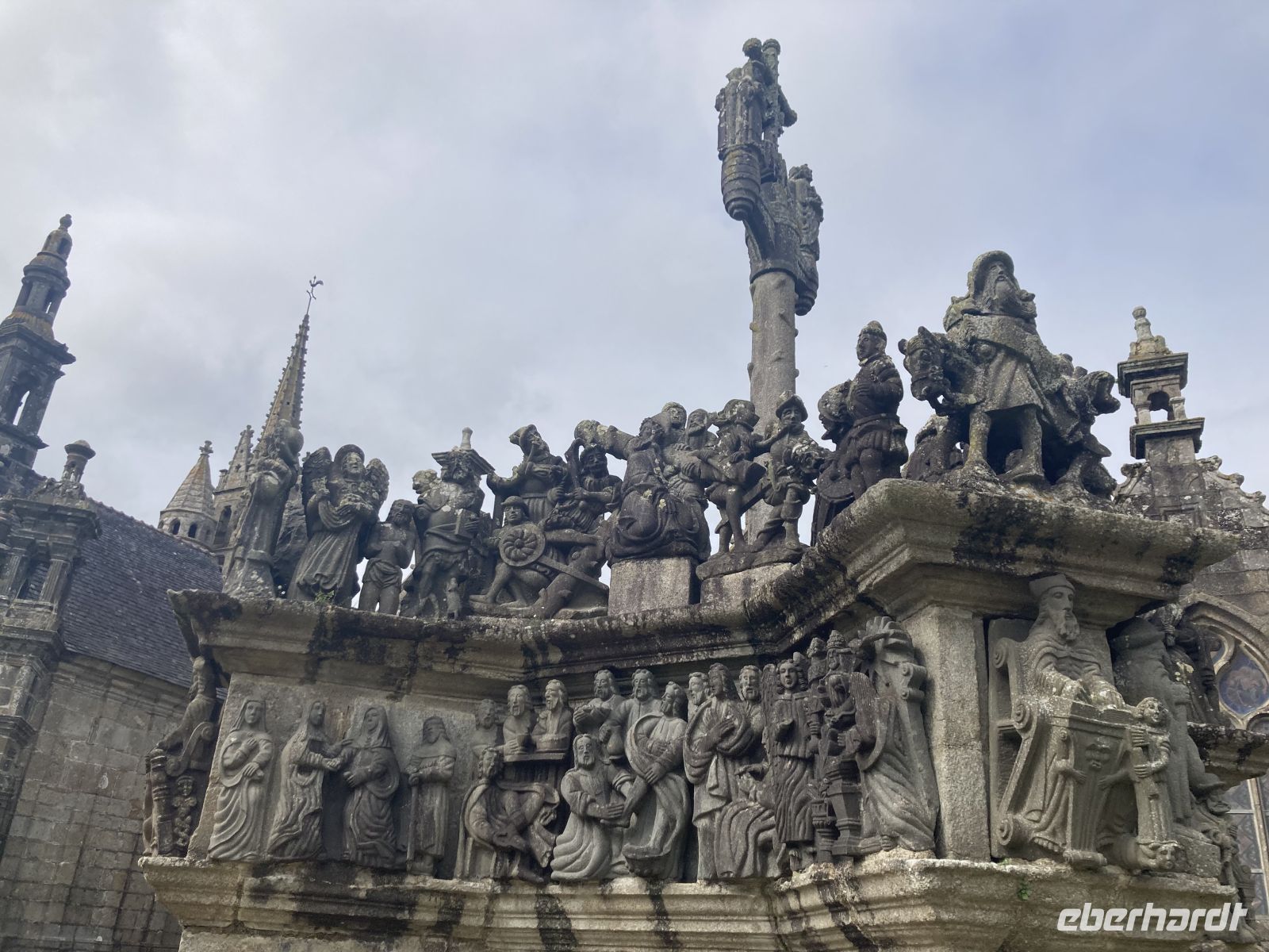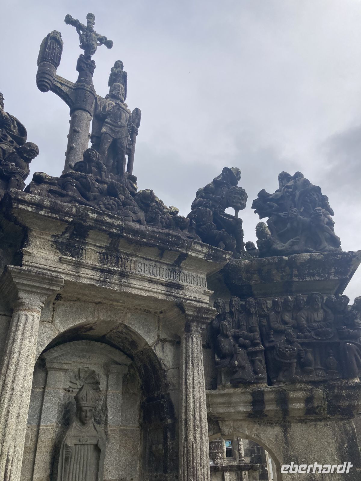 Am Nachmittag erleben wir dann etwas, was es nur in der Bretagne gibt. Wir fahren ins Dorf Guimiliau und schauen uns den dortigen "Enclos paroissial", einen umfriedeten Pfarrhof an, der aus einer Dorfkirche, ummauertem Friedhof mit Triumphtor, einem Beinhaus und einem „Kalvarienberg“ besteht. Vor allem der "Calvaire" gilt als der schönste und aufwendigste in der Bretagne, da über 200 Granitstatuen den Leidensweg Christi illustrieren. Ähnlich wie der Bildschmuck an den Portalen der großen Kathedralen ist auch diese eher bescheidenere künstlerische Darstellung eine sogenannte "Biblia pauperum", die die Geschehnisse der Heiligen Schrift und die Predigten der Priester für das leseunkundige Publikum erläutern soll. Und auch die Kirche, die in manchen Bereichen ziemlich renovierungsbedürftig erscheint, liefert mit gotischen Heiligenfiguren und solchen aus der Renaissance interessante Blickwinkel.