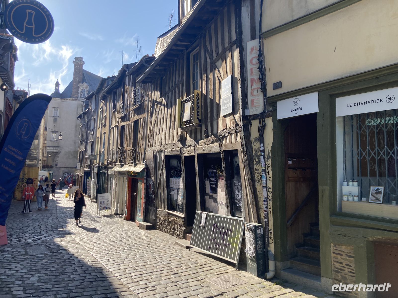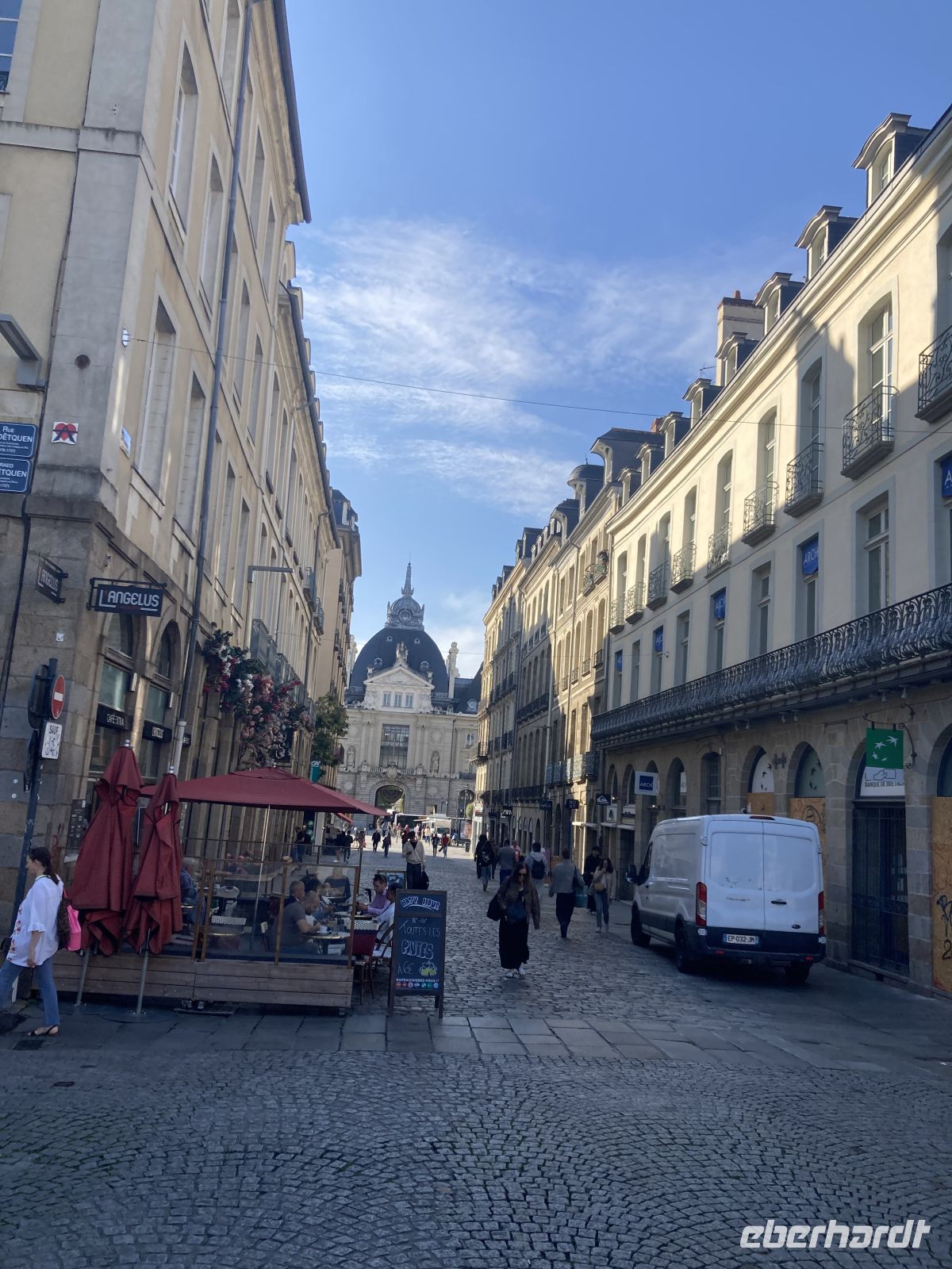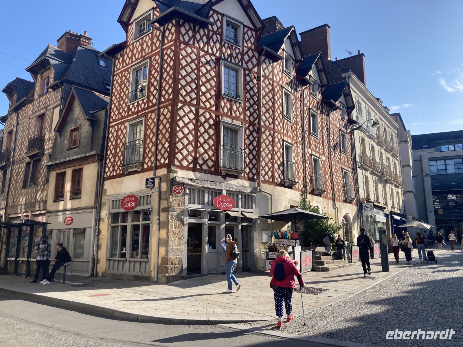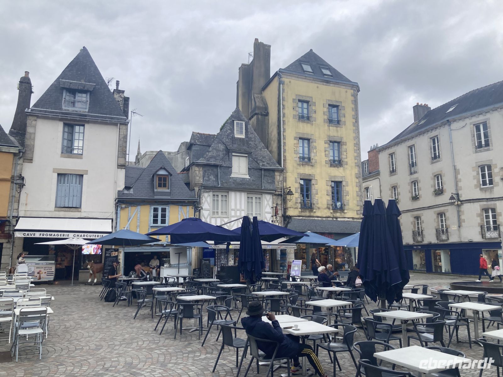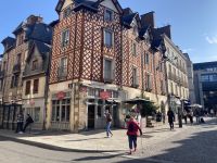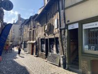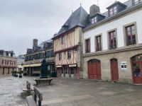 Danach gelangen wir bald in die Hauptstadt der Bretagne, nach Rennes. Am zentralen Parkplatz neben den beiden imposanten Markthallen machen wir Halt, um nach einem kleinen Altstadtspaziergang dort zu Mittag zu essen. Das lässt sich aber nicht realisieren, da die der großen stählernen Markthalle von Paris nachempfundenen Hallen geschlossen sind. So müssen die Gäste Richtung Kathedrale oder gar bis zur lebhaften Einkaufsmeile ausschwärmen, um sich zu verköstigen.