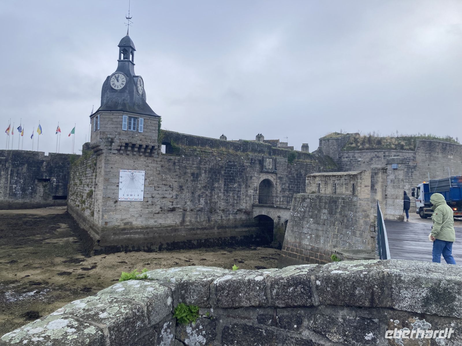 Als wir nach dem Frühstück aus dem Fenster schauen, kann man des milchigen Nebels wegen die gegenüberliegende Straße nicht sehen. Eigentlich wollen wir den westlichsten Punkt der Bretagne besuchen, das nahe gelegene Pointe du Raz, das als eines der unwirtlichsten Kaps gilt. Da dies wenig sinnvoll, sondern eher gefährlich ist, entscheidet sich der Reiseleiter, einige Kilometer mehr in Kauf zu nehmen und zuerst ins malerische Städtchen Concarneau zu fahren. Bekannt durch die Erlebnisse des Kommissars Dupin in seinem Lieblingslokal "L'Amiral" hat sich die Hafenstadt zu einem wahren Tourismusort gemausert. Im Zentrum steht dabei die "Ville Close", die Altstadt, die auf einer Insel liegt und komplett mit einer Stadtmauer umgeben ist. Der Eingang wird durch ein doppeltes Tor geschützt und bald erreichen wir den Hauptplatz St. Guenole, ehe wir im hinteren Teil die Stadtmauer erklimmen und die wahre Größe des Hafens erkennen können. Dann haben alle Zeit, sich eigenständig in diesem kleinen Juwel mit seinen herausgeputzten Geschäften und den einladenden Gastromiebetrieben zu amüsieren.
