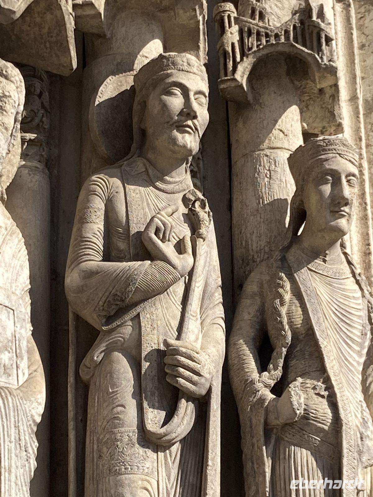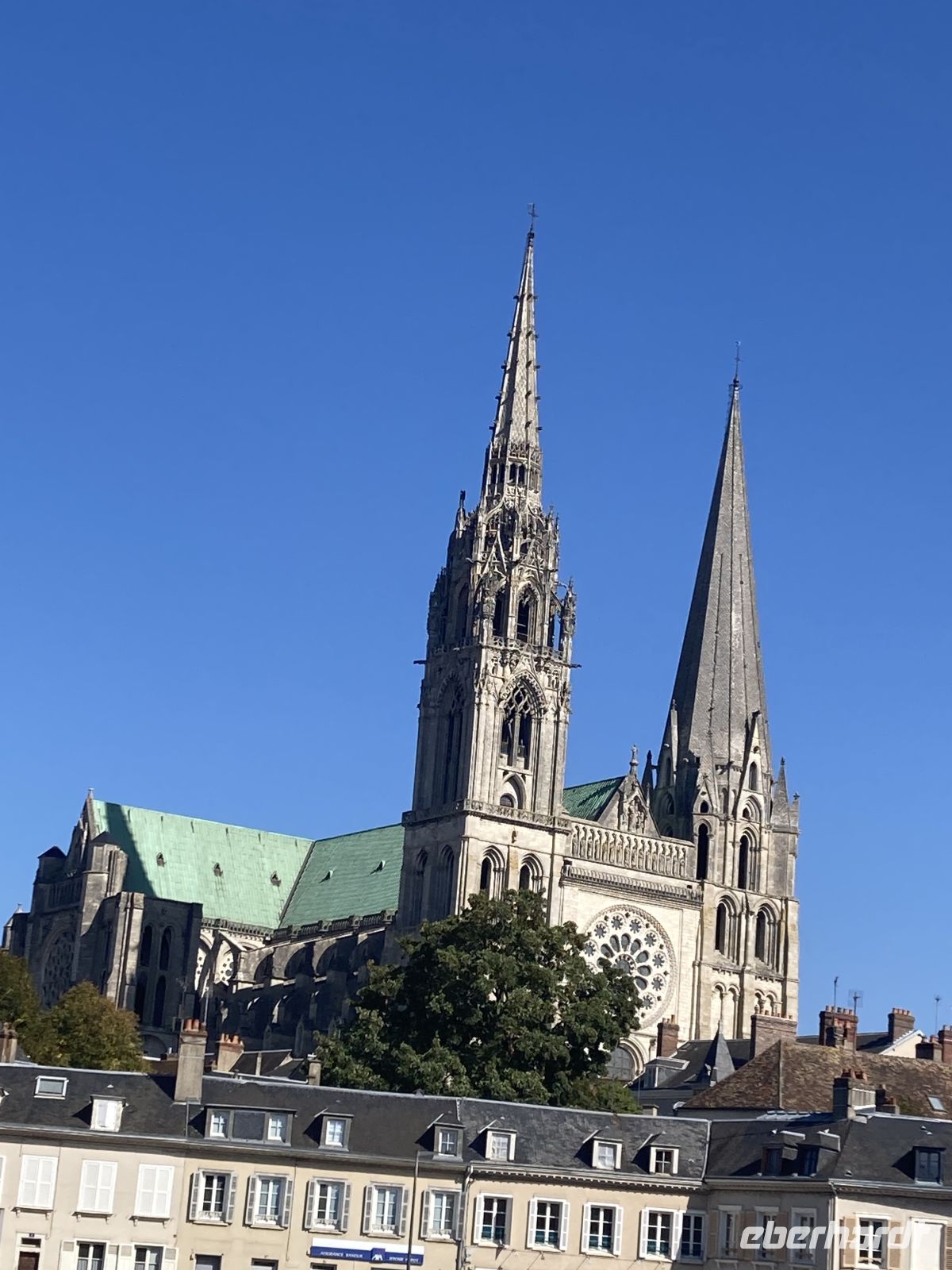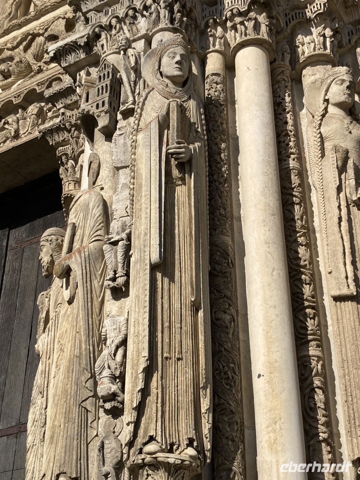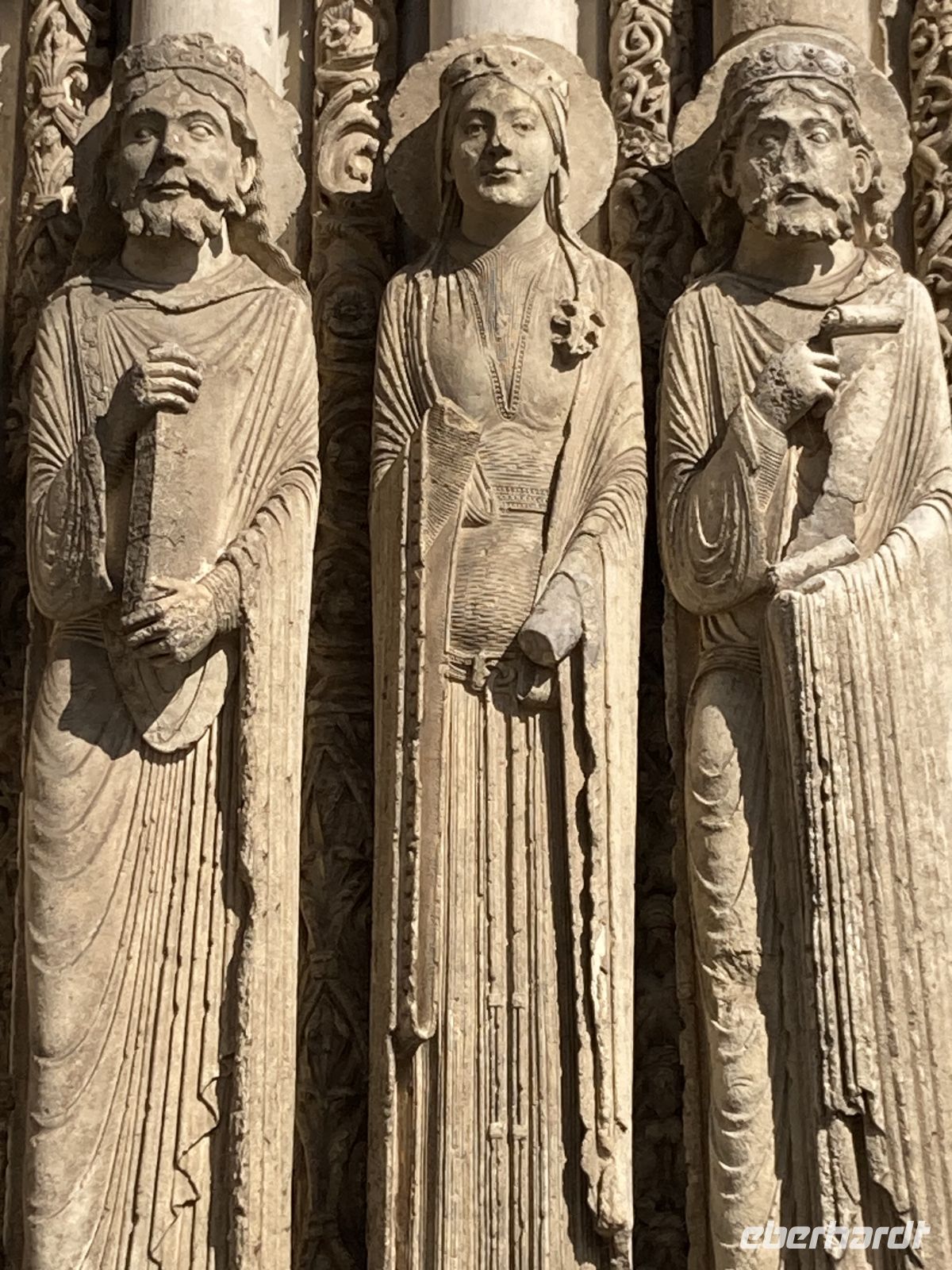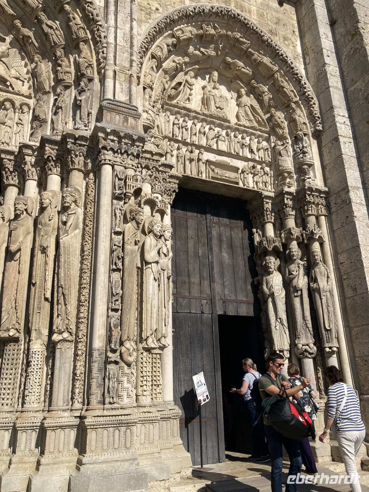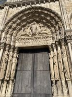 Und dann erfährt unsere Reise einen letzten Höhepunkt in dem kleinen Städtchen Chartres, das die wohl berühmteste gotische Kathedralen der Christenheit beherbergt, die schon 1979 zum UNESCO-Weltkulturerbe erklärt wurde. Durch mehreren Jahrhunderte hindurch wurde auf immer wieder zerstörten Kirchen um 1200 eine gotische Kathedrale errichtet, die schon nach kurzer Bauzeit 1260 vollendet wurde. Bei genauerem Betrachten lassen sich unterschiedliche Bauphasen an den zwei Türmen und den weltberühmten Figuren des mittleren Eingangsportals erkennen. Diese königlichen, überschlanken Statuen, die quasi säulenhaft in die architektonische Gestaltung des Portals mit einbezogen sind, gaben dem mittelalterlichen Menschen ein Gefühl der Sicherheit, die mit der Warnung vor der Hölle bei früheren Portalskulpturen nichts mehr gemein hat. Auch die Innenansicht der Kathedrale ist phänomenal: Durch den Wegfall der Empore wirkt das 36m hohe Gebäude noch erhabener und durch das „Blau von Chartres“ in den originalen mittelalterlichen 176 Glasfenstern wird das Licht in der Kirche magisch und überwältigend. Auffallend ist auch das in den Fußboden eingearbeitete Labyrinth, das im Gegensatz zu früher nun eine immerwährende, zentrale, von den Gläubigen oft genutzte Möglichkeit zur inneren Einkehr bietet.