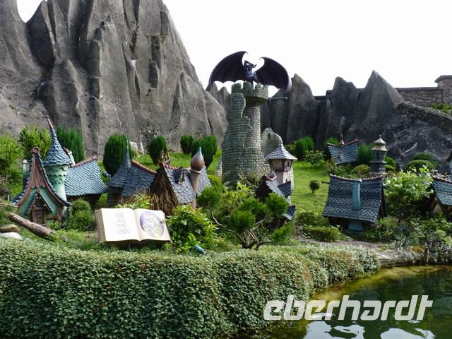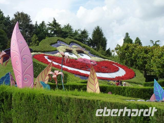 Dann ging es endlich auf Entdeckungsreise. Schon am Eingang bekamen manche Kids kugelrunde Augen. Hier werden Kinderträume war. Beliebte Disneyfiguren in Blumenkulissen begrüßten uns in der gesamten Anlage.