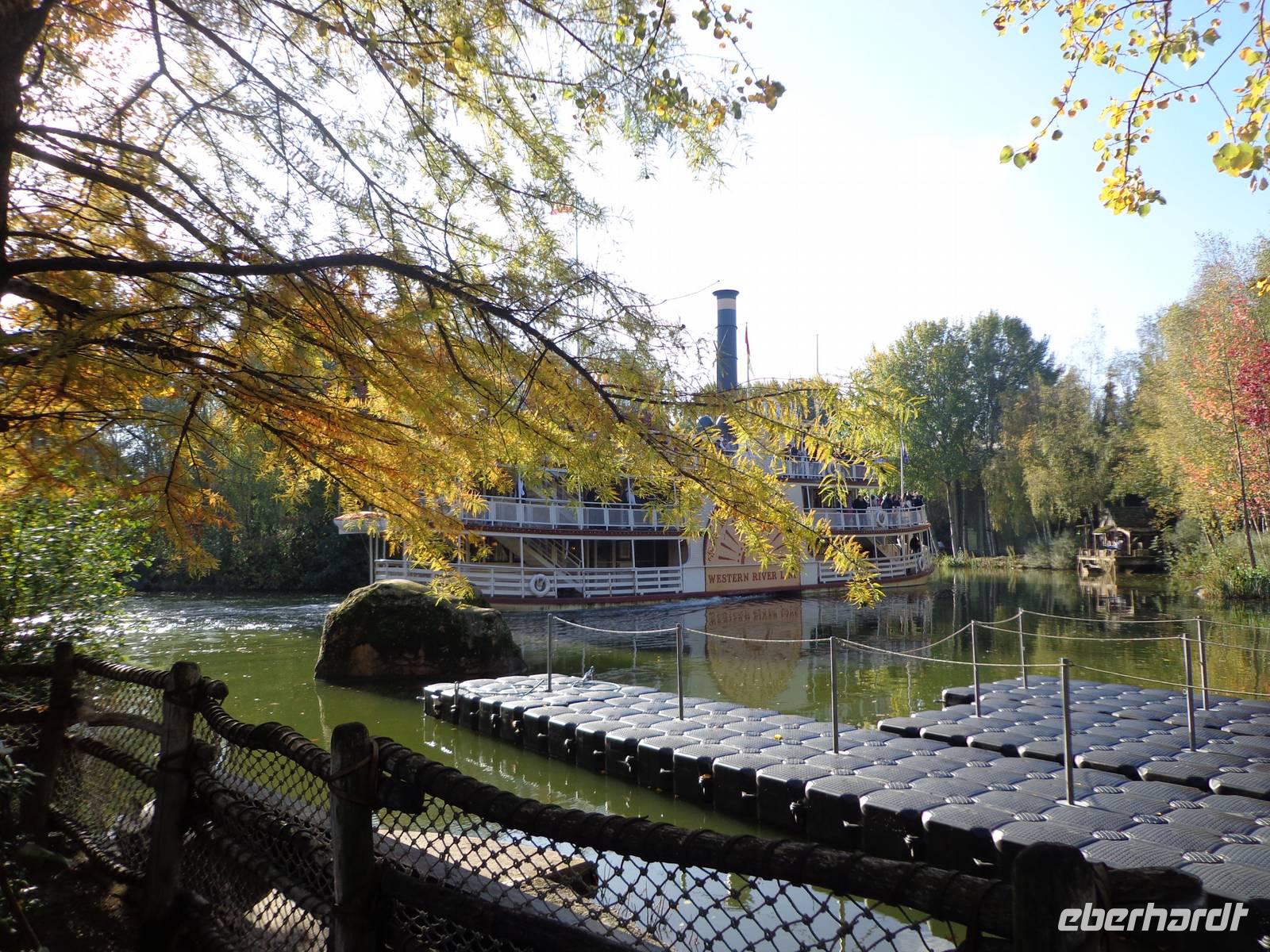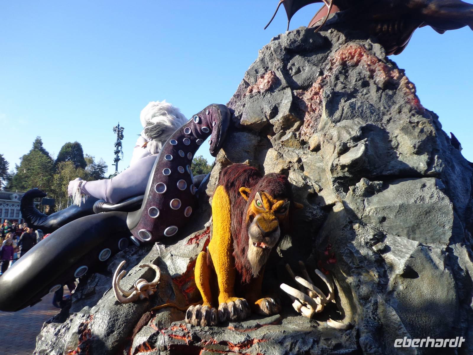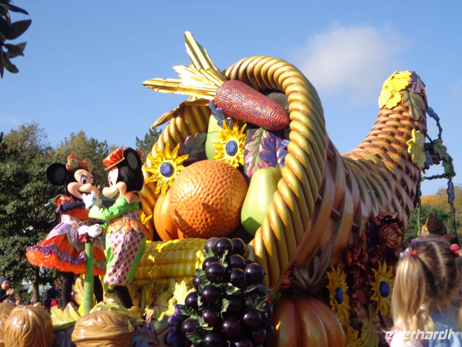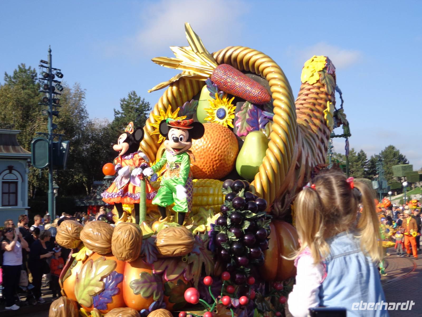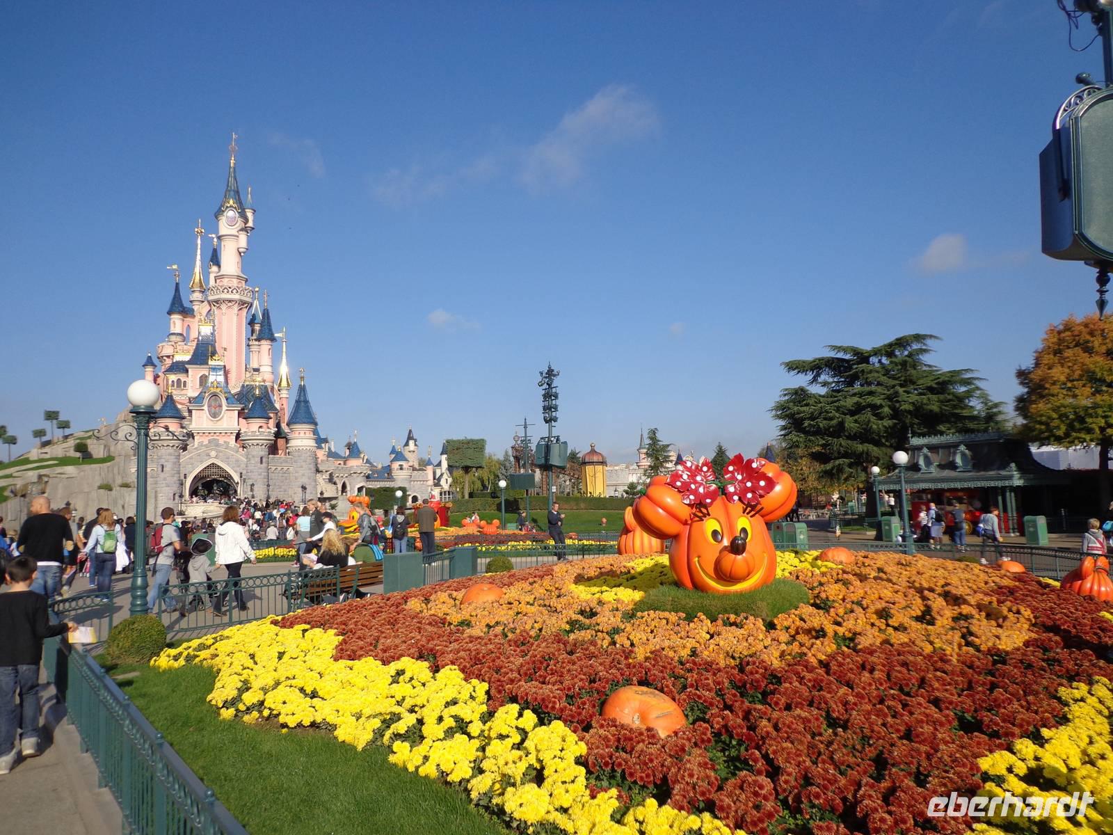 Und dann ging es hinein. Märchen, Trick, Animation, Filmkulissen, ein Schloss, viel Grün, alte Autos, Züge und Bahnen, dazu am Morgen noch nicht zu viel Andrang, Geschäfte mit bunten Auslagen, Restaurants und Imbissstände, Shows und vor allem viel Spaß erlebten wir an diesem ersten Tag. Der gesamte Park war für Halloween bzw. für den Erntedank geschmückt und mehrere Paraden erfolgten bereits am tage. Manch einer fuhr mit einem Mississippidampfer, andere starteten zum Mond oder jagten mit der gigantischen Achterbahn zwischen den Felsen hindurch und wieder andere schauten hinter die Kulissen eines Filmdrehs.