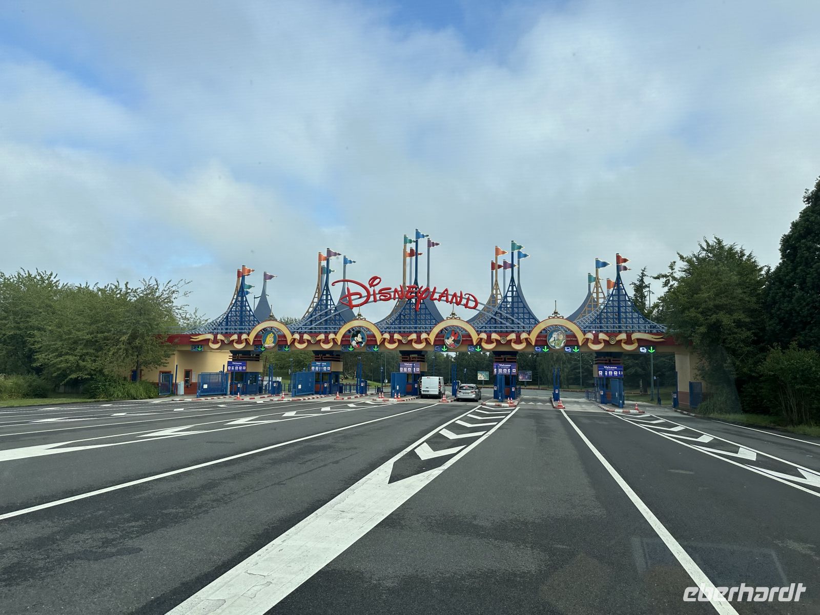Der Park öffnet um 09.30 Uhr. Es gibt schon einige Besucher, die darauf warten, eingelassen zu werden. Mit einem wachen Auge gelingt es, eine Warteschlange zu finden, an der es schnell und zügig in den Park geht. Vor dem Eingang gibt es eine Taschenkontrolle. Glasflaschen, Alkohol und Selfiesticks sind verboten. Auch wenn man etwas davon versehentlich oder unwissend dabei hat: sag Auf Nimmerwiedersehen, es landet im Mülleimer. Am Eingang werden nun die Eintrittskarten gescannt, wenn man sein Ticket hinterlegt hat, mit dem Handy, ansonsten mit den Papiertickets. Wir folgen dem Besucherstrom und gelangen durch das Disneyland Hotel auf die Mainstreet, die direkt zum zentralen Platz führt. Um diesen herum befinden sich die einzelnen Abschnitte des Parks mit ihren Attraktionen, Restaurants und Souvenirläden.