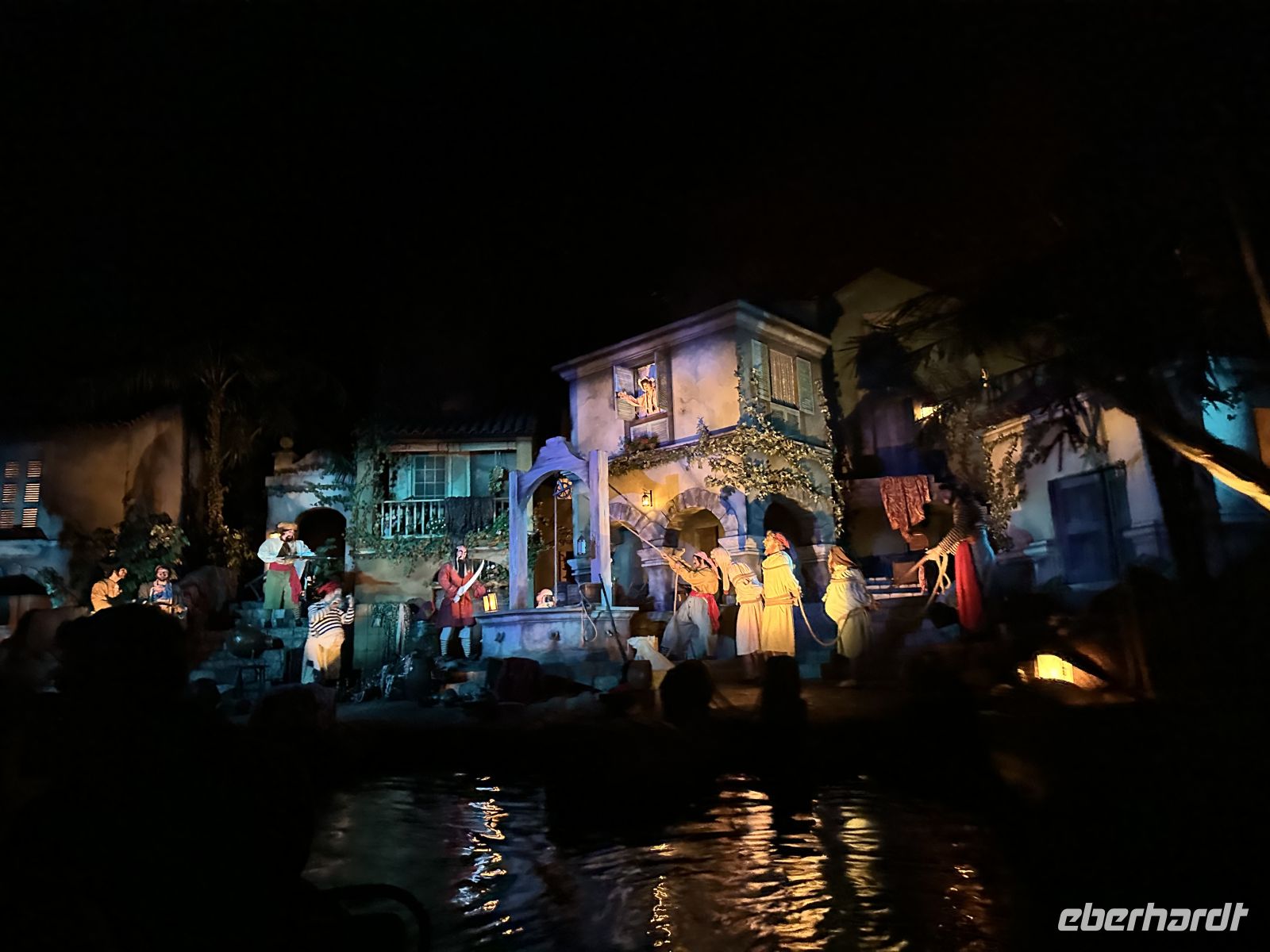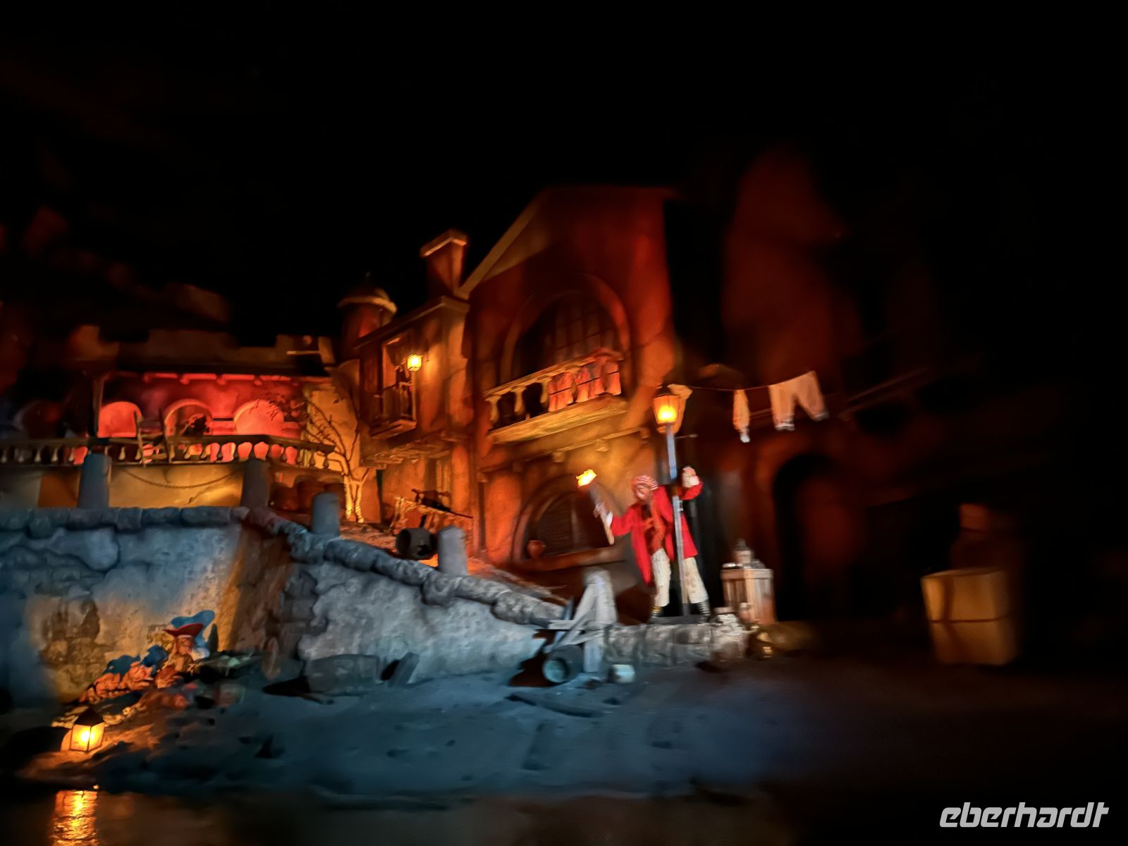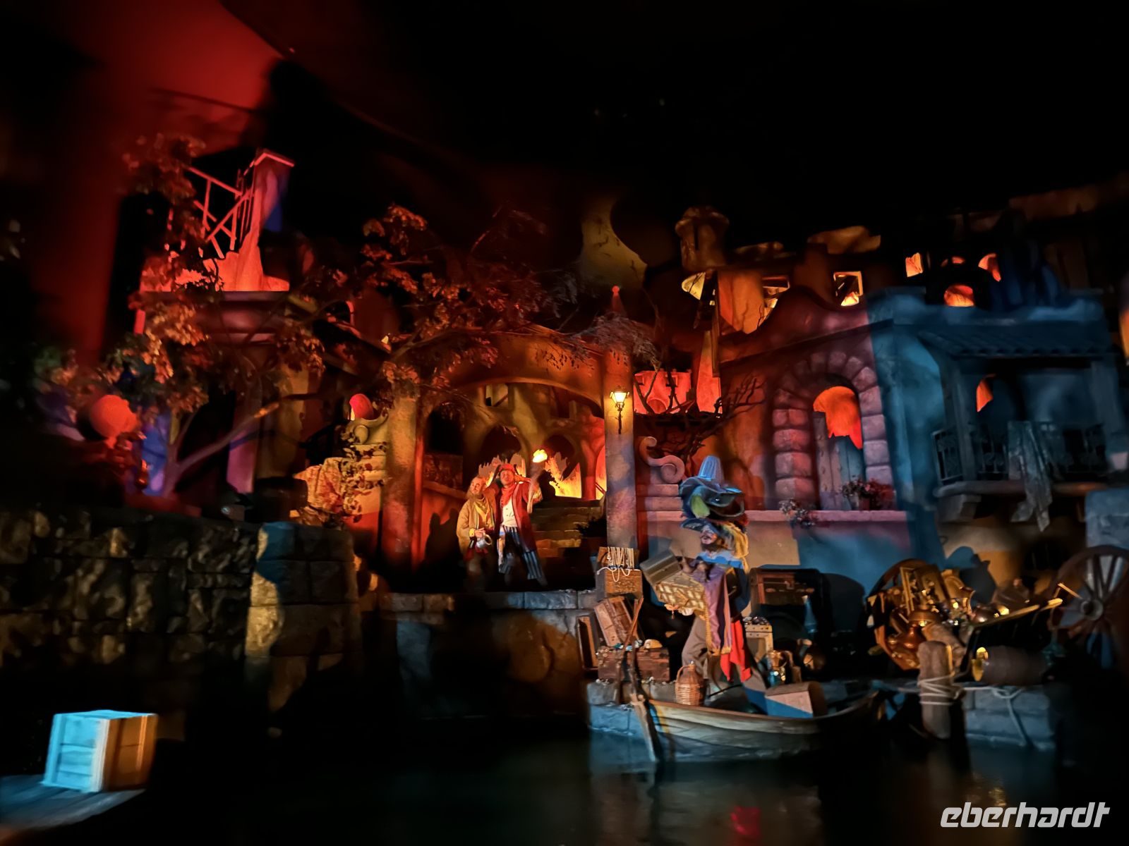 Am Morgen besuchen wir als Erstes das Adventureland. Noch ist es ruhig hier und wir haben bei den „Piraten der Karibik“ nur fünf Minuten Wartezeit. Wir müssen durch einen finsteren Gang laufen bis wir die Abfahrtsstelle der Boote erreichen, in eines davon steigen wir gleich ein. Die Fahrt beginnt in einer mysteriösen, von Piraten besiedelten Lagune, die an eine Karibikinsel erinnert. Unterwegs begegnen wir Skeletten und Geistern, die die Schätze bewachen, die sie zu Lebzeiten geraubt haben. Es ist eher amüsant als gruselig und gefällt uns gut. Als unser Boot in die Mitte einer großen Seeschlacht zwischen einer Festung und einem Piratenschiff gerät, gibt es Kanonendonner, Lichtblitze und das Chaos einer Schlacht. Anschließend fahren wir durch eine von Piraten geplünderte Stadt. Wir sehen Figuren, die sich betrinken, Feuer legen und um die Beute streiten. Ein Höhepunkt ist die Szene mit Gefangenen, die versuchen, einen Hund mit den Gefängnisschlüsseln anzulocken, es sieht wirklich alles echt aus. An einer anderen Stelle sitzt Captain Jack Sparrow auf einem Berg von Schätzen und lässt es sich gut gehen. Wir sind beeindruckt von den tollen Kulissen den vielen beweglichen Figuren, den spannenden und lustigen Szenen, die von einer bekannten Melodie begleitet werden. Uns gefällt es auch, dass die Fahrt etwa zehn Minuten dauert und damit im Vergleich zu anderen recht lang ist.