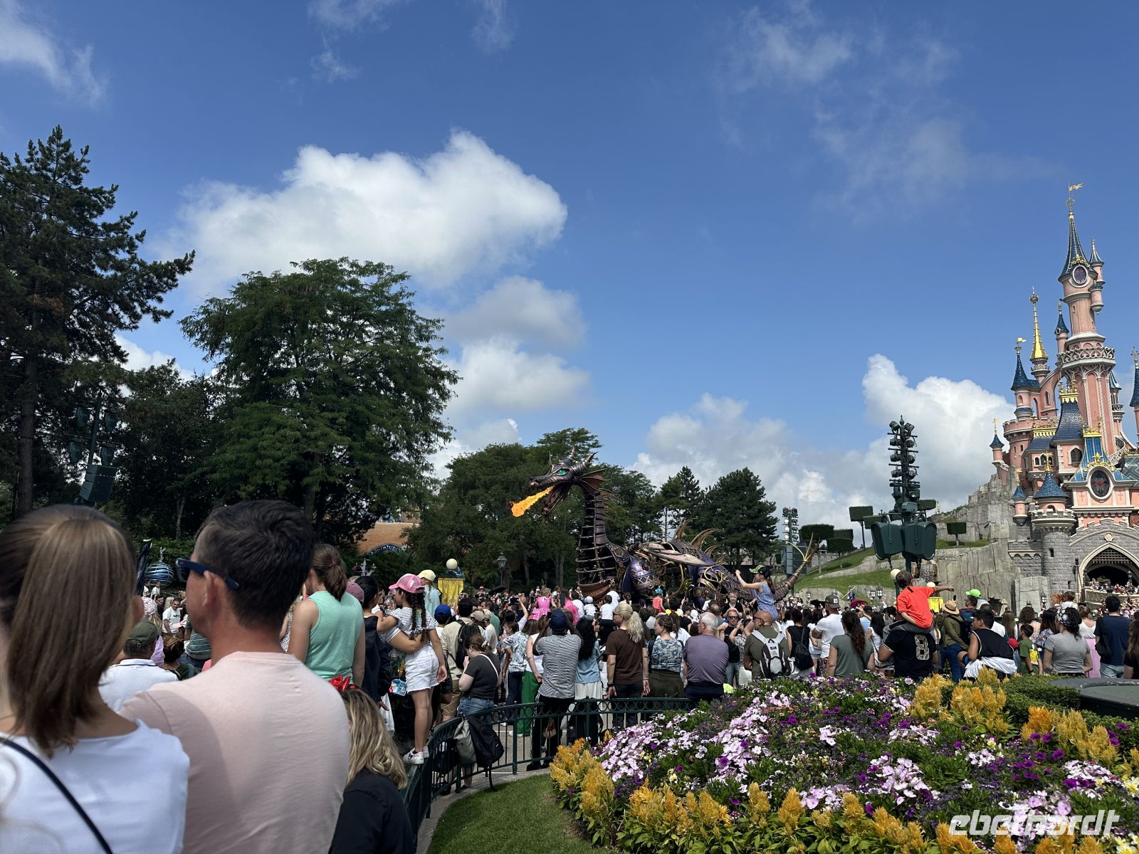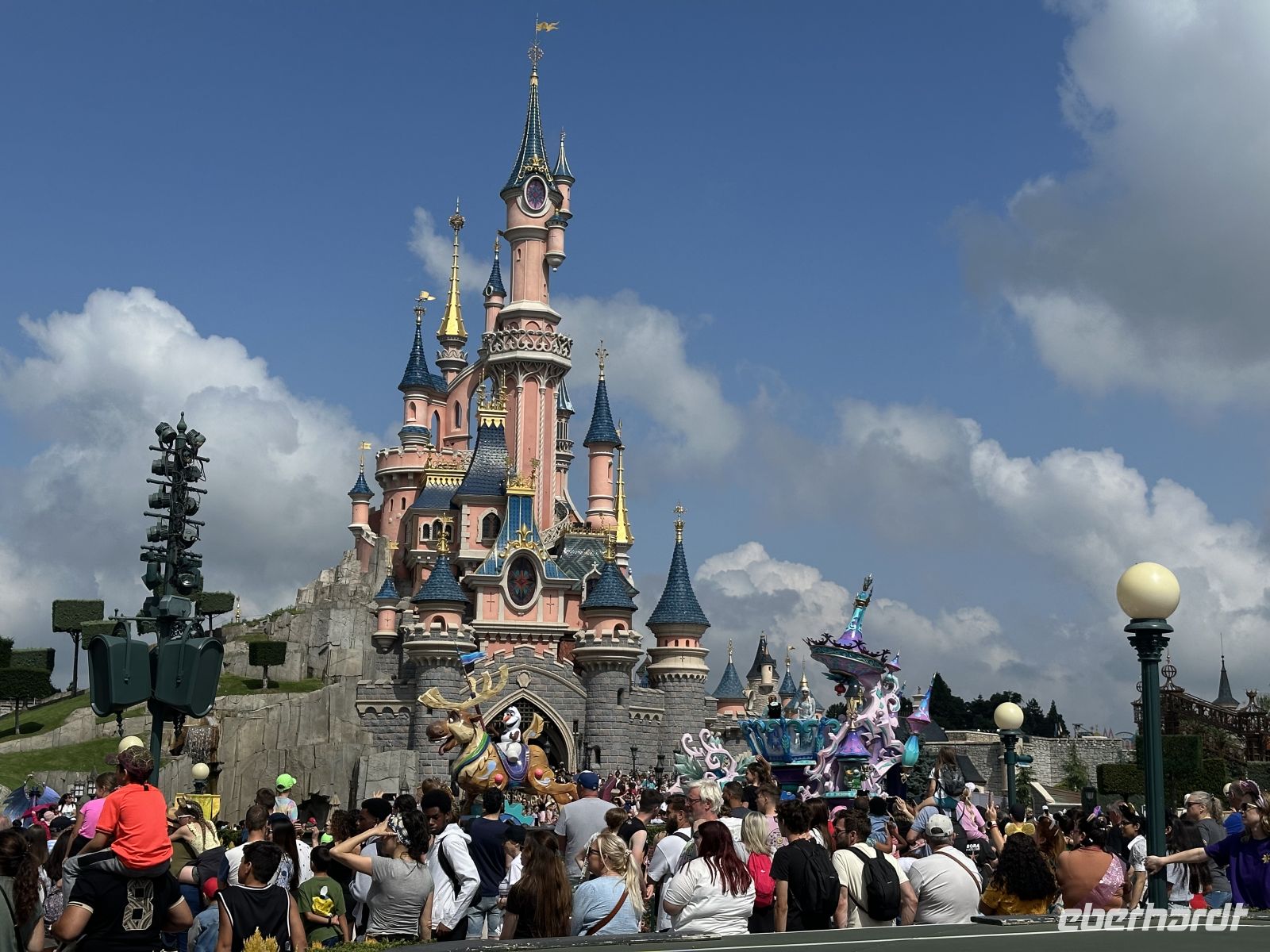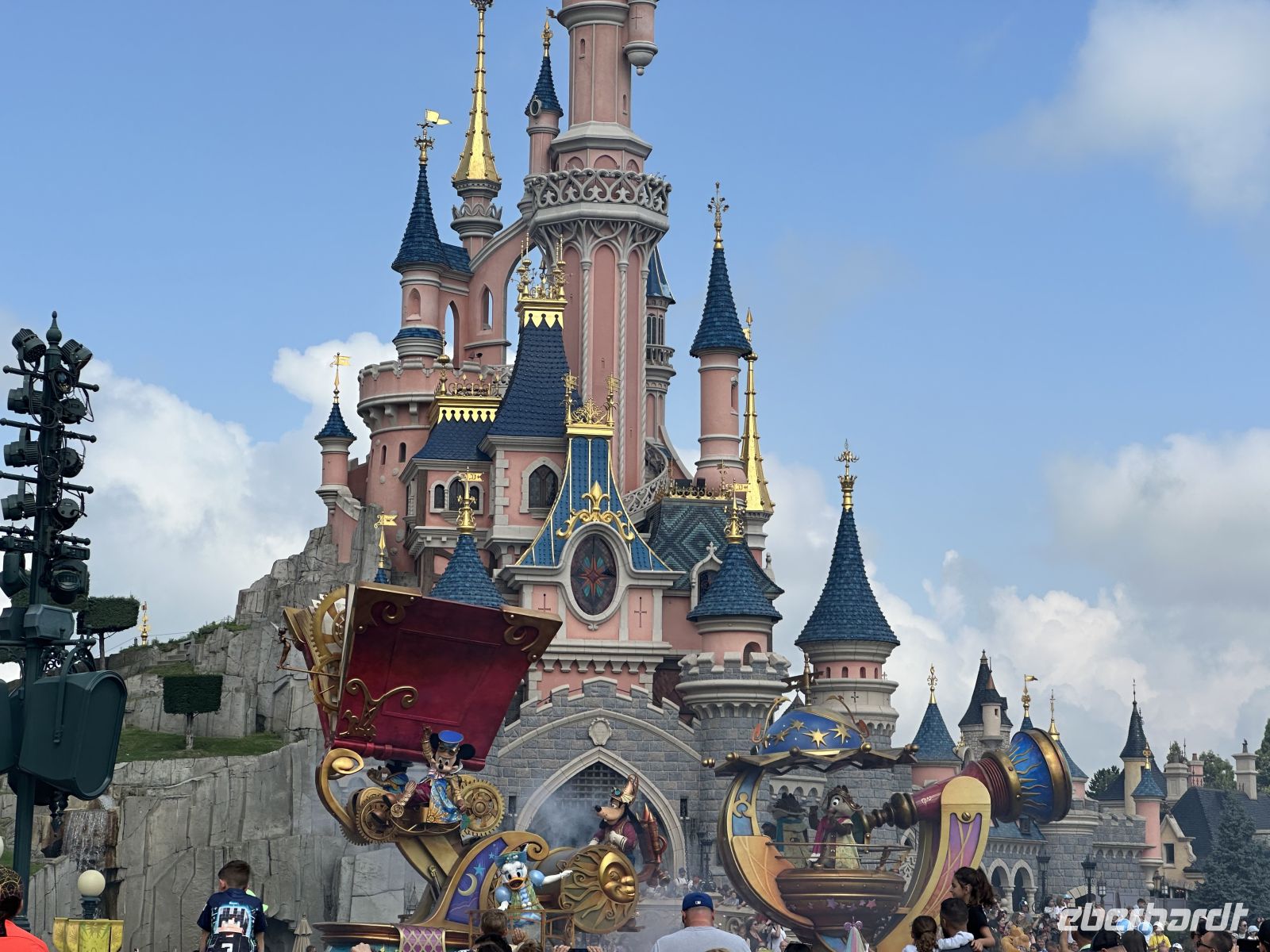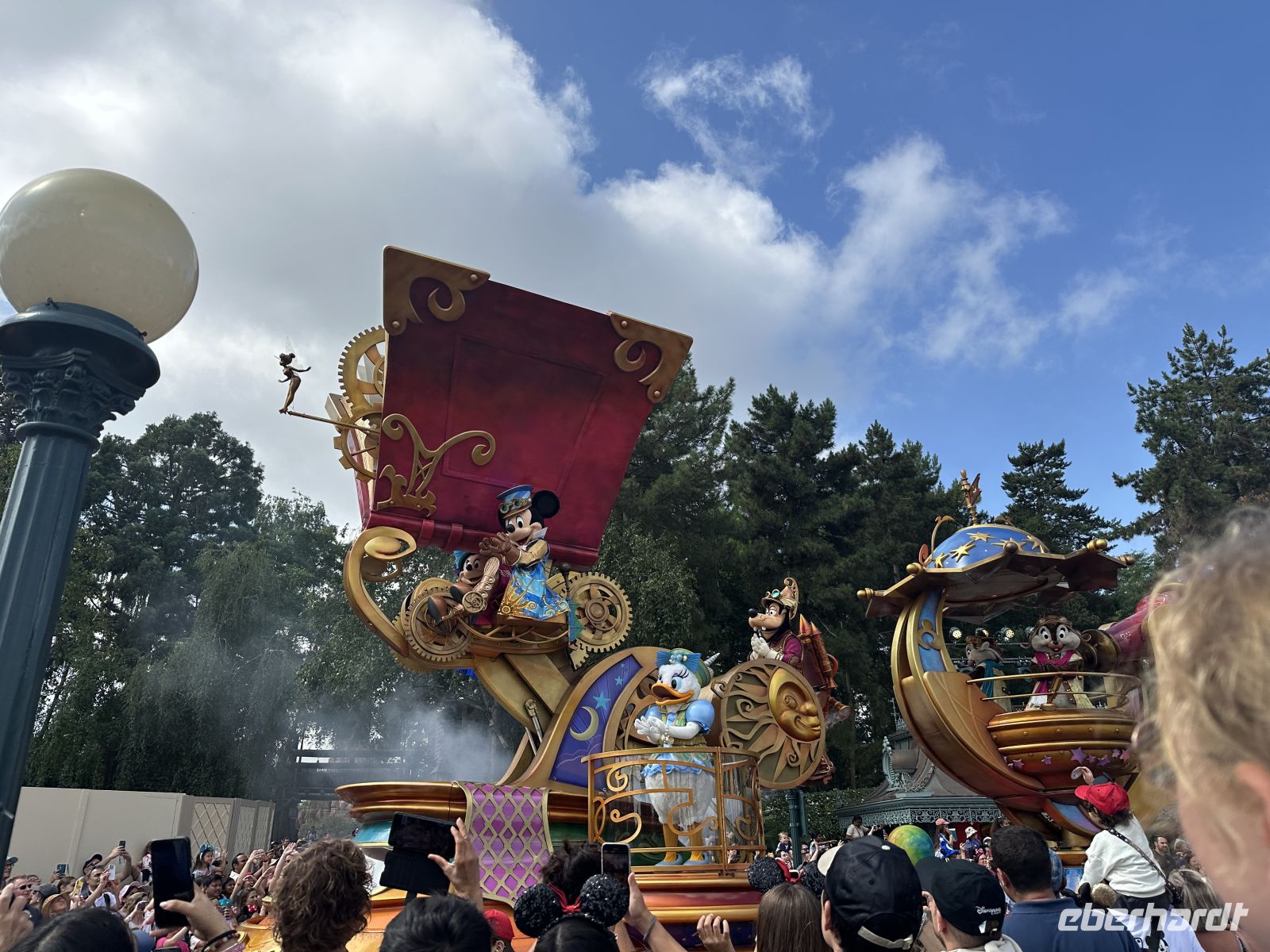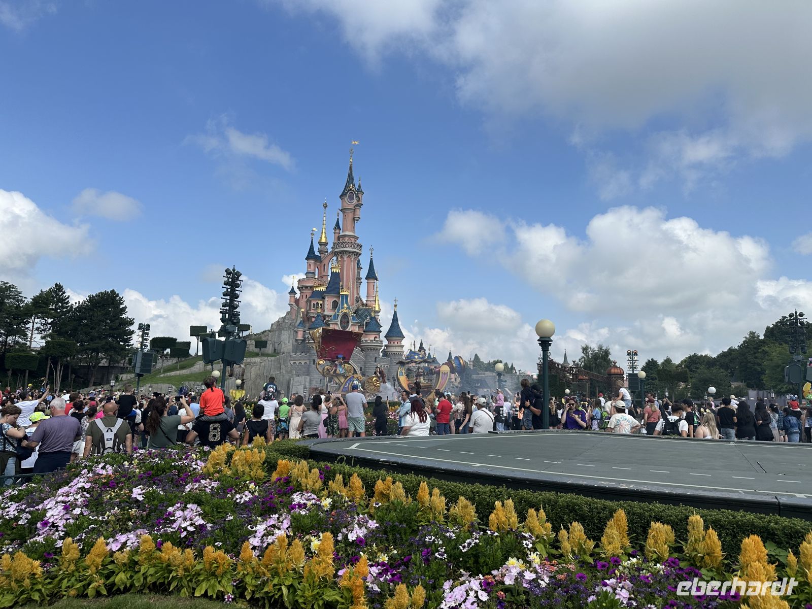 Aus der App kann man ebenfalls erfahren, wann die große Disneyparade stattfindet. An unserem Besuchstag war es 11.30 Uhr. Hier ist es ratsam, sich rechtzeitig gute Plätze zu sichern. Ab einer Stunde vor Paradenbeginn sind die Bordsteinkanten und Bänke entlang der Route belegt. Steht man nicht in vorderster Reihe, gibt es trotzdem einiges zu sehen, denn viele Disneyfiguren kommen auf großen Wagen gefahren.