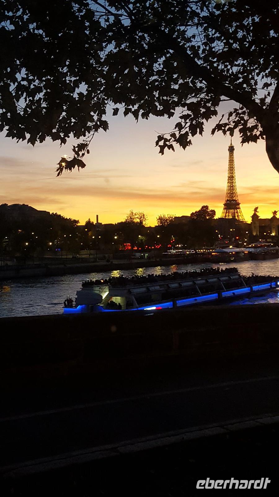 Am späteren Nachmittag wartete noch einmal Michael auf uns, denn wir wollten noch eine zweite Stadtrundfahrt hinauf zur Sacre Coeur unternehmen. Aufgrund des noch stärkeren Verkehrsaufkommens in Paris, schafften wir es jedoch leider nicht mehr, sondern konnten den Montmatre nur kurz durch zwei kleine Gassen erspähen. Ein klein wenig enttäuscht, das wir es leider nicht geschafft haben, holten wir dann noch die anderen Gäste, die die 2. Stadtrundfahrt nicht mit machen wollten, am ausgemachten Treffpunkt ab. Dann ging es für heute zurück zum Hotel. Auf dem Heimweg, konnten wir den Sonnenuntergang über dem Eiffelturm bewundern. Was für ein schöner Tagesabschluss.