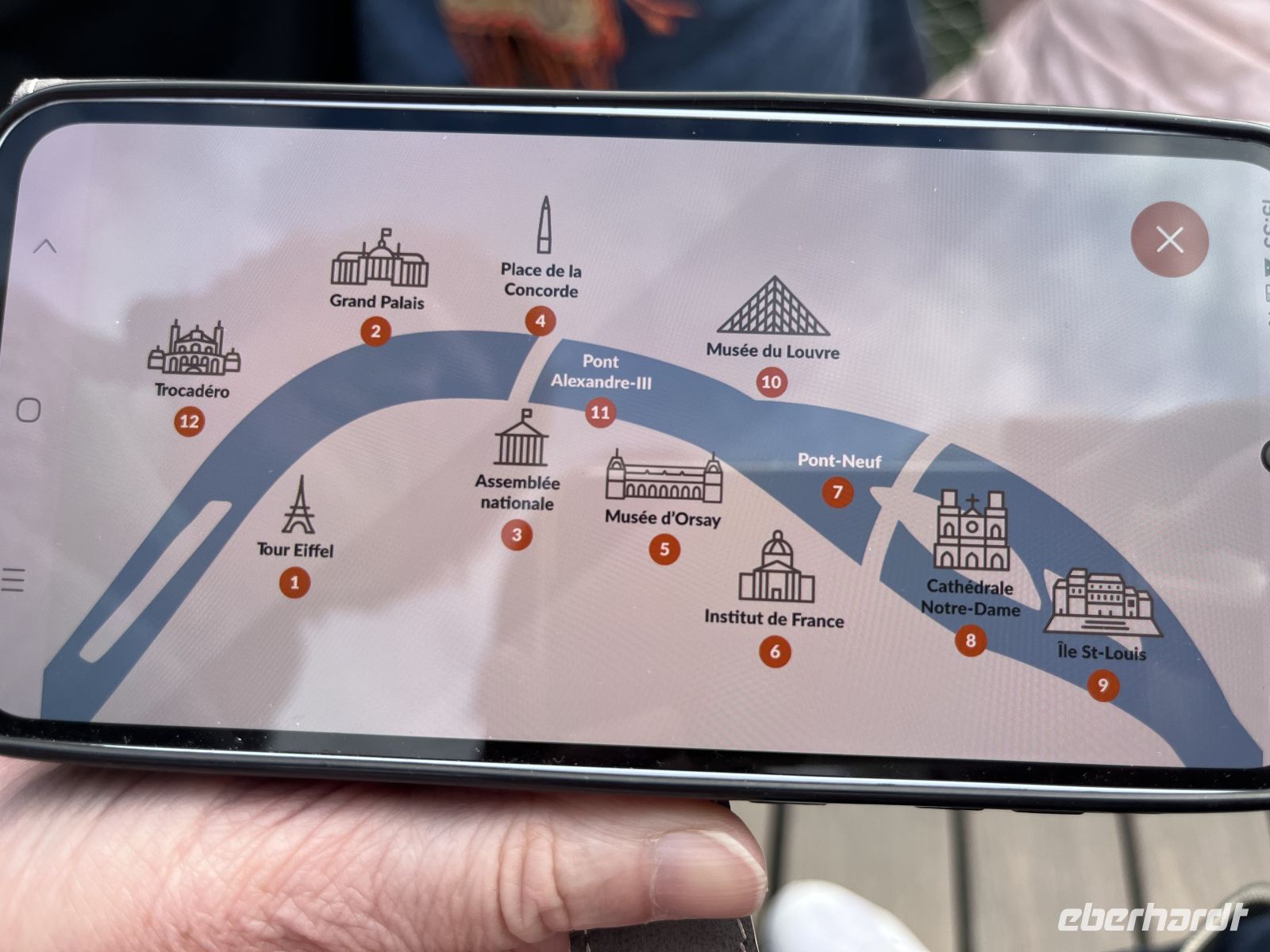 Dann ging es zur Bootsfahrt auf der Seine, jeder hatte seinen Platz gefunden, die Code für die Beschreibung gescannt und schon ging es los.