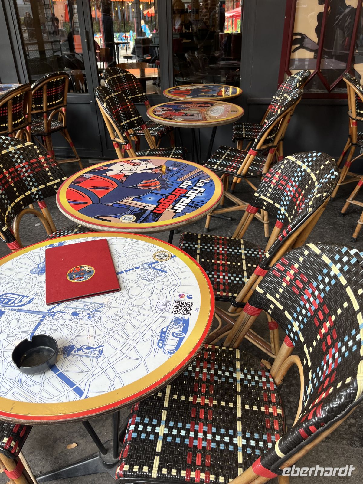 Auf der Quas Saint- Bernhard, wo wir schon die Baukräne vor der Kathedrale Notre Dame sehen, an der Polizeipräfektur vorbei, welche auf einer Seine- Insel steht, am Comic Shop „Album Comics“ welcher am Boulevard Saint- Germain im 5.Arr. zu finden ist.