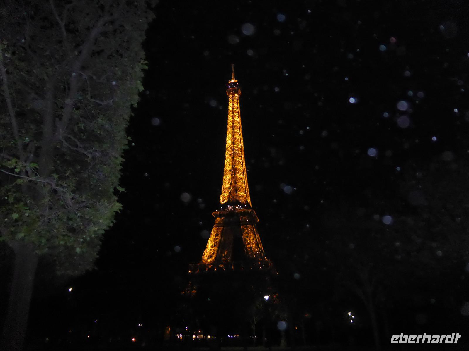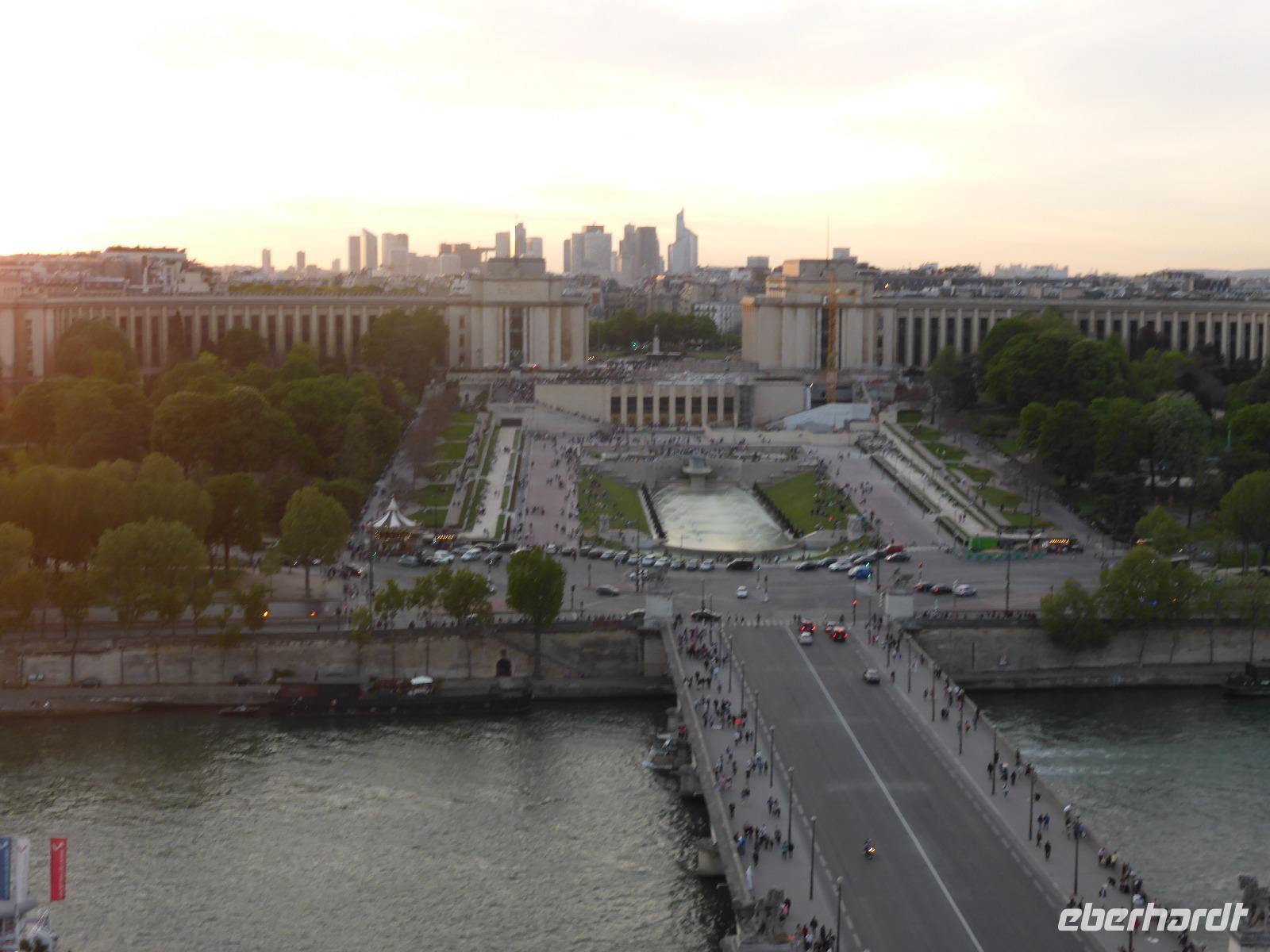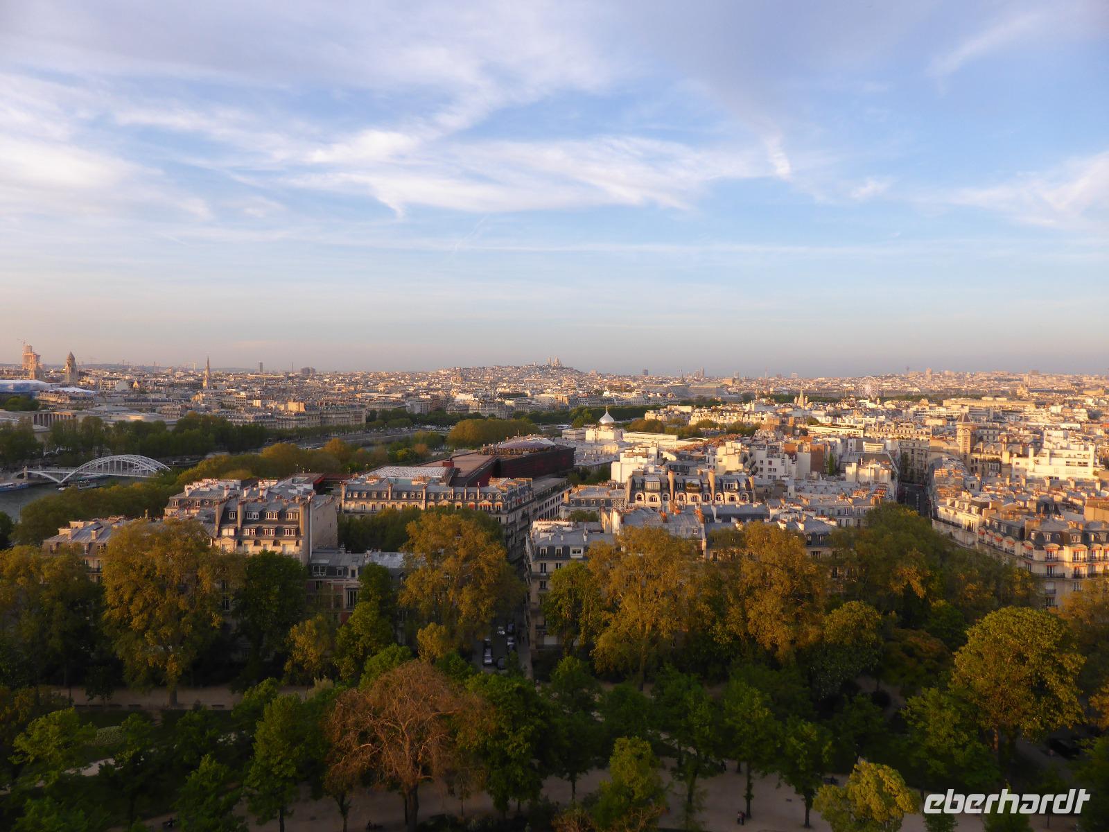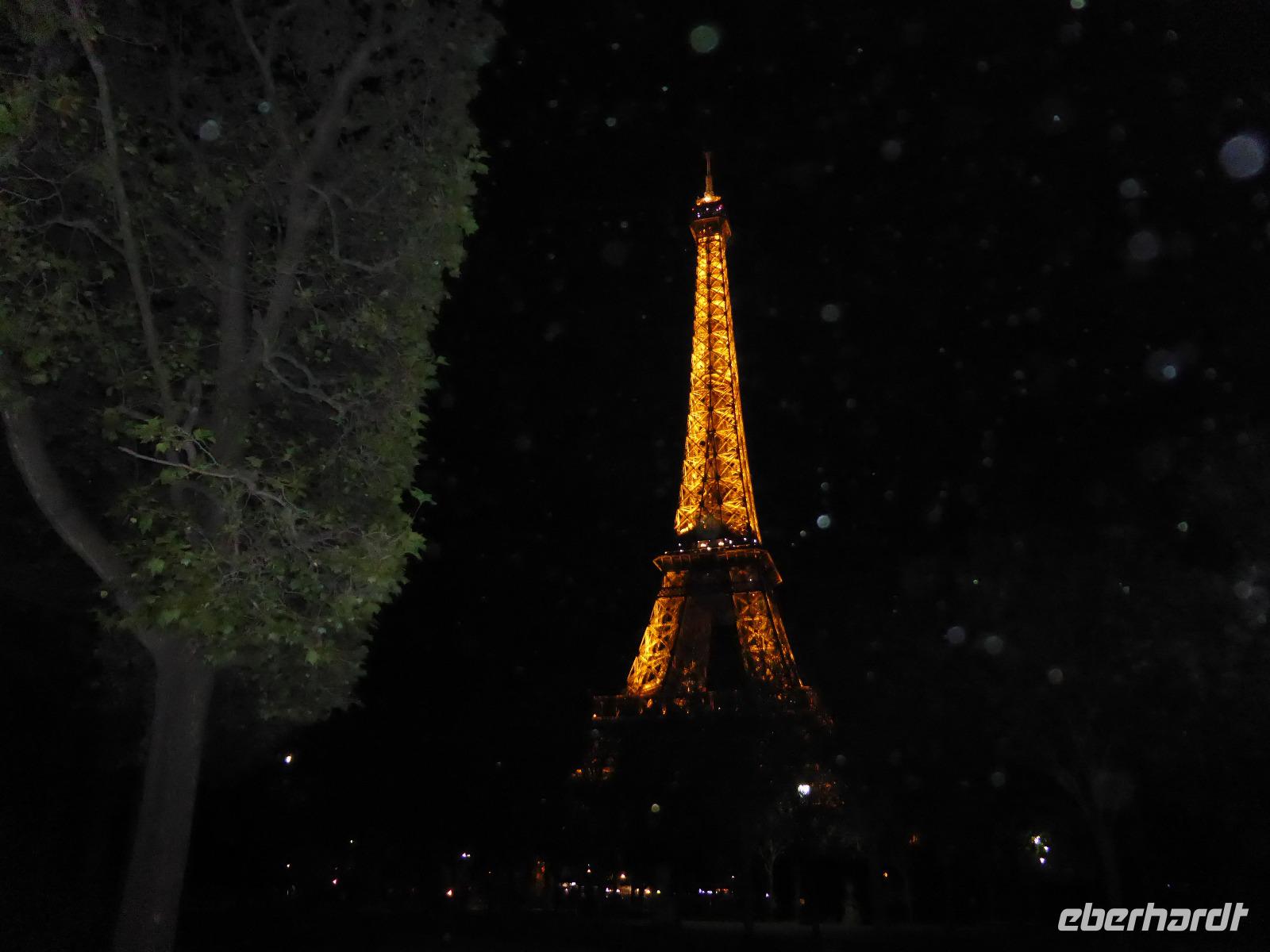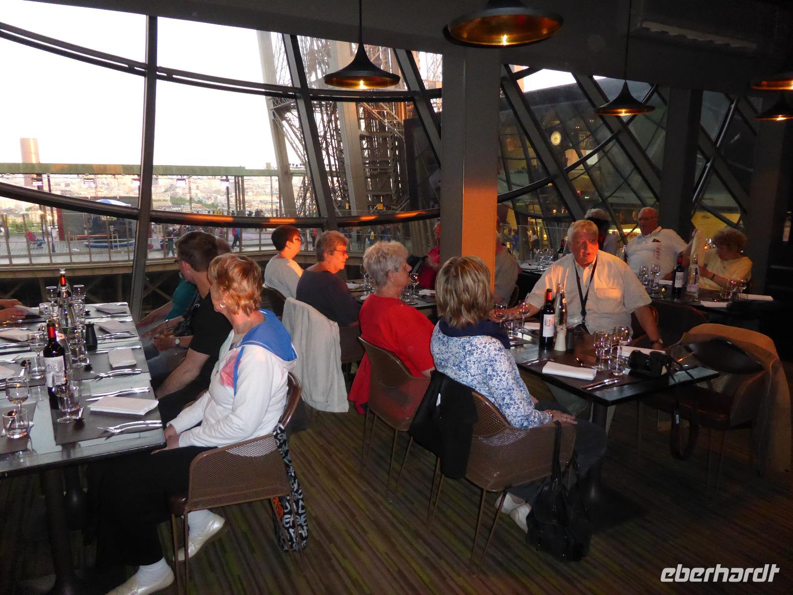 Etwas pflastermüde freuten wir uns auf den Höhepunkt des heutigen Tages, das Abendessen auf der ersten Etage des Eiffelturms. Pünktlich zur gebuchten Zeit um 20:30 Uhr konnten wir zur ersten Aussichtsplattform des Eiffelturms gelangen. Der Eiffelturm ist das berühmteste Wahrzeichen von Paris. Die Idee zur Errichtung des Turmes hatte der Ingenieur Gustave Eiffel bei der Konstruktion metallener Brückenpfeiler. 1889 war das Bauwerk vollendet und wurde schnell zu einem Besuchermagnet. Bei Champagner, Wein und einem sehr guten Essen genossen wir den Sonnenuntergang sowie die Atmosphäre im Restaurant „58". Diesen Eindruck rundeten die Beleuchtung sowie die tausenden blinkenden Glühbirnen am Eiffelturm zur vollen Stunde ab.