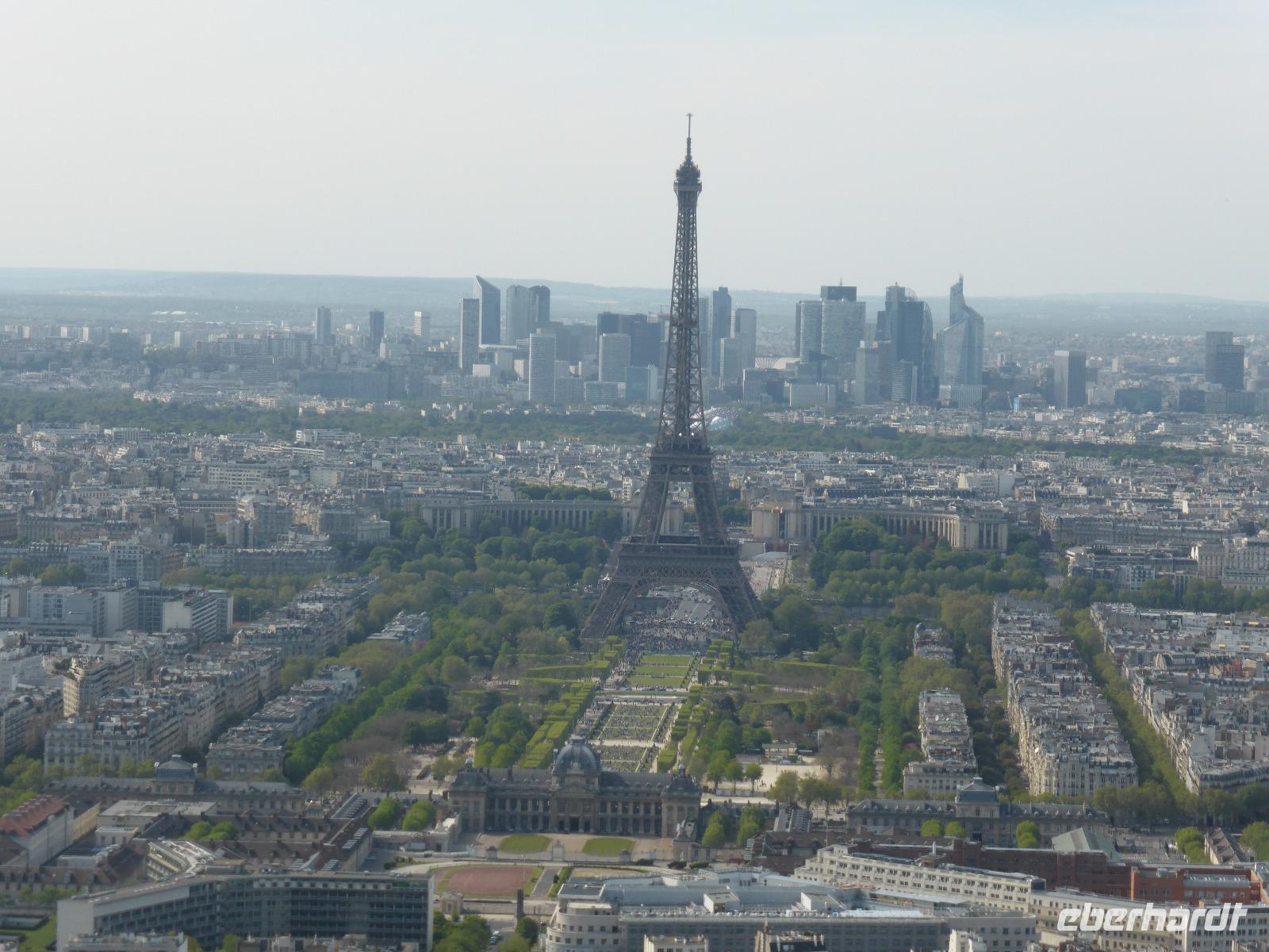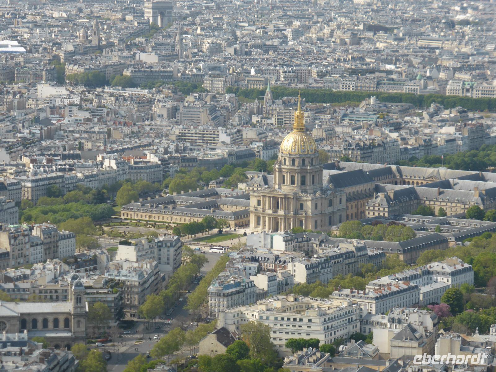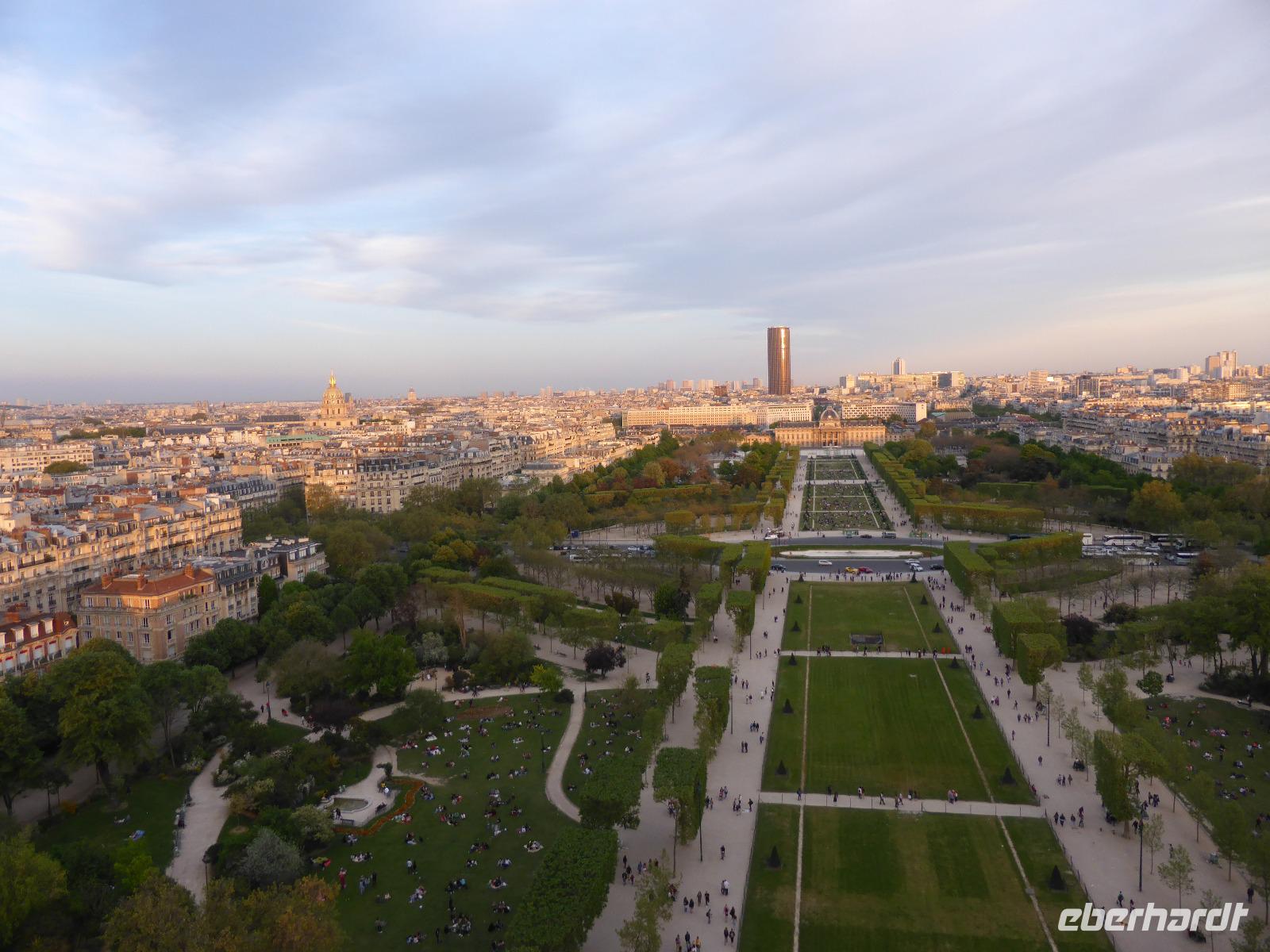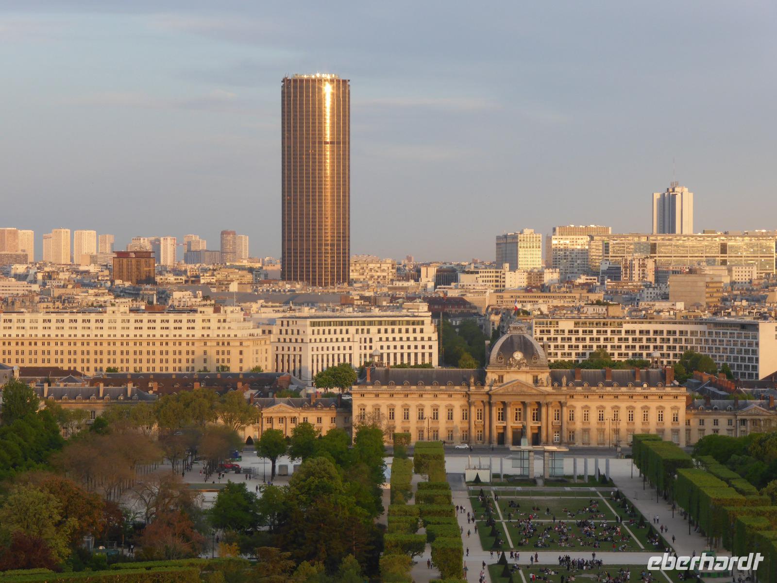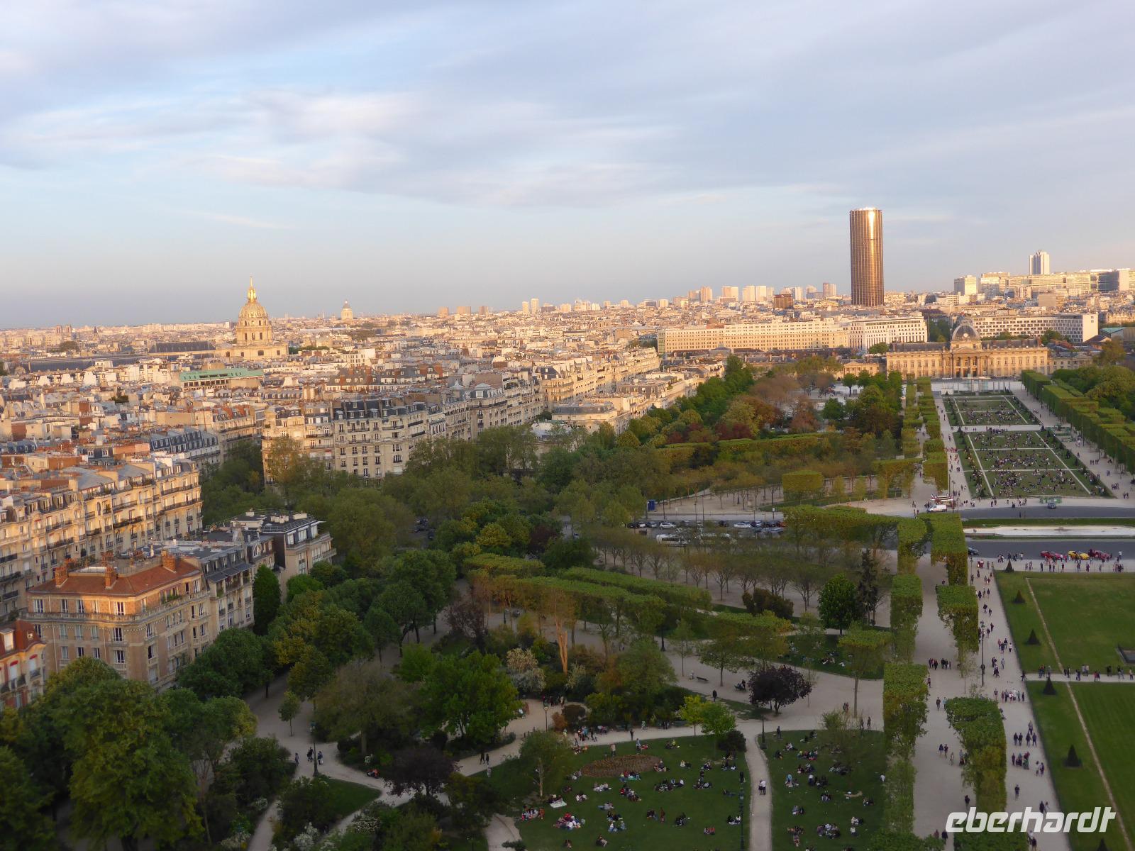 Etwas pflastermüde freuten wir uns auf den Höhepunkt des heutigen Tages, das Abendessen auf der ersten Etage des Eiffelturms. Pünktlich zur gebuchten Zeit um 20:30 Uhr konnten wir zur ersten Aussichtsplattform des Eiffelturms gelangen. Der Eiffelturm ist das berühmteste Wahrzeichen von Paris. Die Idee zur Errichtung des Turmes hatte der Ingenieur Gustave Eiffel bei der Konstruktion metallener Brückenpfeiler. 1889 war das Bauwerk vollendet und wurde schnell zu einem Besuchermagnet. Bei Champagner, Wein und einem sehr guten Essen genossen wir den Sonnenuntergang sowie die Atmosphäre im Restaurant „58". Diesen Eindruck rundeten die Beleuchtung sowie die tausenden blinkenden Glühbirnen am Eiffelturm zur vollen Stunde ab.