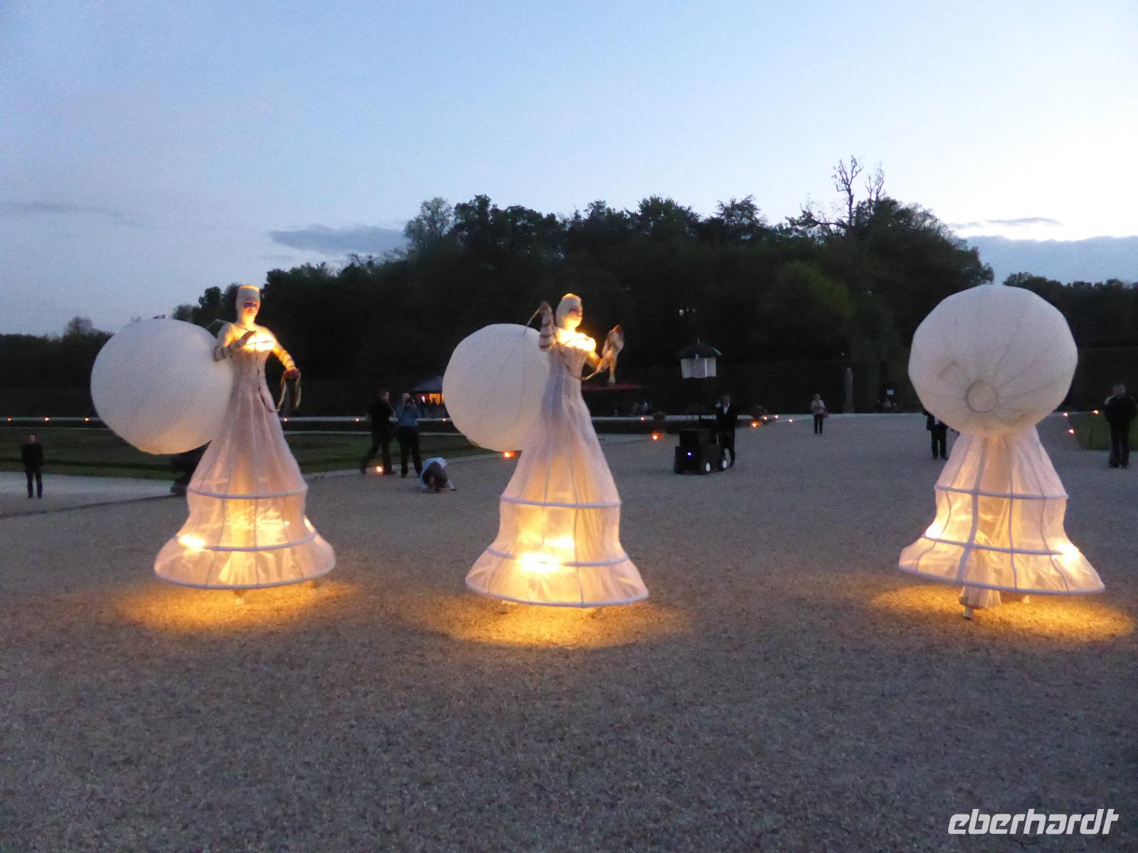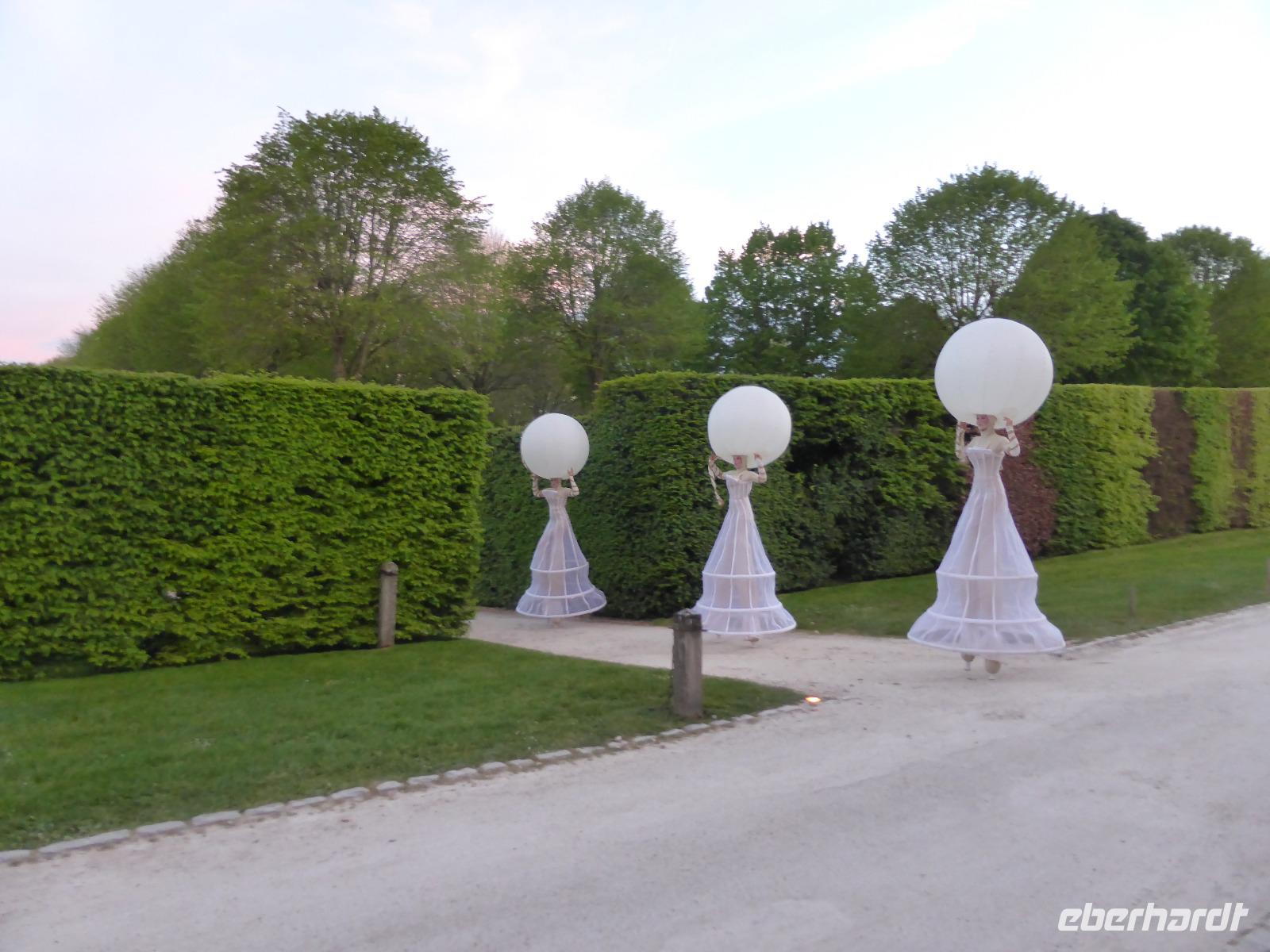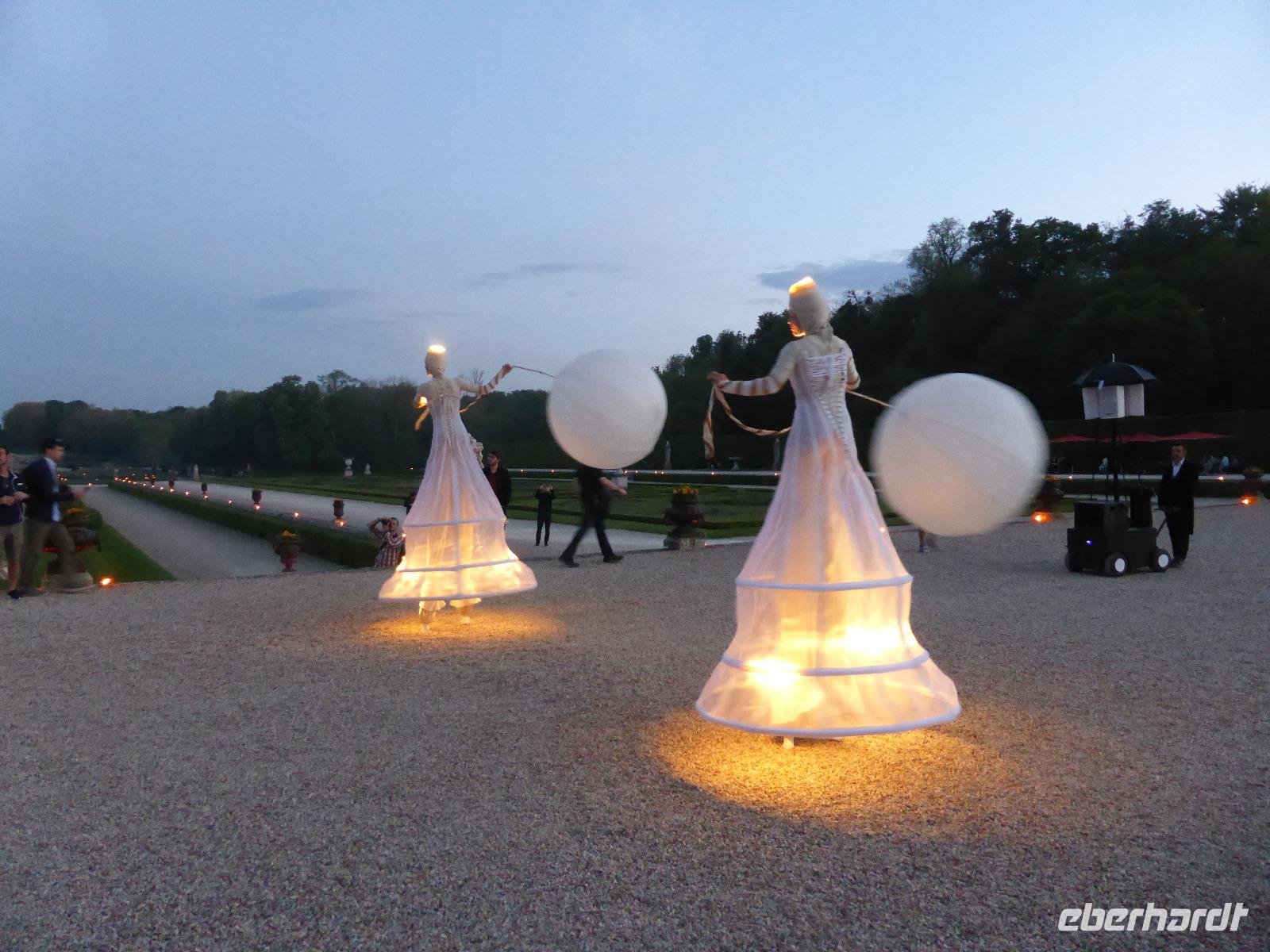 Am Abend nahmen wir das Abendessen bei Kerzenschein in der Dependance ein. Die zahlreichen Kerzen am Schloss sowie im Garten gaben allem eine sehr romantische Atmosphähre. Das iszenierte künstlerische Spektakel war zwar etwas dürfig, dafür waren die beleuchteten Schlossräume besonders schön.