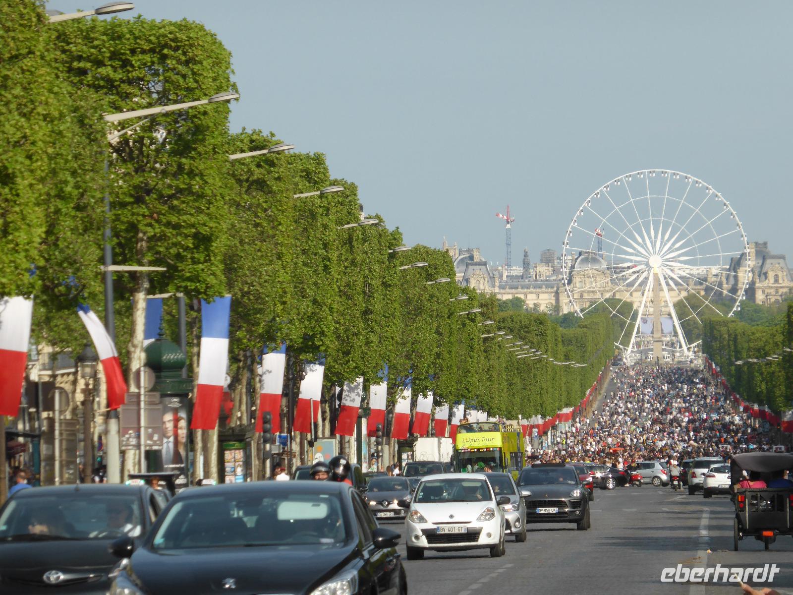 Den Abschluss bildete das Abendessen im Restaurant Chez Clemont auf der Champs Elysees. Diese Prachtstraße war heute zur Fußgängerzone erklärt worden. Ein seltener Anblick - zahlreichen Menschen auf der Straße!