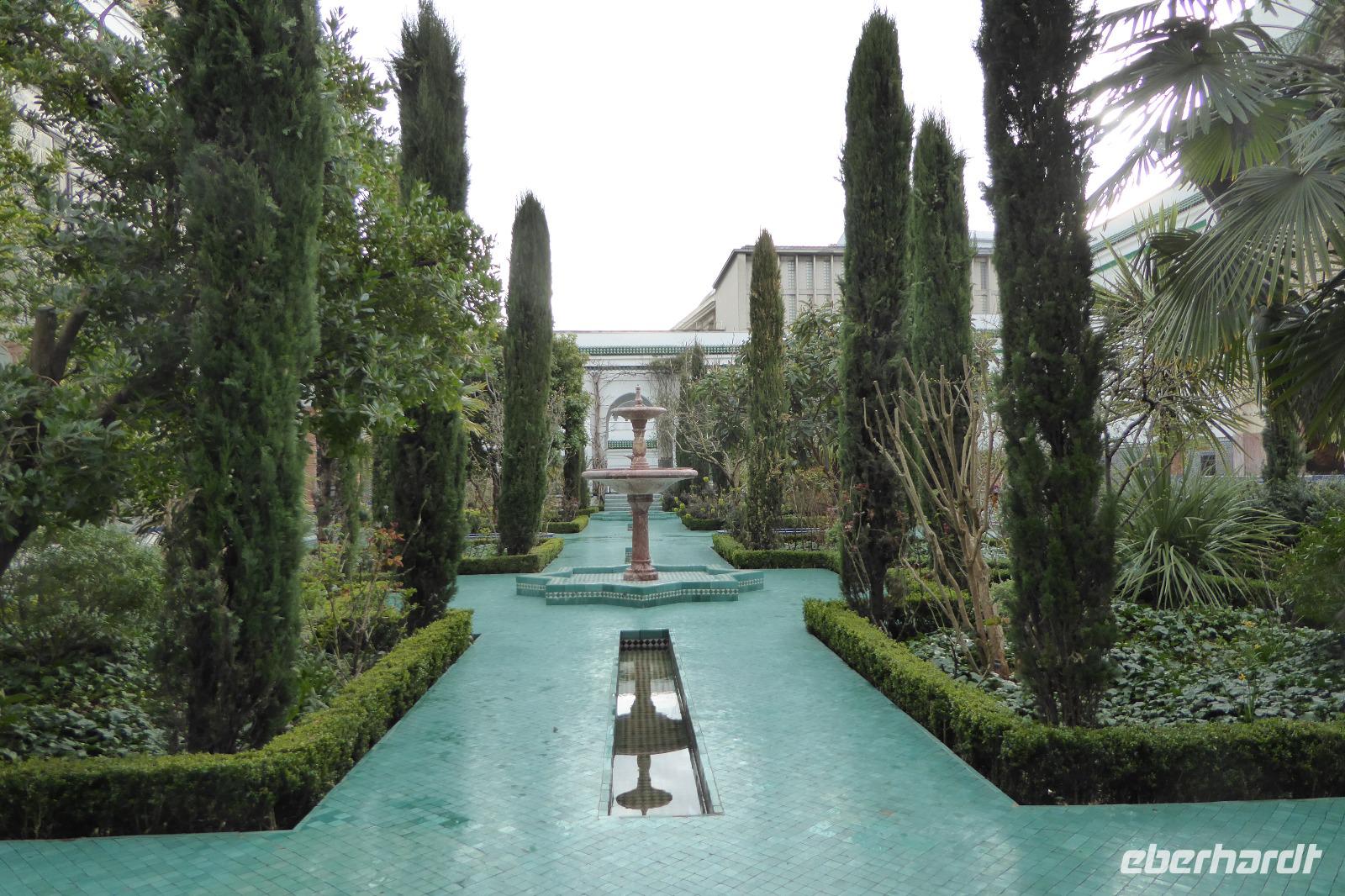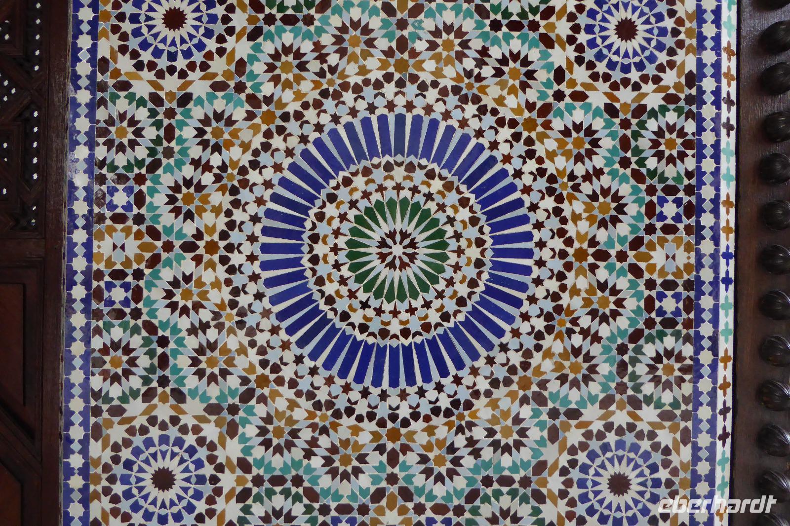 Nach einem ausgiebigen Frühstück im Hotel machten wir uns auf den Weg zu einer Stadtrundfahrt mit dem Minibus. In der alten Moschee durften wir einen kurzen Blick in den Garten werfen: Palmen, bunte Mosaiken, geschnitzte Holzwände und eine Brunnenschale, symmetrisch im Innenhof angeordnet, erwecken Bilder aus 1001 Nacht.