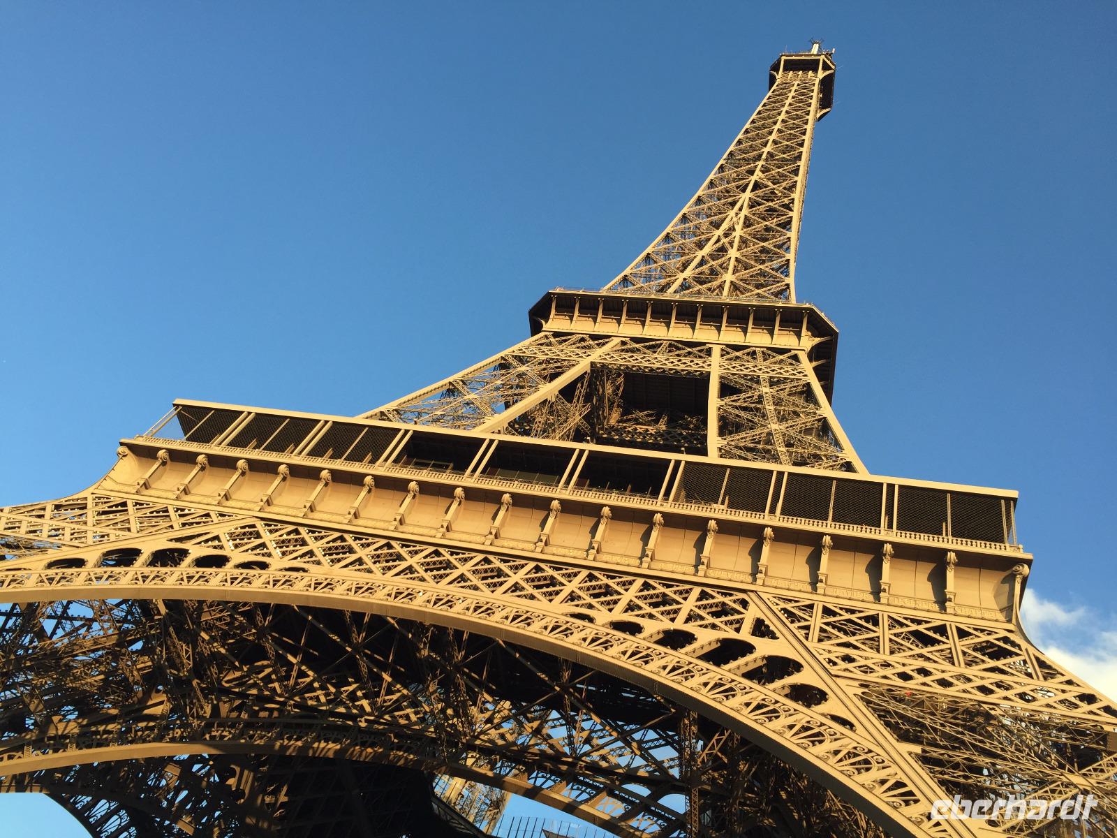 Auf dem Platz der Menschenrechte, oberhalb der Trocadéro-Gärten machen wir einen kurzen Stopp für die besten Fotos von der „Eisernen Lady". Heute ist es unvorstellbar, dass das Wahrzeichen von Paris, die kühne von Gustave Eiffel erbaute Eisenkonstruktion, nach der Weltausstellung beinahe abgerissen worden wäre! Vierzig namhafte Persönlichkeiten, wie die Schriftsteller Guy de Maupassant und Alexandre Dumas hatten schon einige Tage nach Baubeginn im Feb 1887 eine Protestnote gegen den „unnützen und monströsen Eiffelturm mitten im Herzen unserer Hauptstadt" unterschrieben ...