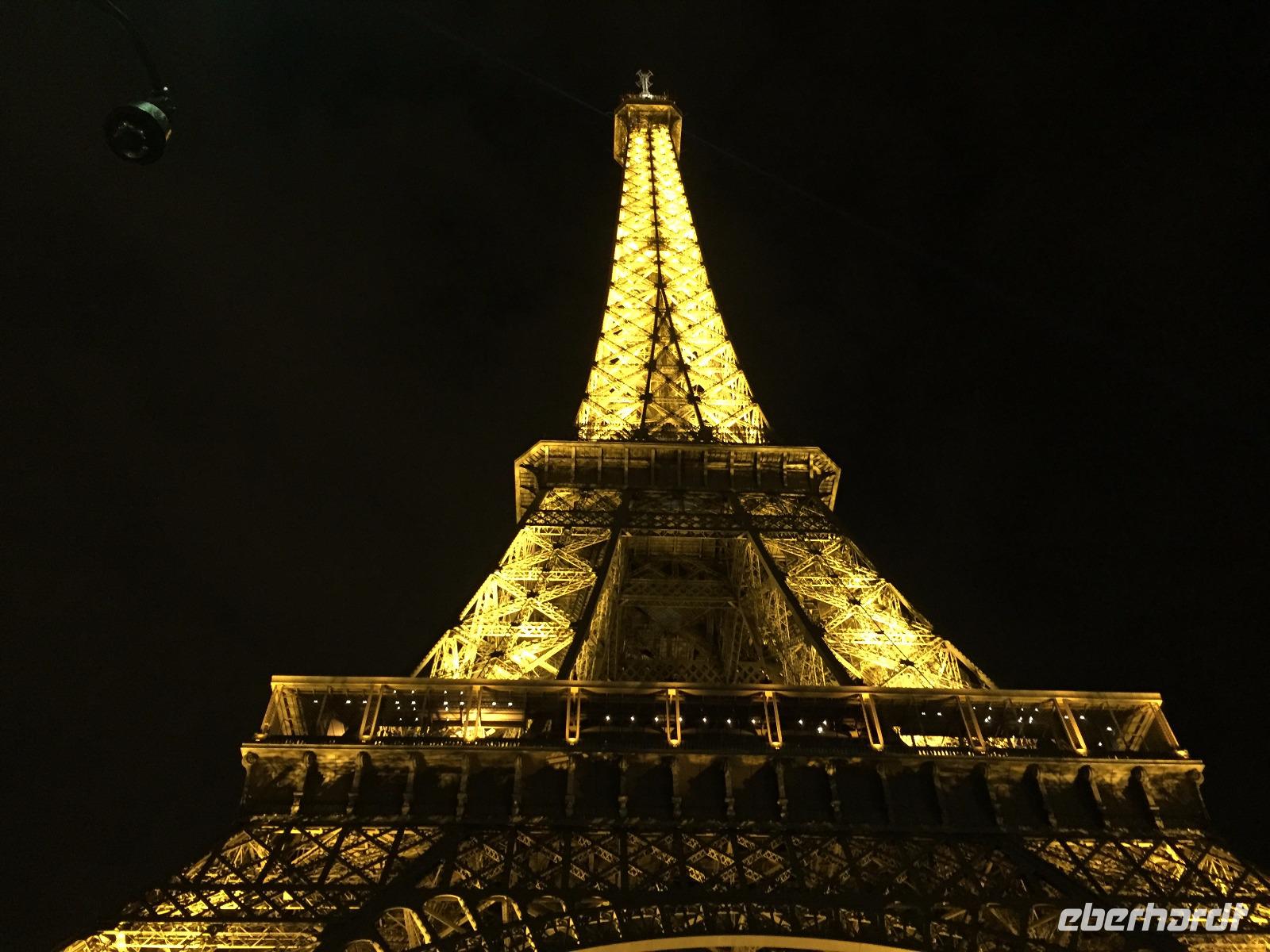 Auch heute genießen wir ein besonderes Abendessen: Im neuen Restaurant „58 Tour Eiffel" auf der ersten Ebene der „Eisernen Lady", mit Blick auf die Pont d'Iena und die Gärten des Trocadéro! Auf der Speisekarte stehen: Gänseleberpastete, Dorade ... und alles schmeckt fantastisch! Es ist bereits fast Mitternacht, als wir zu Fuß über die Pont d'Iena gehen, um von der rechten Seite der Seine einen letzten Blick auf den Eifelturm bei Nacht zu genießen. Dann treten wir unsere letzte Métrofahrt dieser Reise an.