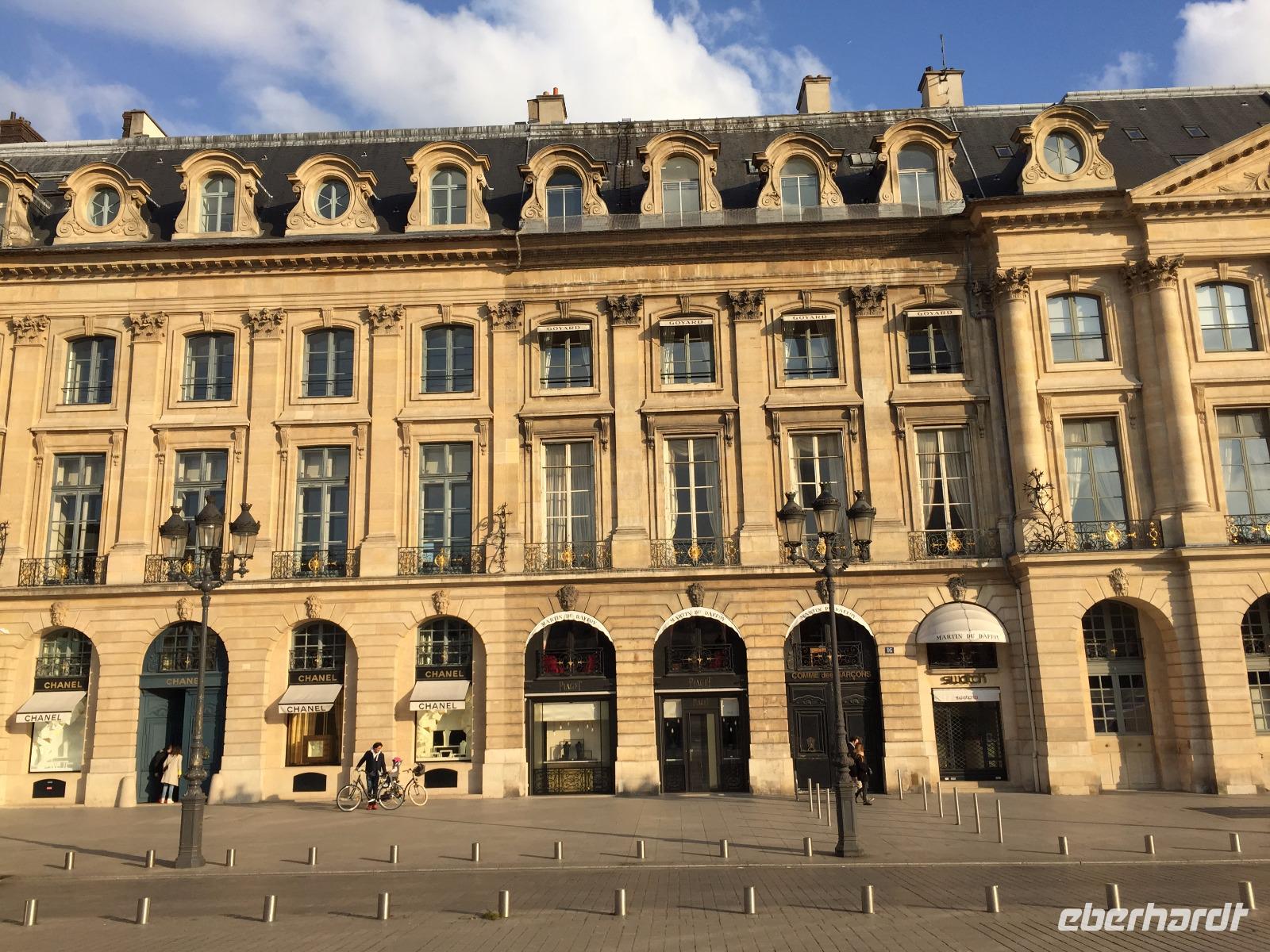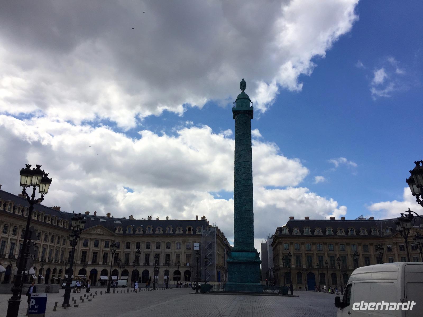 Anschließend ist die vornehme Gegend um die alte Pariser Oper unser Ziel. An der Place de Vendôme bietet das Palasthotel Ritz erstklassigen Service für die „Schönen und Reichen" und ein Ambiente im Stil des Art Nouveau. Irgendwie schaffen wir eine kleine Besichtigungstour in die wunderschönen Empfangs- und Wartebereiche des Foyers - dann werden wir sehr höflich von einem Mitarbeiter in Livree (Diener sagt man ja nicht mehr ...) „aus Sicherheitsgründen" zum Gehen aufgefordert. 1997 war das Ritz die letzte Station von Lady D, die wenig später in einer Unterführung nahe der Pont d'Alma tödlich verunglückte. Hier auf dem Platz mit der Siegessäule Napoleons findet man ein edles Schmuck- und Uhrengeschäft neben dem anderen: Cartier, Boucheron, Van Cleef & Arpels, Bulgari und andere.
