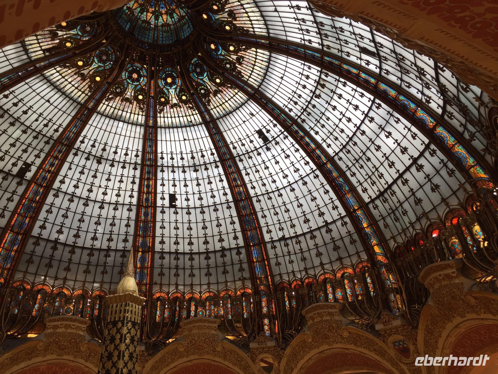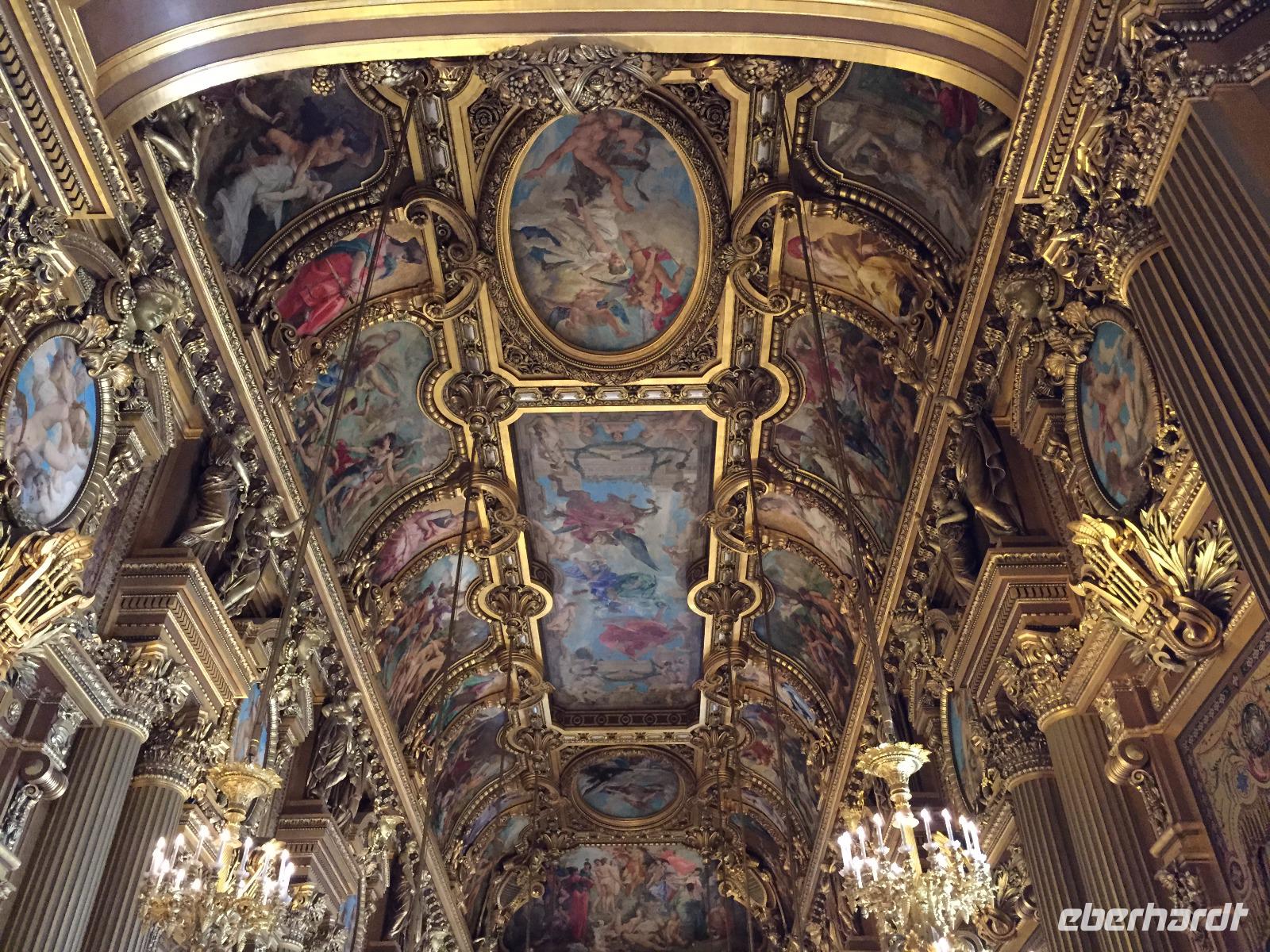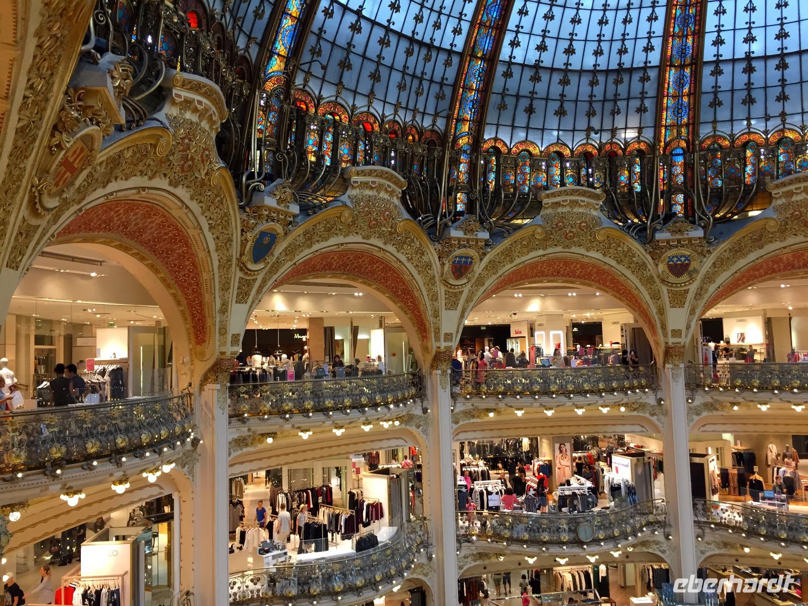 An den „Grands Boulevards" liegt das Nobelkaufhaus „Galeries Lafayette" mit der prachtvollen Jugendstilkuppel. Auf der Dachterrasse kann man einen Café Crème und den Blick über die Dächer der Opéra und der gesamten Stadt genießen, im Selbstbedienungsrestaurant bekommen Hungrige schnell einen kleinen, aber feinen Mittagssnack. Gestärkt treffen wir zur Besichtigung des alt-ehrwürdigen Opernhauses ein. Der Architekt Charles Garnier schuf im opulenten Stil des Zweiten Kaiserreichs das damals größte Opernhaus der Welt mit Ehrentreppe und großzügigem Foyer, alles ausgestattet mit edlen Marmorplatten, prächtigen Kandelabern und Gemälden hochrangiger Künstler. 1964 fügte der Maler Marc Chagall dem Zuschauersaal ein großes Kuppelgemälde mit berühmten Opern-und Ballettszenen als modernes und nie ganz unumstrittenes modernes Element zu.