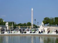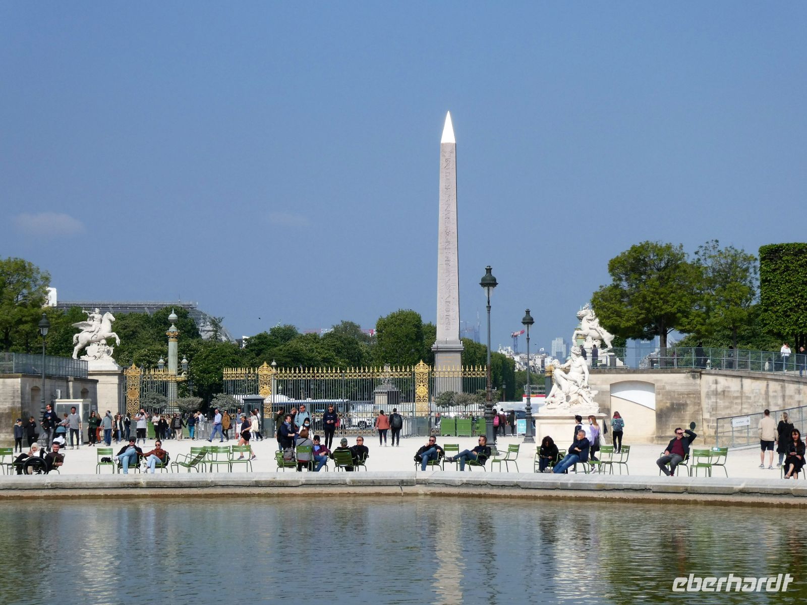 In der Mitte des Platzes blicken wir auf das 23,50 m hohe Geschenk des "Muhammad Ali Pascha" für König Louis-Philippe als Anerkennung der Leistung von M. Champollion: den Obelisken, ein Granit-Monolith aus dem 13.Jh. v.Chr.(230 Tonnen). Champollion hatte die Hieroglyphen entziffert und dafür gesorgt, dass man heute weiss, was auf dem Obelisken steht (die ruhmreichen Taten von Ramses II.).Weit leuchtet die Spitze aus vergoldeter Bronze.