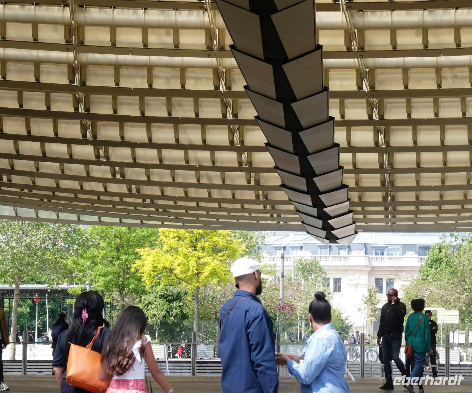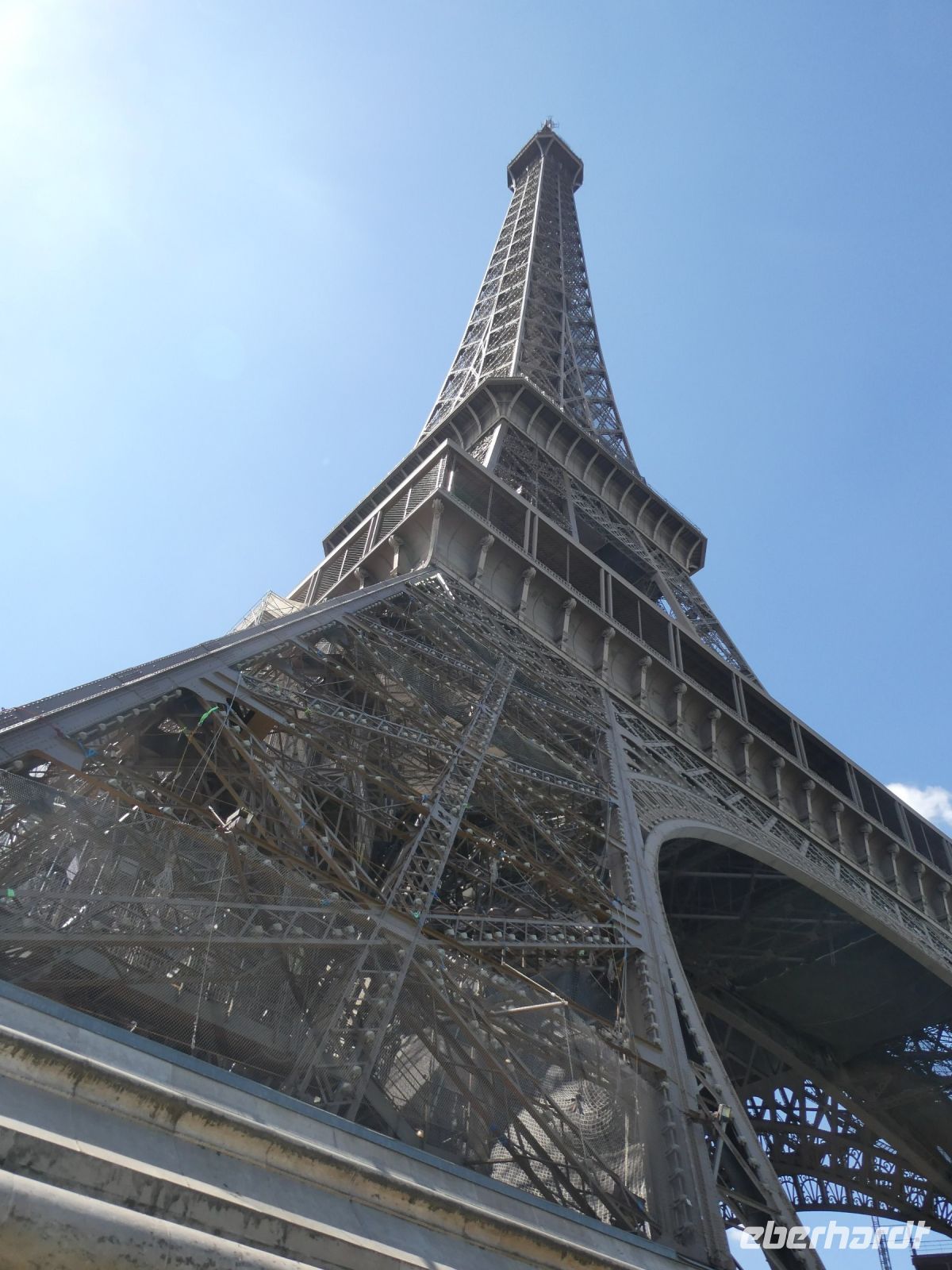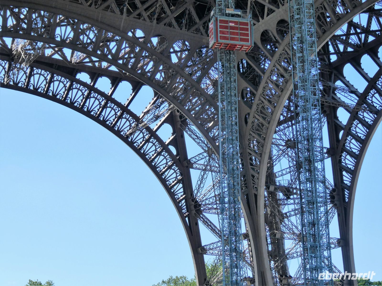 Dann aber nichts wie nach oben. Wir reihen uns in die Besucherschlangen ein, aber dank unseres vorgebuchten Tickets können wir gleich zu den Fahrstühlen durchlaufen. Dann geht es nach oben in das zweite Stockwerk. Wir haben einen wunderbaren Blick auf Paris und können das Gelände der Weltausstellungen von 1886 und 1900 gut überblicken. Die Stadtstruktur erschließt sich von hier oben besonders.