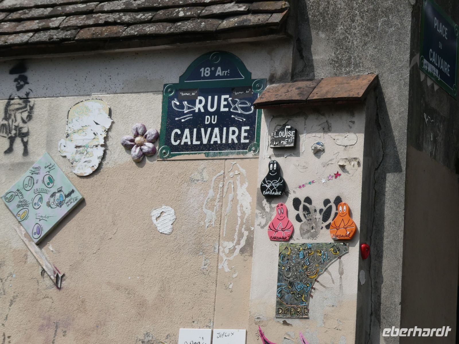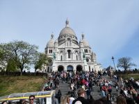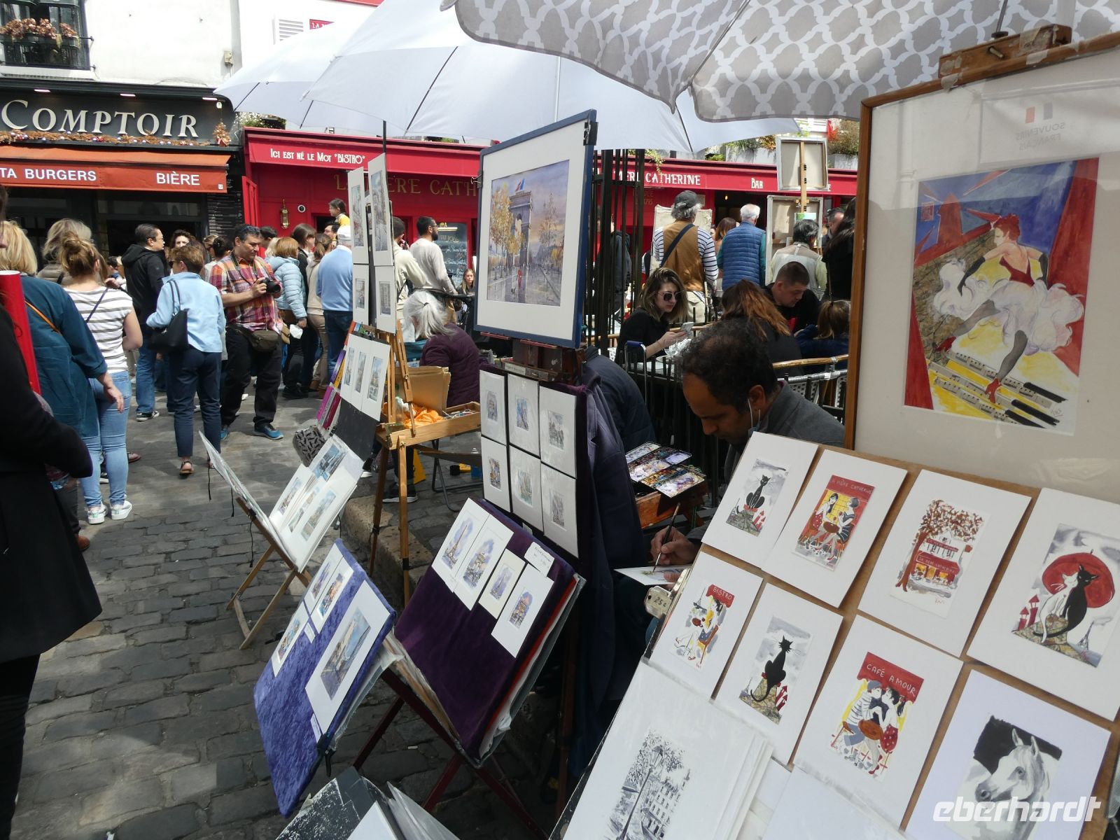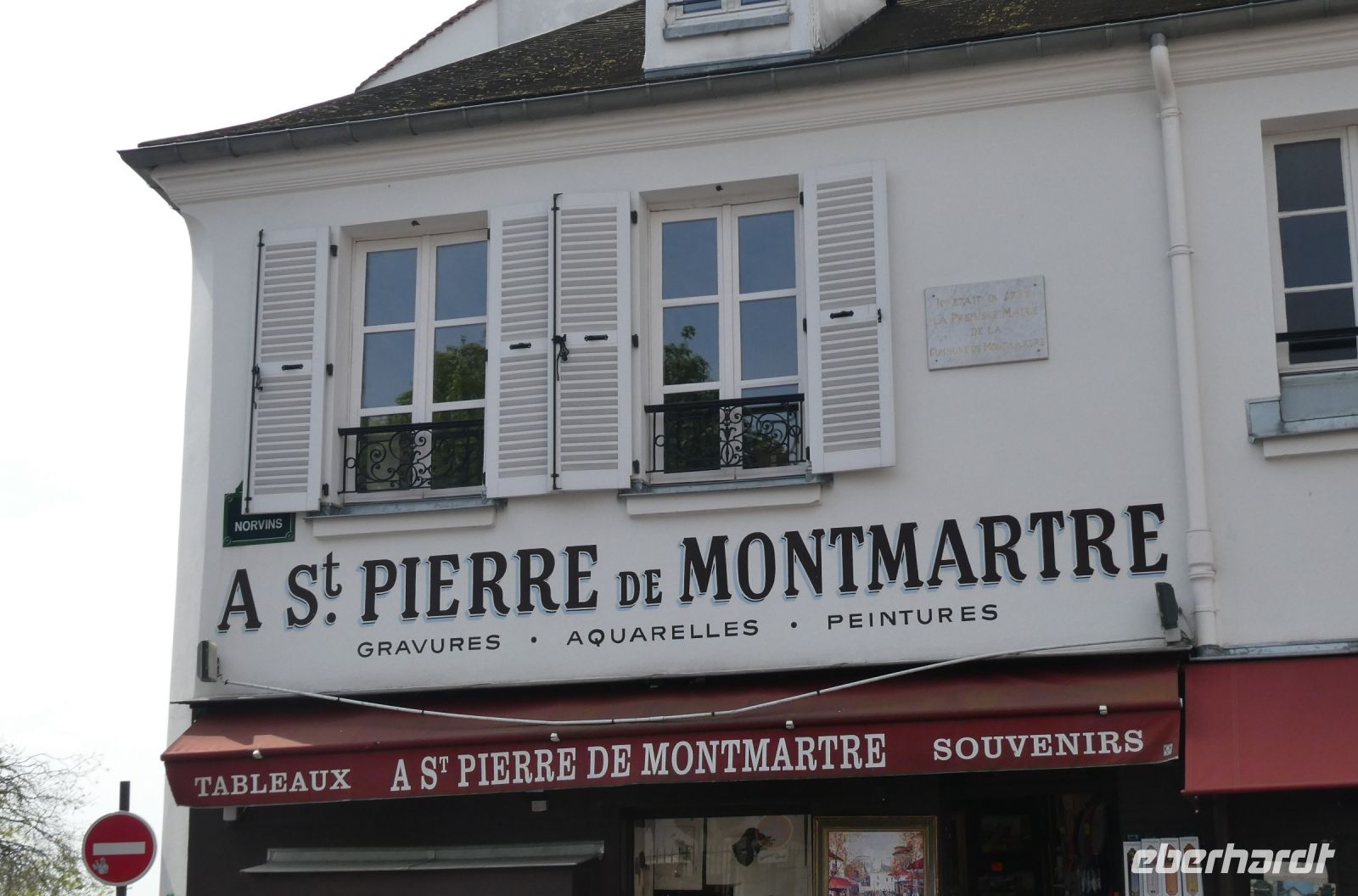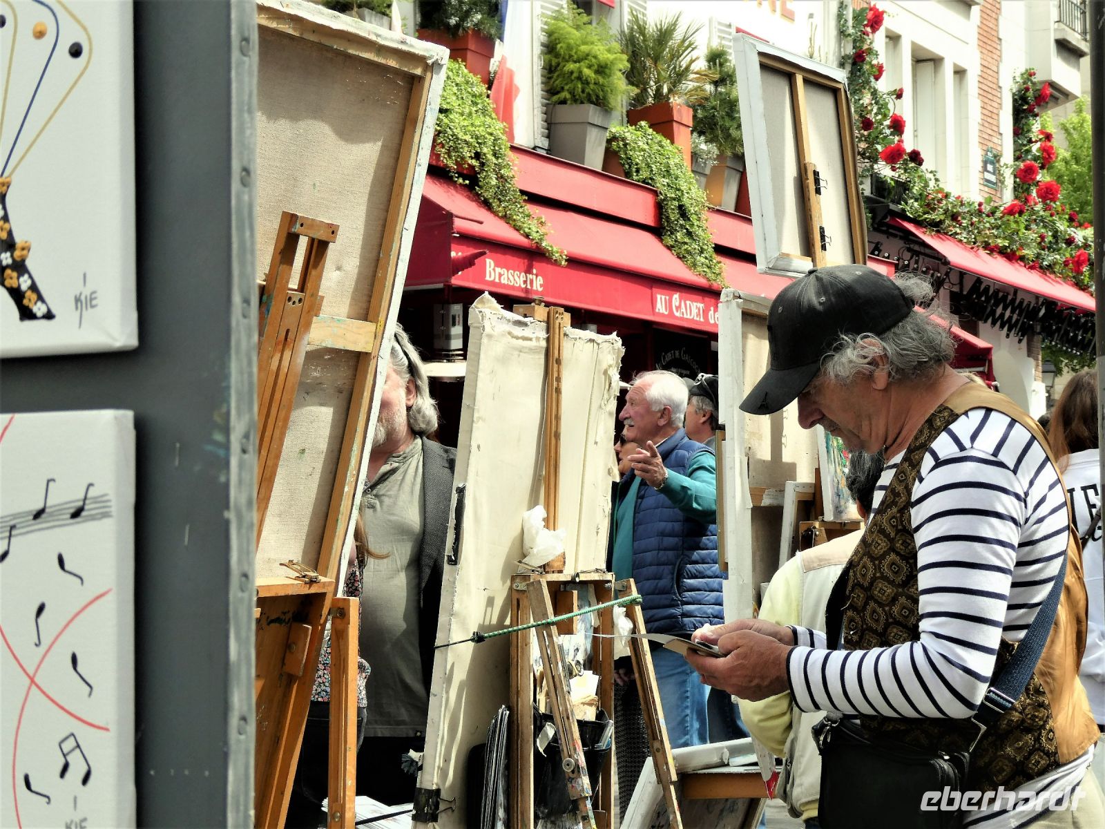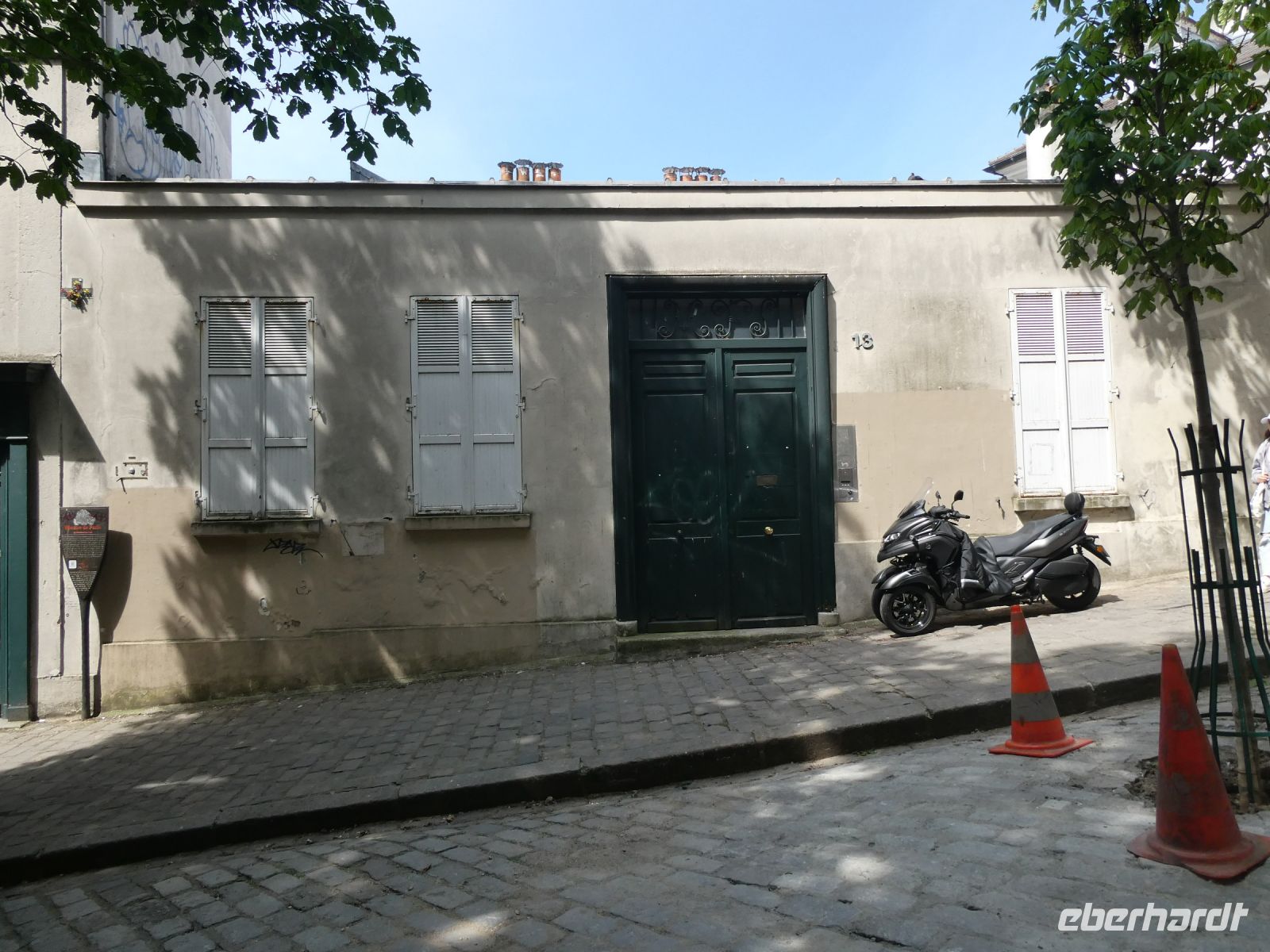 Anschließend schlendern wir in Richtung "Sacre Coeur". Auf dem Weg dorthin wird die Menschenmenge dichter. Hauptsächlich Touristen drängen sich in dem Areal um die Kirche. Hier kommt auch die kleine Bahn an, die vom Fuss des Montmartre direkt hier hinauf fährt. Da aufgrund der langen Besucherschlange ein Besuch von uns verworfen wird gehen wir weiter in Richtung "Place du Tertre". Hier machen wir eine einstündige Pause, damit sich jeder individuell umschauen kann. Die zahlreichen Künstler, die heute immer noch hier am Hügel leben und arbeiten versuchen, an diesem Platz ihre Werke an den Mann oder die Frau zu bringen. Man kann ihnen auch beim Arbeiten zuschauen. Sehr unterschiedlich sind die Auffassungen von Kunst oder auch Kitsch. Als Künstler kann man heute wenig wählerisch sein, wenn man irgendwie überleben will. Gemalt wird heute, was gekauft wird. Nicht umsonst waren Künstler wie Van Gogh, der hier auch eine Zeit verbrachte "Arme Schlucker". Eine preiswerte Unterkunft für Künstler gab es immer im "Bateau Lavoir", ein von außen etwas heruntergekommenes Haus am "Place Émile Goudeaux" (früher Rue Ravignan No.13). Es wurde als Atelierhaus rekonstruiert. Hier lebten Picasso und u.a. fanden Kees van Dongen, Max Jacob, Modigliani eine bezahlbare Unterkunft und Künstler wie Henry Matisse und Jean Cocteau kamen zu Besuch. Man bezeichnet das Haus auch als die Wiege des Kubismus. Die Ateliers zieht sich 5 Stockwerke den Abhang entlang. Nun das ahnt man nicht, wenn man es nicht weiss, so unscheinbar ist der Zugang. Nur der Eingang mit Zahlencode verrät eine Nutzung. Der Name "Waschschiff" soll ihm Max Jacob gegeben haben, da es den Schiffen auf der Seine ähnelte auf denen die Waschfrauen arbeiteten.