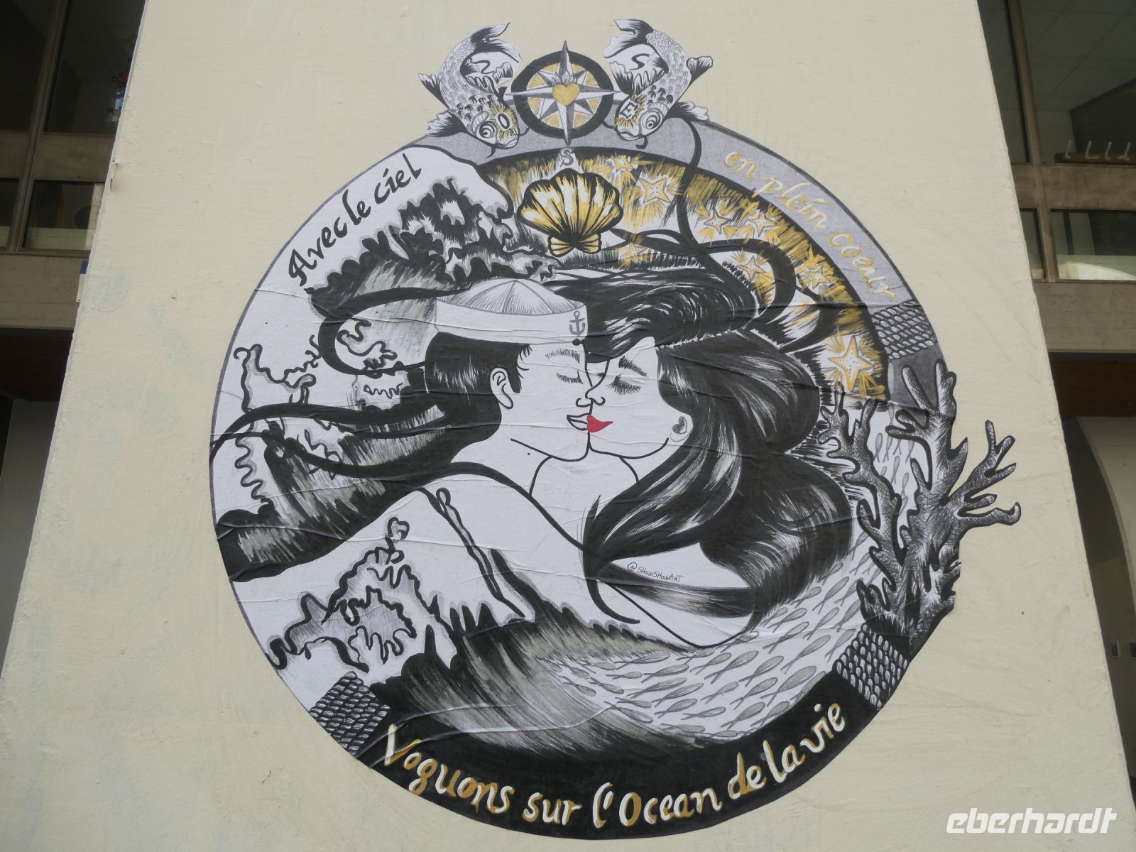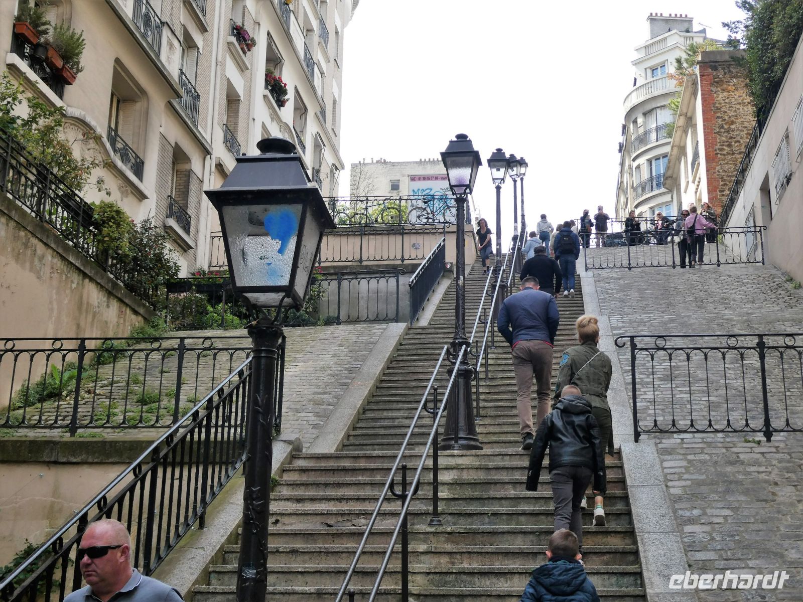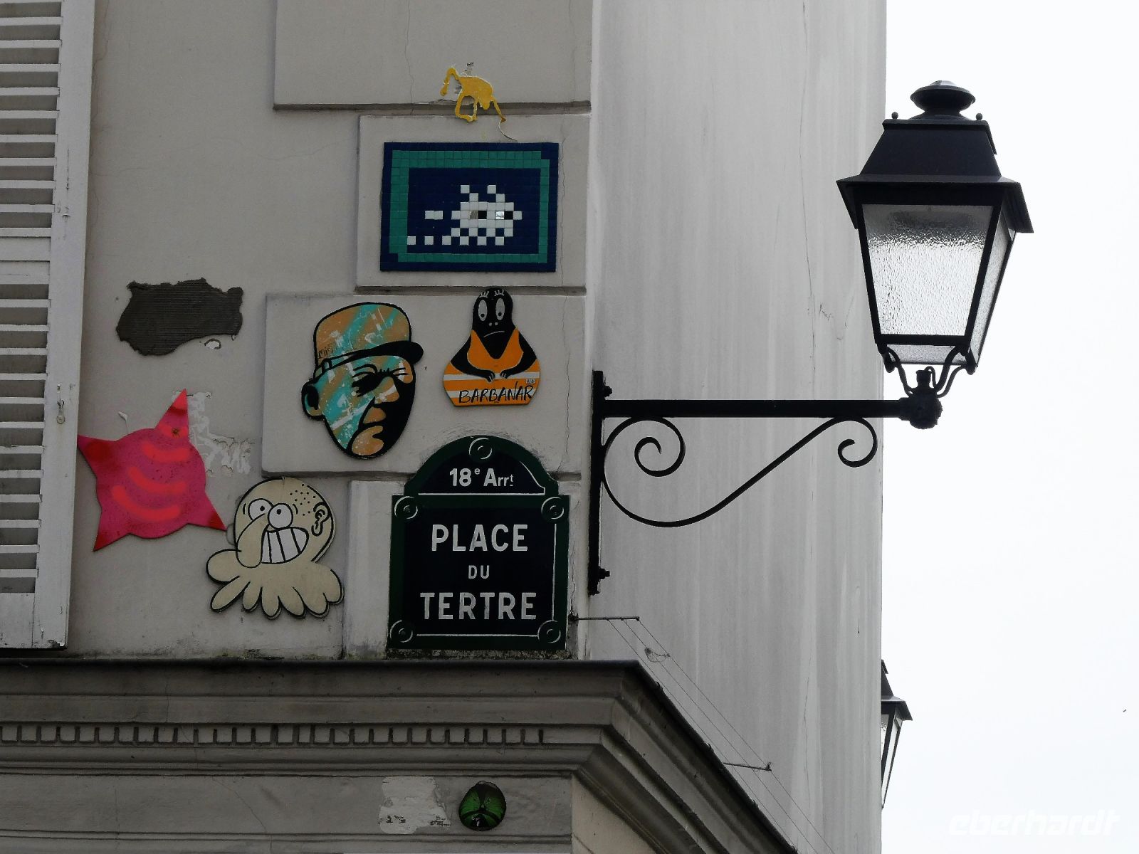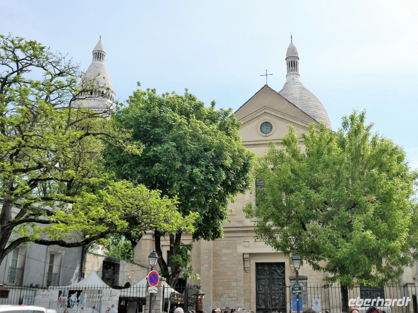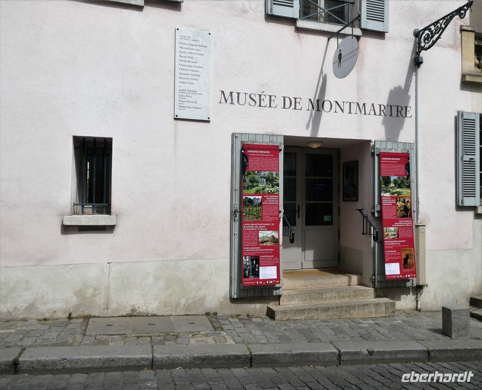Anschließend schlendern wir in Richtung "Sacre Coeur". Auf dem Weg dorthin wird die Menschenmenge dichter. Hauptsächlich Touristen drängen sich in dem Areal um die Kirche. Hier kommt auch die kleine Bahn an, die vom Fuss des Montmartre direkt hier hinauf fährt. Da aufgrund der langen Besucherschlange ein Besuch von uns verworfen wird gehen wir weiter in Richtung "Place du Tertre". Hier machen wir eine einstündige Pause, damit sich jeder individuell umschauen kann. Die zahlreichen Künstler, die heute immer noch hier am Hügel leben und arbeiten versuchen, an diesem Platz ihre Werke an den Mann oder die Frau zu bringen. Man kann ihnen auch beim Arbeiten zuschauen. Sehr unterschiedlich sind die Auffassungen von Kunst oder auch Kitsch. Als Künstler kann man heute wenig wählerisch sein, wenn man irgendwie überleben will. Gemalt wird heute, was gekauft wird. Nicht umsonst waren Künstler wie Van Gogh, der hier auch eine Zeit verbrachte "Arme Schlucker". Eine preiswerte Unterkunft für Künstler gab es immer im "Bateau Lavoir", ein von außen etwas heruntergekommenes Haus am "Place Émile Goudeaux" (früher Rue Ravignan No.13). Es wurde als Atelierhaus rekonstruiert. Hier lebten Picasso und u.a. fanden Kees van Dongen, Max Jacob, Modigliani eine bezahlbare Unterkunft und Künstler wie Henry Matisse und Jean Cocteau kamen zu Besuch. Man bezeichnet das Haus auch als die Wiege des Kubismus. Die Ateliers zieht sich 5 Stockwerke den Abhang entlang. Nun das ahnt man nicht, wenn man es nicht weiss, so unscheinbar ist der Zugang. Nur der Eingang mit Zahlencode verrät eine Nutzung. Der Name "Waschschiff" soll ihm Max Jacob gegeben haben, da es den Schiffen auf der Seine ähnelte auf denen die Waschfrauen arbeiteten.
