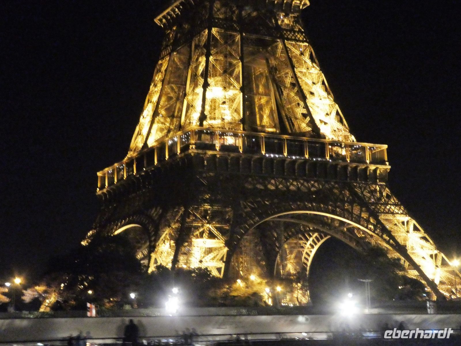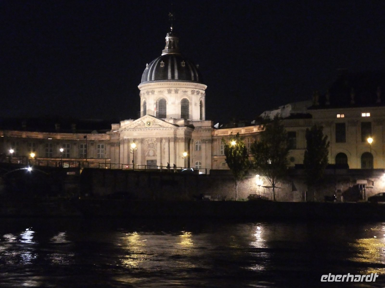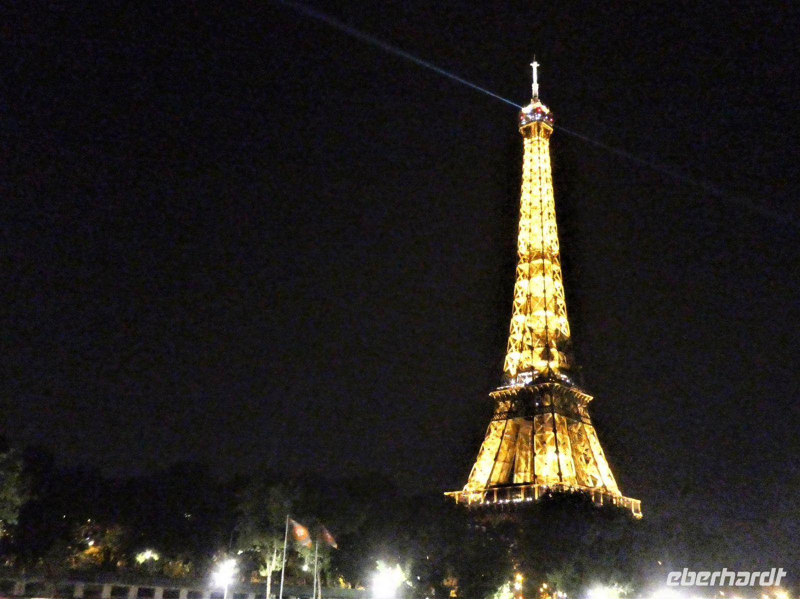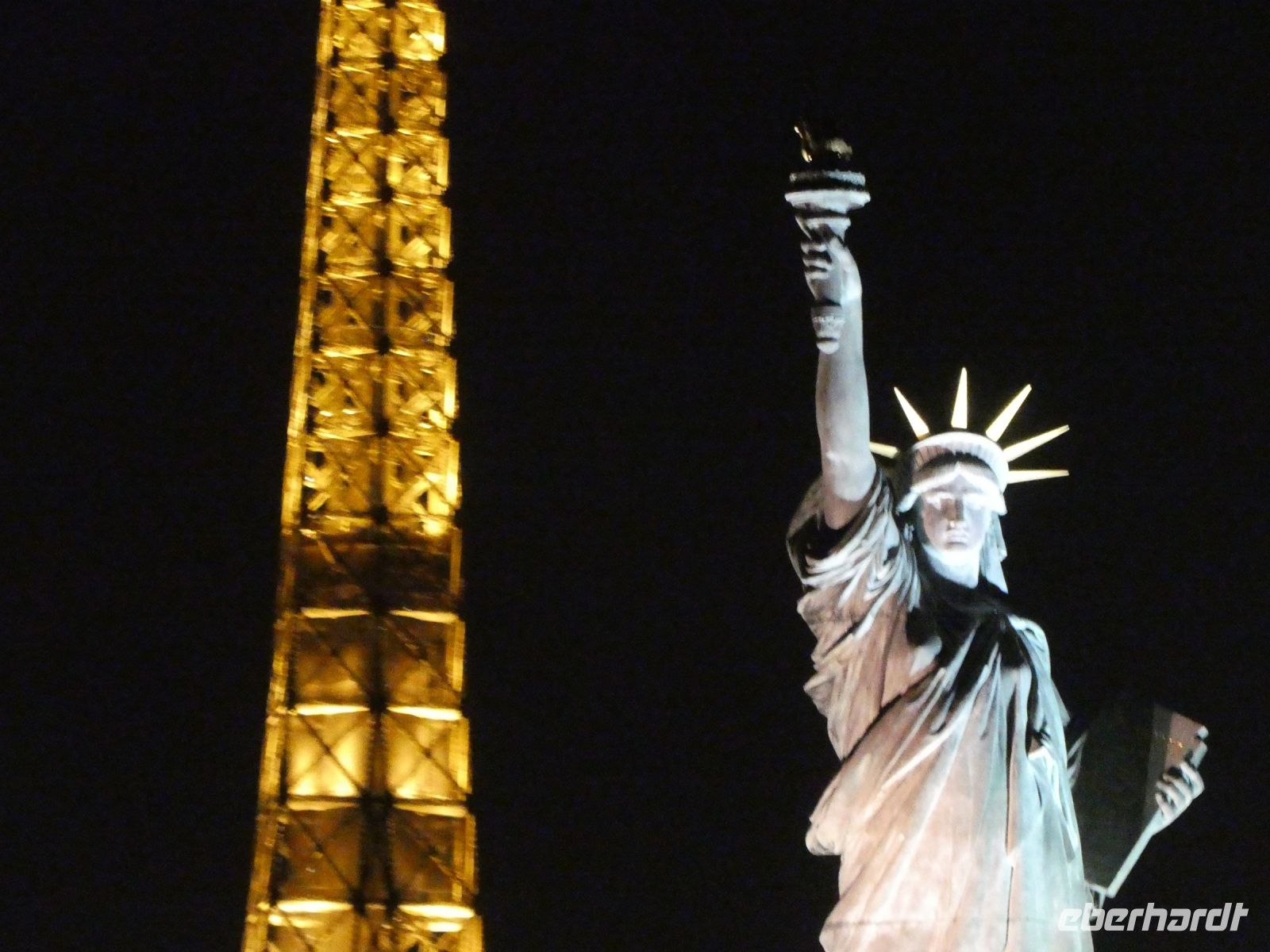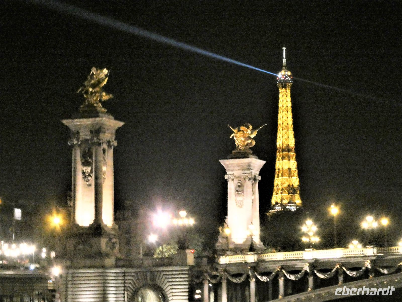Heute Abend geht es noch einmal zum "Seine-Kai" um zu einer nächtlichen "Dinner-Kreuzfahrt" auf der Seine zu starten. Wir fahren mit dem weiteren wichtigen Verkehrsmittel, der Stadtbahn der SNCF auch RER genannt von St. Michel zur "Pont d'Alba", eine der vielen Brücken über die Seine. Die Anlegestelle befindet sich unter dem Eiffelturm. Nachdem wir unsere Eintrittskarten eingetauscht haben werden wir zu unserem Tisch gebracht. Der Kir lässt auch nicht lange auf sich warten und leitet das Abendessen ein. Wir legen ab und fahren gemächlich die Seine hinauf und wieder hinab. Die prachtvollen Gebäude gleiten an uns vorbei und langsam mit dem Dunkelwerden kommen auch die verschiedenen Beleuchtungen zur Geltung. Als wir bei der Nachspeise angelangt sind zieht es uns zu den letzten Fotos des Tages hinaus. Der beleuchtete Eiffelturm erhellt in gewissen zeitlichen Abständen mit Sternenblitzen die Nacht. Achtung! Nicht veröffentlichen! Die "Pont Alexandre III" mit ihren beeindruckenden Pylonen aus Bronze bilden ein wunderbares Ensamble mit dem Eiffelturm. Auch die "Freiheitsstatue" am Ende der "Île aux Cygnes" (Storcheninsel), die ein Geschenk amerikanischer Bürger war, liefert eine beeindruckende Szenerie.