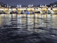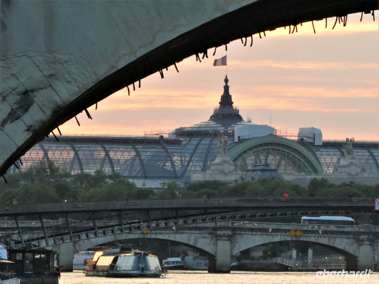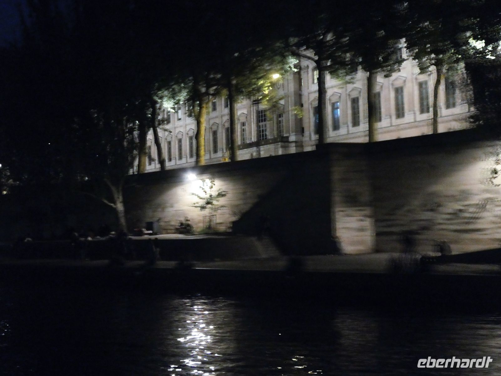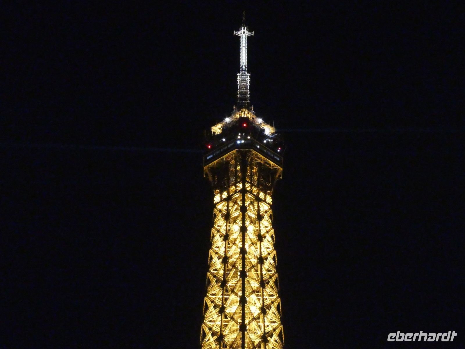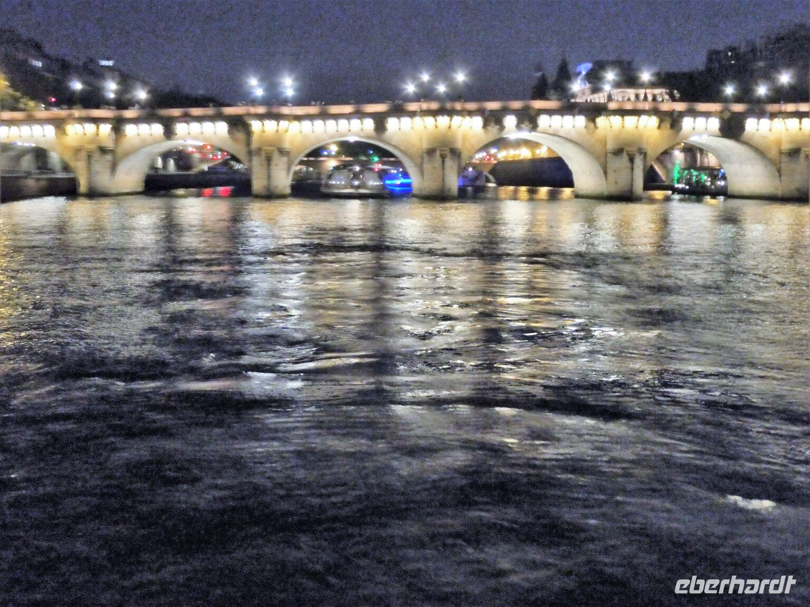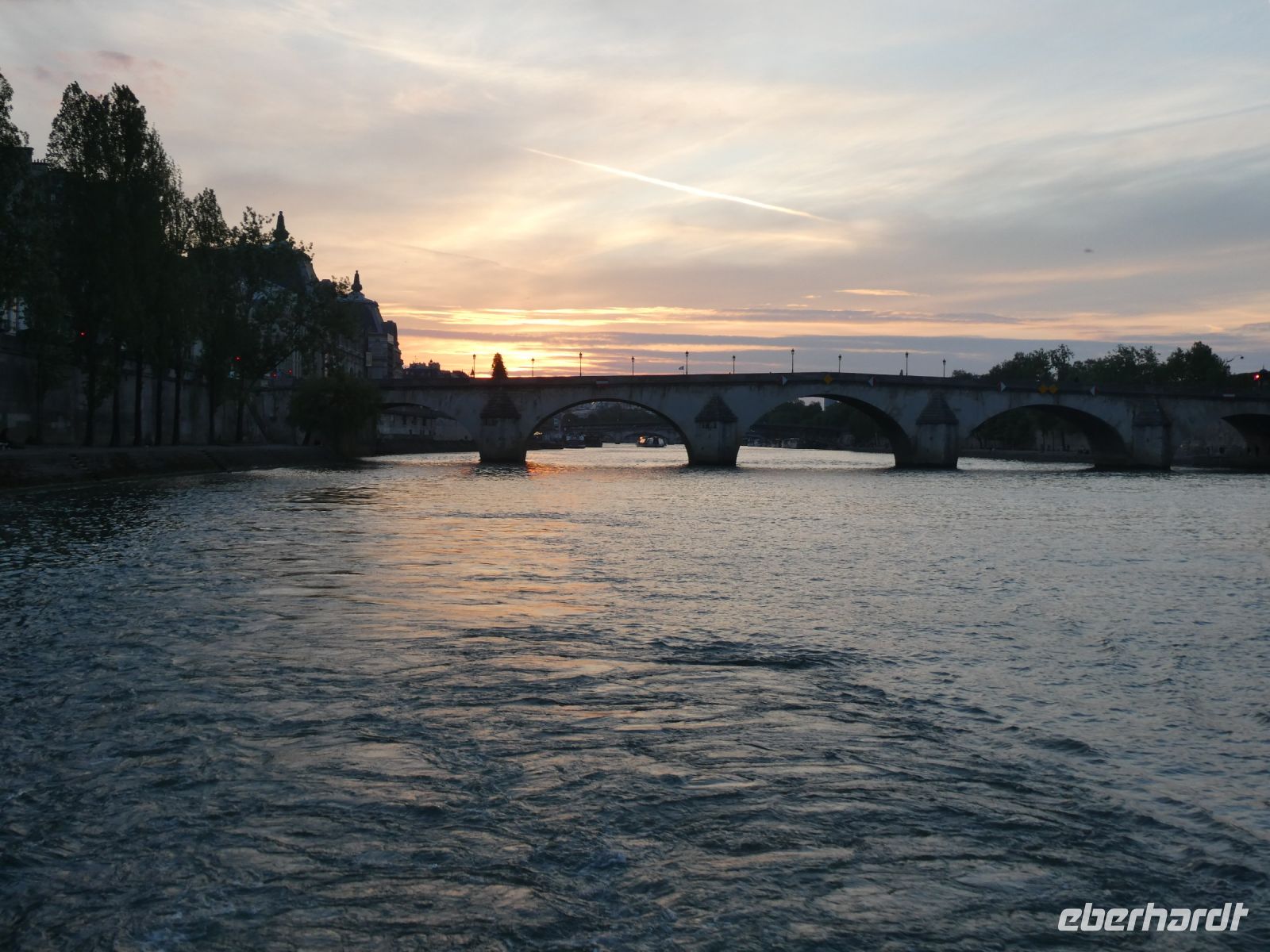 Heute Abend geht es noch einmal zum "Seine-Kai" um zu einer nächtlichen "Dinner-Kreuzfahrt" auf der Seine zu starten. Wir fahren mit dem weiteren wichtigen Verkehrsmittel, der Stadtbahn der SNCF auch RER genannt von St. Michel zur "Pont d'Alba", eine der vielen Brücken über die Seine. Die Anlegestelle befindet sich unter dem Eiffelturm. Nachdem wir unsere Eintrittskarten eingetauscht haben werden wir zu unserem Tisch gebracht. Der Kir lässt auch nicht lange auf sich warten und leitet das Abendessen ein. Wir legen ab und fahren gemächlich die Seine hinauf und wieder hinab. Die prachtvollen Gebäude gleiten an uns vorbei und langsam mit dem Dunkelwerden kommen auch die verschiedenen Beleuchtungen zur Geltung. Als wir bei der Nachspeise angelangt sind zieht es uns zu den letzten Fotos des Tages hinaus. Der beleuchtete Eiffelturm erhellt in gewissen zeitlichen Abständen mit Sternenblitzen die Nacht. Achtung! Nicht veröffentlichen! Die "Pont Alexandre III" mit ihren beeindruckenden Pylonen aus Bronze bilden ein wunderbares Ensamble mit dem Eiffelturm. Auch die "Freiheitsstatue" am Ende der "Île aux Cygnes" (Storcheninsel), die ein Geschenk amerikanischer Bürger war, liefert eine beeindruckende Szenerie.