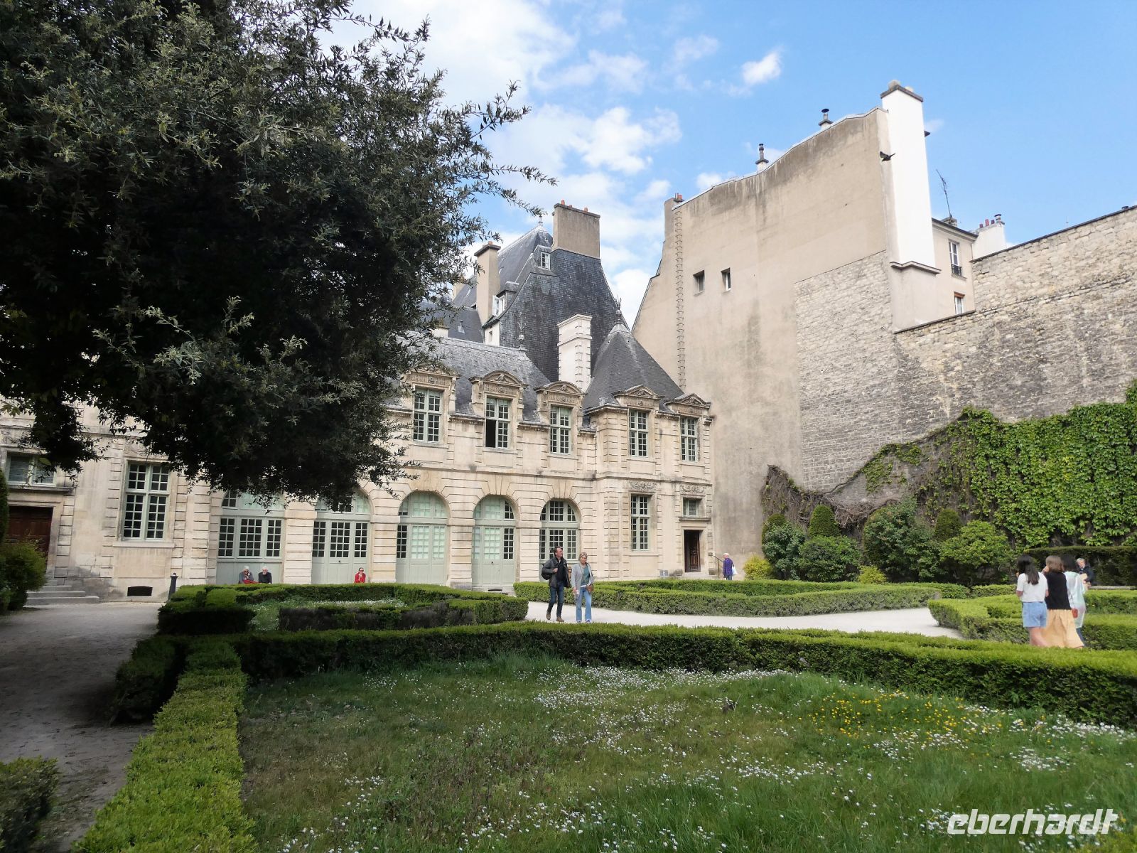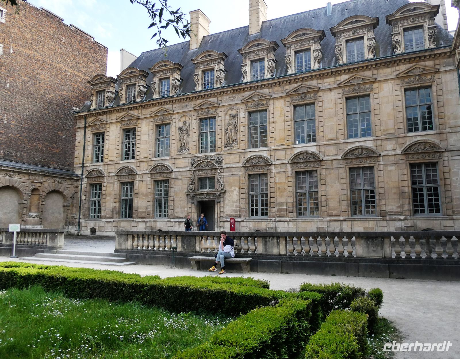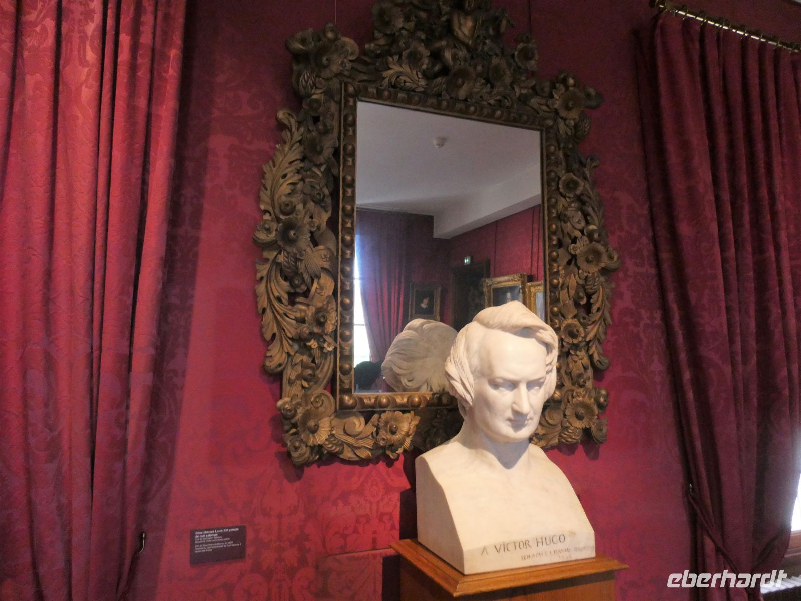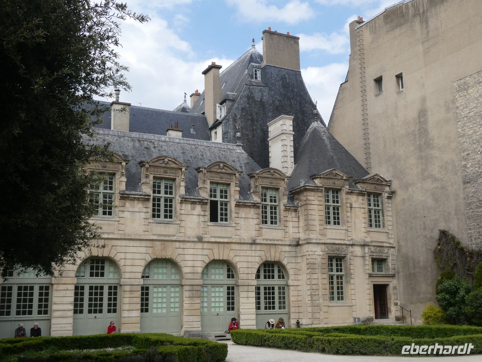 Nach unserem Treffen am Rathaus von Paris spazieren wir weiter in die außergewöhnliche Kirch St.Paul mit ihrer besonderen Orgel. Hier werden heute noch Konzerte veranstaltet. Gerade werden die "Vier Jahreszeiten" von Vivaldi angekündigt. Schade, da werden wir uns schon wieder verabschiedet haben. In Richtung unsere nächsten Ziels streifen wir das "Musée Carnavalet", ebenfalls ein Stadtpalast in dem die Pariser Stadtgeschichte in Bildern und Möbeln eindrücklich dargestellt wird. Im Innenhof grüßt ein Standbild Ludwigs XIV. Durch den Garten des "Palais Sully" gelangen wird zu dem wohl berühmtesten Platz des Marais, dem "Place des Vosges". Hier im Garten fällt auf, dass die Gebäude an manchen Stellen etwas schief sind, sie sind auf Sumpf gebaut. Der "Place des Vosges" ist der älteste Platz in Paris mit einem exakten Maß von 140 x 140 Metern. Die Vogesen hatten im Jahr 1800 die Revolutionssteuer komplett bezahlt (1789 franz.Rev.) und so wurde der Platz nach ihnen benannt. Hier am Platz fand auch der damals schon bekannte Schriftsteller Victor Hugo. Er hatte 1832 seinen ersten großen Erfolg mit dem Roman "Notre Dame de Paris" gefeiert und konnte für sich, seine Frau und seine 4 Kinder hier in diesem noblen Viertel eine Wohnung von 240qm mieten. Bis 1848 dem Jahr der revolutionären Unruhen wohnte er hier. Er war eher den royalisten zugeneigt und ging dann nach Guernsey ins Exil (dort gibt es auch ein Victor Hugo Museum). Das Museum welches anlässlich seines 100. Geburtstags eröffnet wurde zeigt in einer kostenlosen Ausstellung Gegenstände aus seinem Leben. Nach dieser Reise in das 19.Jahrhundert stärken wir uns in dem netten Café des Museums bei einem Gläschen Wein für dem Rückmarsch in das Hotel.