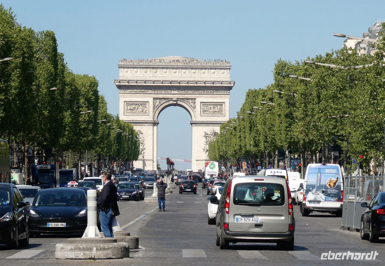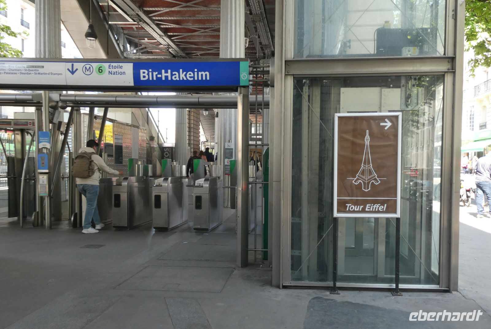 Unsere weitere Metro-Reise wird vereitelt: die M1, die uns zum "Triumphbogen" bringen soll, ist unterbrochen. So beschließen wir zu Fuß über den "Champs-Élysées" weiter zu gehen, vorbei am des Präsidenten. Da wir einen bestimmten Termin zur Besichtigung des "Eiffelturms" haben beschließen wir nach einem Foto des Triumphbogens erst einmal in Richtung Eiffelturm zu fahren um dann eine kleine Mittagspause zu machen. Wir fahren nach "Bir-Hakeim", der Station die einen oberen Metrobahnhof hat. Denn die Pariser Metro verläuft teilweise oberirdisch. Dort finden wir ein Kaffee in dem der wichtigste Hunger gestillt wird.
