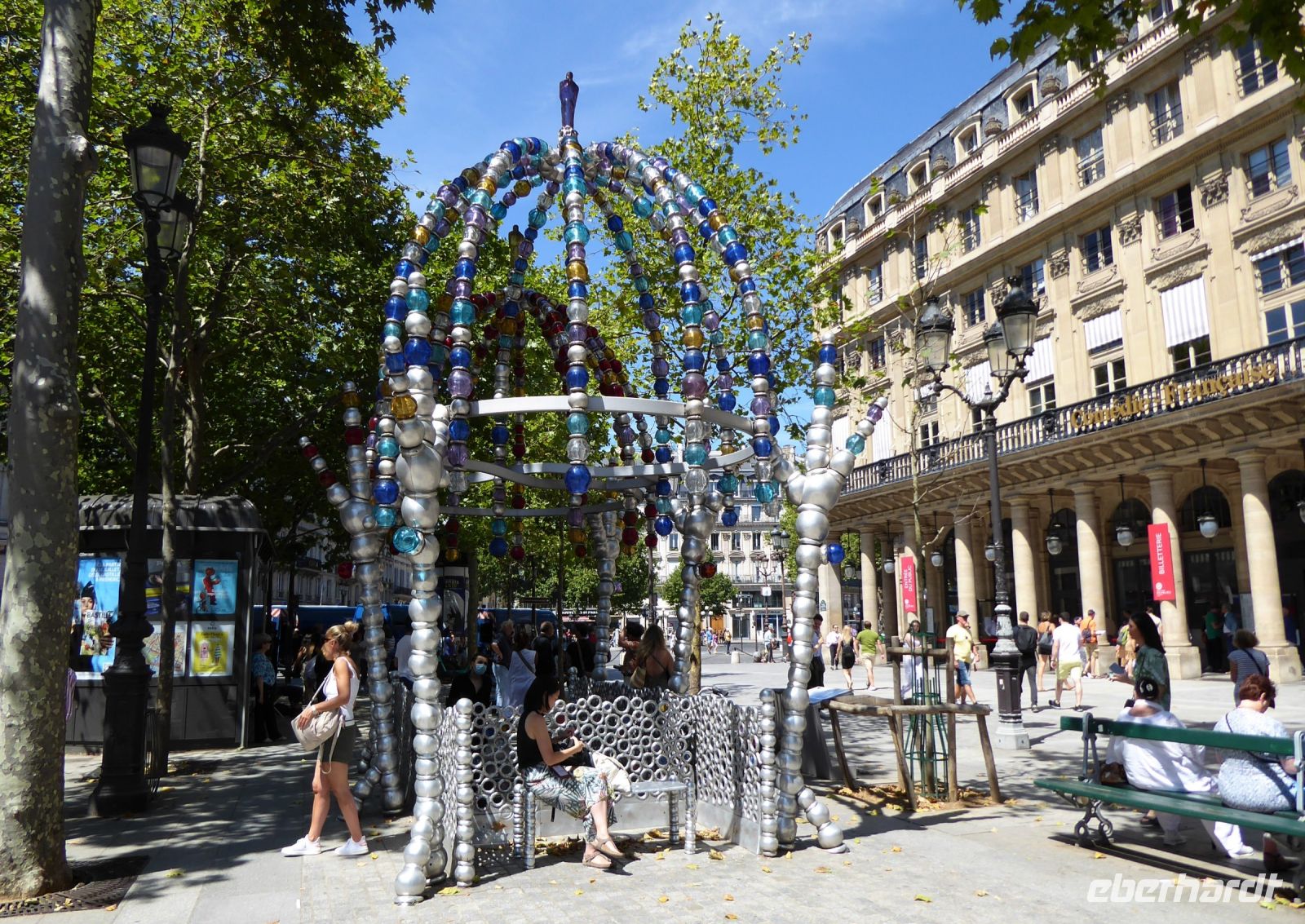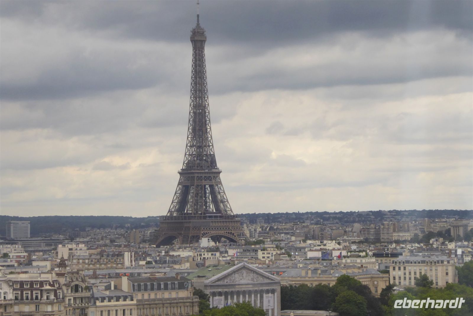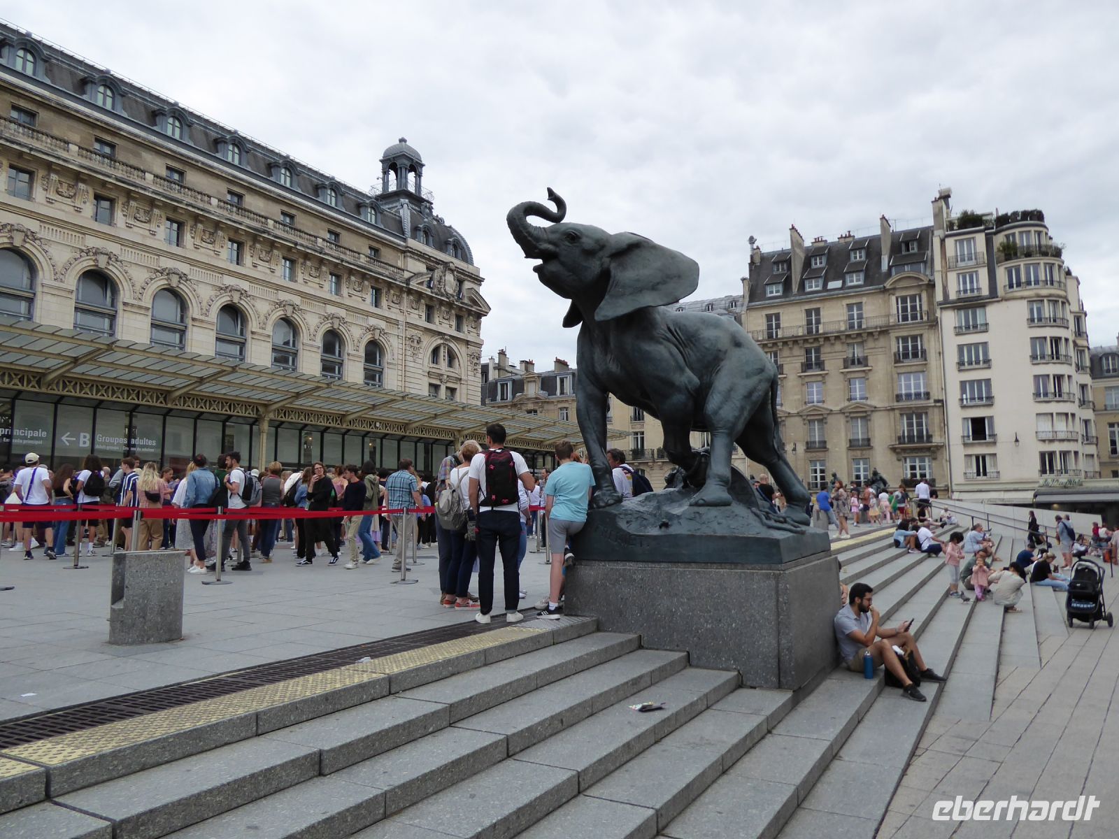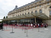 Heute widmeten wir uns intensiv den weiteren touristischen Highlights der Stadt. Gleich am Morgen ging es los entlang des Boulevard St. Germain in das belebte und luxuriöse Viertel Saint Germain-des-Près mit der gleichnamigen Kirche. Der erste Kirchenbau stammt bereits aus dem sechsten Jahrhundert, die Bausubstanz der heutigen Kirche aus dem 11. Jahrhundert. Besonders bemerkenswert sind die romanischen Kapitelle und der romanische Glockenturm, der einer der ältesten in Frankreich ist. Der gotische Chor der Kirche wurde im Jahr 1163 von Papst Alexander II geweiht. Für die Weiterfahrt in Richtung Innenstadt entschieden wir uns für den Bus und landeten wenige Minuten später am Palais Royal. Getrieben von körperlichen Bedürfnissen entschieden wir uns, gleich mit der Métro weiter zu fahren Der Künstler Jean Michel Othoniel hat die dortige Métrostation mit einer Glaskrone versehen, durch die der Fahrgast in die Tiefe steigt. Unsere nächste Station, Champs-Èlysées/ Clemenceau liegt direkt am Grand Palais. Unser Ziel hieß Petit Palais. Die beide Bauwerke wurden anlässlich der in Paris ausgerichteten Weltausstellung von 1900 als Ausstellungspavillon errichtet. Das Petit Palais beherbergt heute das städtische Museum der Schönen Künste mit Bildern und Skulpturen unter anderem von Paul Cézanne, Gustave Courbet und Auguste Rodin. Zudem hat das lichtdurchflossene Gebäude im herrlichen mit Palmen bepflanzten Innenhof ein nettes kleines Selbstbedienungsrestaurant, das uns für eine kleine Pause gerade recht kam. Anschließend spazierten wir den baumbestandenen Prachtboulevard der Champs Elysées nach oben zum Arc de Triomphe, vorbei an den chicken Niederlassungen von Dior, Louis Vuitton, Yves Saint Laurent, Chanel und anderen Nobelmarken der Luxusklasse. In der Konditorei Ladurée, deren Stammhaus bereits 160 Jahre Pâtisserie Geschichte schreibt, gibt es die besten und, mit dem stolzen Preis von 2.50€ pro Stück, auch die teuersten Macarons. Doch Geld spielt hier scheinbar keine Rolle! Wir verließen die prestigeträchtige Straße an der Métrostation an der Place d´Étoile, dem Platz der heute nach dem ersten Präsidenten der Fünften Republik Place Charles de Gaulle heißt. Zwölf große Pariser Boulevard münden sternförmig in den Platz, in dessen Mitte sich der 1806 zum Ruhm der kaiserlichen Armeen Napoleons errichtete Triumphbogen befindet, der bis 1989 mit der Einweihung des Grande Arche in La Défense das Ende der historischen Achse vom Louvre über den Arc de Triomphe du Carrousel, dem Obelisk von Luxor auf der Place de la Concorde zum Arc de Triomphe auf der Place d´Étoile führte. Um den vorläufig letzten Punkt der historischen Achse aus der Nähe zu betrachten, fuhren wir kurz entschlossen in das moderne Hochhaus- und Büroviertel La Défense. Mit 110 m Höhe und einer Breite von 106 m ist das Bauwerk des dänischen Architekten Johan Otto von Spreckelsen mehr als doppelt so groß wie der Arc de Triomphe! Paris ist eine Stadt der Superlative. In wenigen Minuten waren wir wieder zurück in der Innenstadt und bummelten durch den Jardin des Tuileries über die Seine Brücke zum ehemaligen innerstädtischen Bahnhof Orsay, der bis 1939 für den Fernverkehr in den Südwesten Frankreichs genutzt wurde. Nach langen Jahren des Leerstandes und Umbaus beherbergt das auch um 1900 anlässlich der Weltausstellung errichtete Gebäude seit 1986 Gemälde, Skulpturen, Grafiken, Fotografieren sowie Werke des Kunsthandwerks, des Designs und der Architektur aus der Zeit zwischen 1848 und 1914.