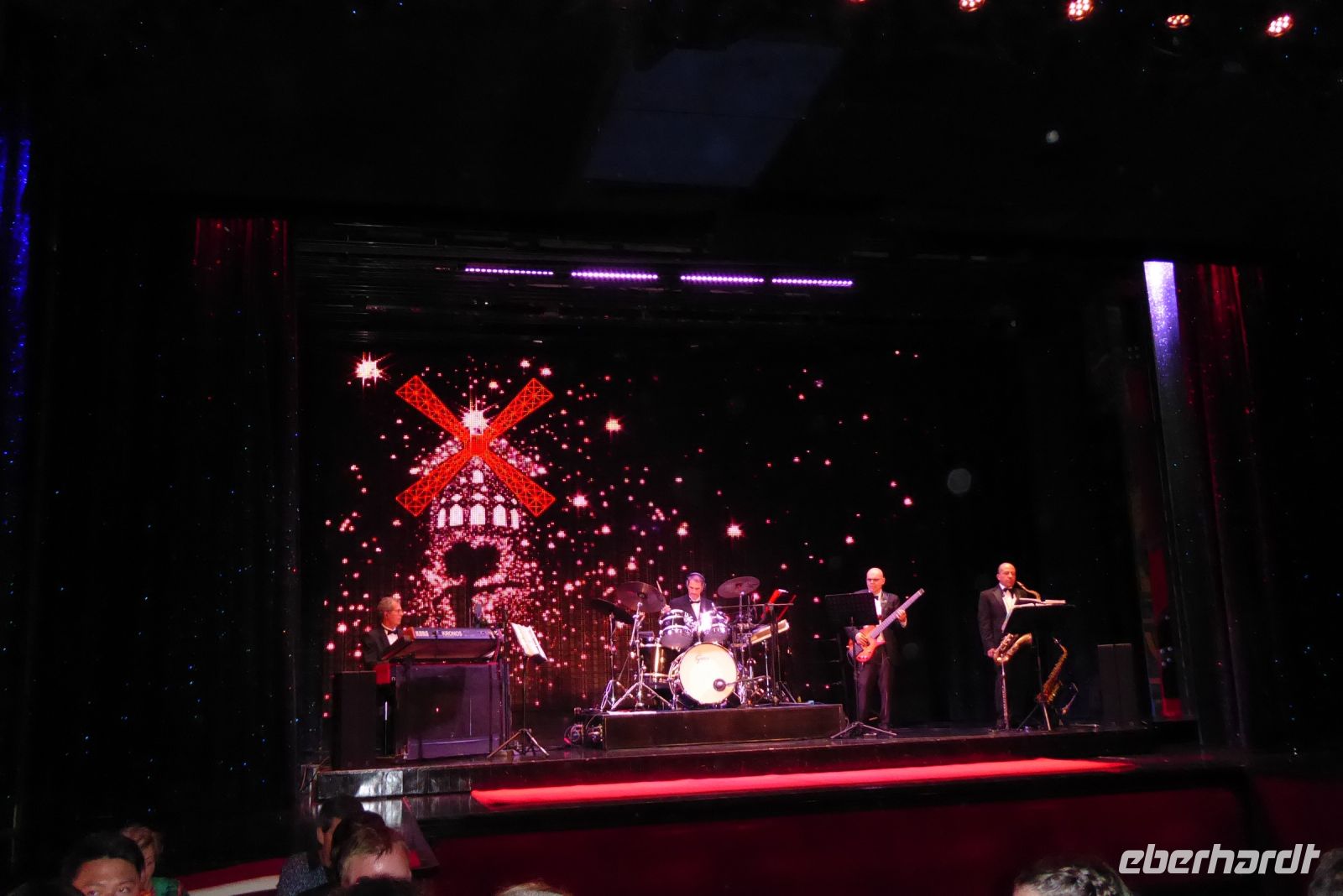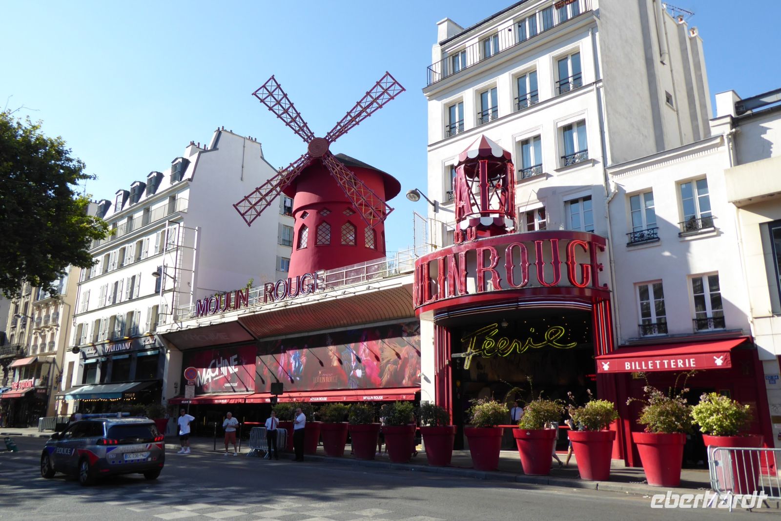Am Abend erwartete uns im Varietétheater Moulin Rouge zu prickelndem Champagner eine Schau der Superlative. Nach einem leckeren Drei Gänge Menü, untermalt mit Livemusik, wirbelten sogleich mit nur wenigen Federchen und Perlenschnüren bekleidete Tänzerinnen über die Bühne. Heute, wie vor 130 Jahren, lässt diese Show nicht nur Männerherzen höherschlagen. Bis zu fünfzig Tänzerinnen und Tänzer mit ihren fantasievollen Kostümen sowie Akrobaten der Spitzenklasse ließen das Leben auf dem Montmartre der Belle Époche wieder auferstehen. Mit einem furiosen Can-Can in einem blau-weiß roten Farbrausch endete der leichtfüßig und barbusig dargebrachte Spaziergang durch die Geschichte des berühmten Amüsierviertels in Paris.