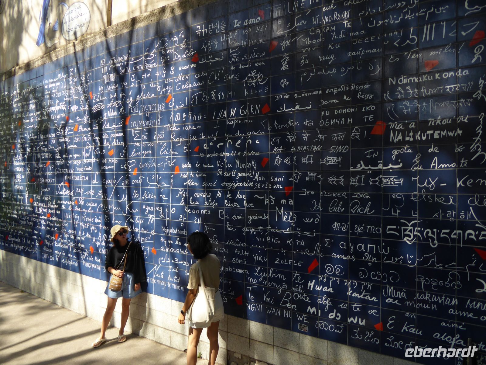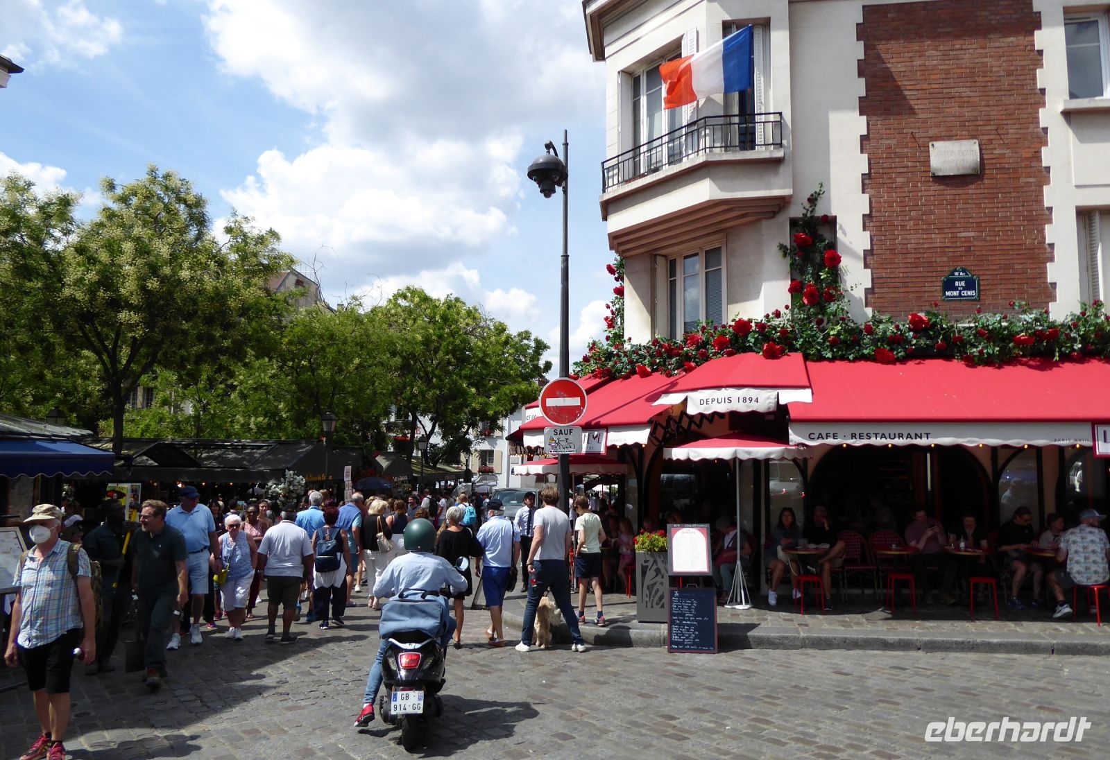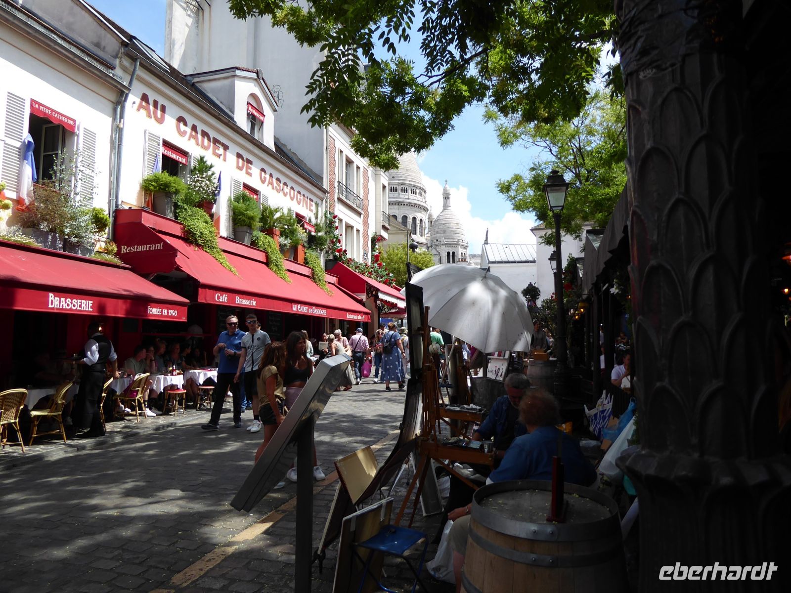 Nach einem leckeren Frühstück im Hotel St. Paul mit frischem Obstsalat, knusprigen Croissants, verschiedenen Säften und leckerem Gebäck, machten wir uns auf den Weg mit der Métro den 130 Meter hohen Berg im Norden von Paris zu entdecken. Stolz thront die Basilika Sacre Coeur hoch oben auf dem Montmartre. Ihre schneeweißen Kuppeln heben sich weithin sichtbar vom Blau des Himmels ab. Nach der Grundsteinlegung der Kirche im Jahr 1875 vergingen fast vier Jahrzehnte bis die im romanisch byzantinischen Stil errichtete Kirche geweiht wurde. In ihrem Glockenturm hängt die größte Glocke Frankreichs, die Savoyarde, die in der Glockengießerei Paccard in Annecy-le-Vieux gegossen wurde. 28 Pferde wurden benötigt, die fast 19 Tonnen schwere Glocke auf den Berg hinauf zu ziehen! Wir entschieden uns für den Aufstieg statt der steilen Treppe den Funiculaire zu nutzen. Bei einem Entdeckerspaziergang über den Montmartre bestaunten wir den berühmten Weinberg, in dem jährlich noch gut 350 Liter Wein produziert werden. In den alten Kabaretts, wie dem „Lapin Agil“ wird noch immer Programm geboten, das an die gute alte Zeit erinnert. Viele berühmte Maler lebten oder arbeiteten auf dem Montmartre: van Gogh, Renoir, Picasso, Matisse, Dalí und natürlich Toulouse-Lautrec dessen Plakatentwürfe bis heute unsere Vorstellung vom dortigen Künstlerleben prägen. Am Ende einer steilen Treppe wurden wir mit dem Denkmal der französische Chansonsängerin Dalida belohnt. Unter dem bürgerlichen Namen Jolanda Cristina Gigliotti in Kairo geboren, hinterließ uns die Sängerin mit der unnachahmlichen Stimme unvergessene Evergreens, wie zum Beispiel Ciao, ciao bambina, Paroles…Paroles… J’attendrai und Besame mucho. Bis zu ihrem Tod 1987 wurden weltweit 140.000.000 ihrer Schallplatten verkauft. in der Auslage eines Immobilienmaklers konnten wir uns von den schattigen Preisen der Appartements auf dem sonnigen Hügel überzeugen. Gleich daneben findet sich eine skurrile Skulptur des Künstlers und Schauspielers Jean Marais: ein Mann geht durch die Wand. Skurril geht es weiter mit einer Skulptur aus leuchtend weißem Kalkstein: es ist Sankt Dionys, der erste Bischof von Paris, der sein auf dem Richtplatz auf dem Montmarte abgeschlagenes Haupt in Händen trägt. Hier oben liegen leben, leiden und lieben nah beieinander. So findet man wenige Meter weiter in einem stillen ehemaligen Klostergarten die „Mur je t´aime“ des Sängers Frédéric Baron und der Kalligraphin Claire Kito, die in 311 Sprachen auf 40 m² blauer Kacheln die berühmtesten drei Worte der Welt pinselten! Tapfer stapften wir treppauf und treppab weiter durch die fabelhafte Welt der Amélie. Der Film mit Audrey Tautou, der sie und das Viertel zur Jahrtausendwende in aller Welt berühmt gemacht hat. Zum Mittagessen kehrten wir in eines der typischen Restaurants neben der Kirche St. Jean ein und verspeisten Salade Parisienne und Croques Monsieur. Auf der Place de Tertre geht es lebhaft zu, 280 Künstler teilen sich die begehrten Standplätze rund um den Platz, der heute ein riesiges Freiluftrestaurant ist.
