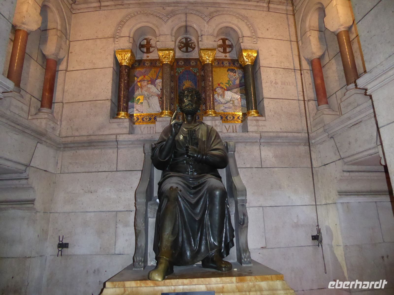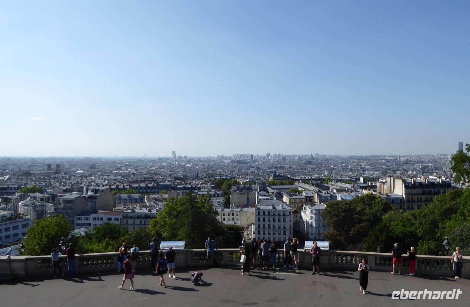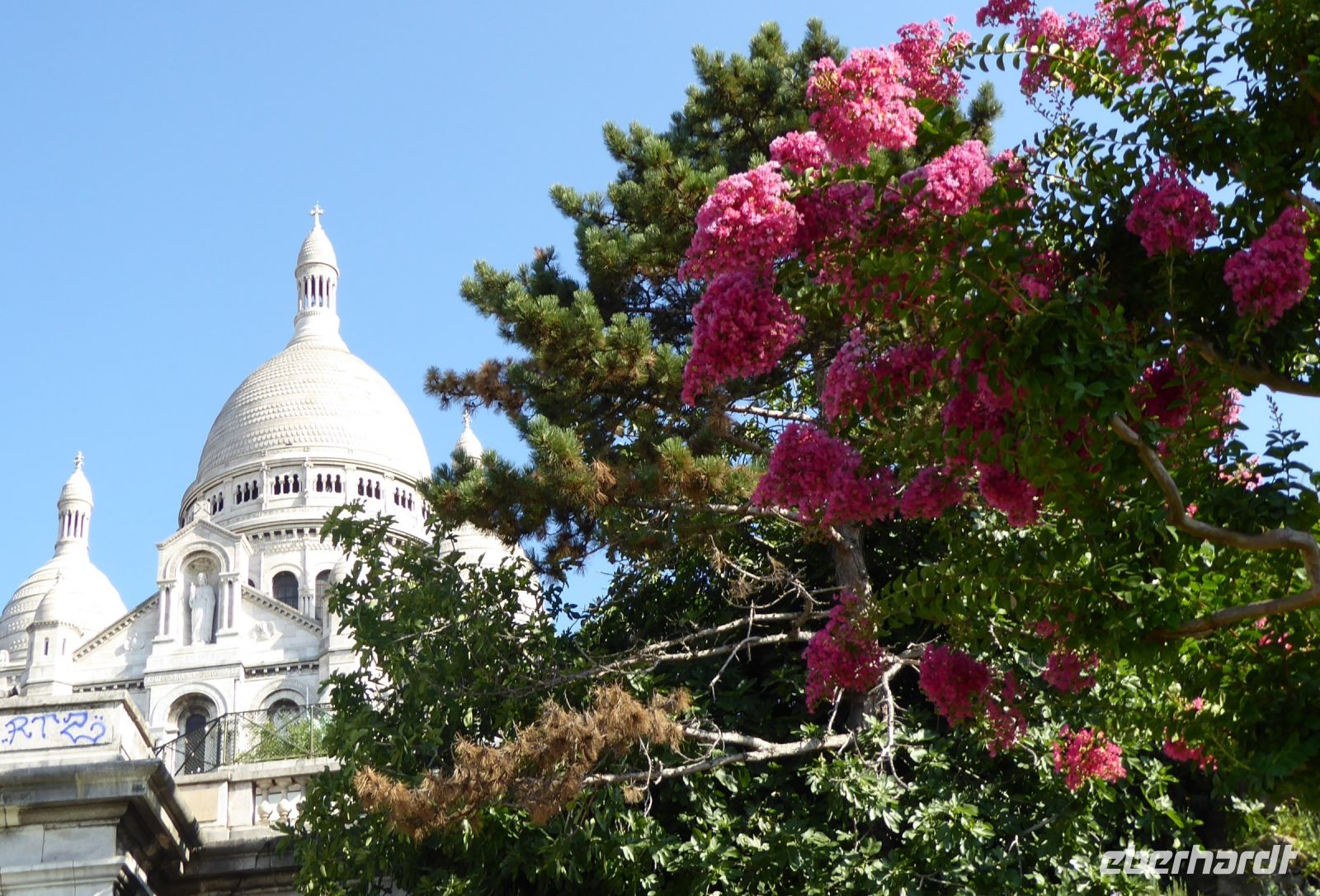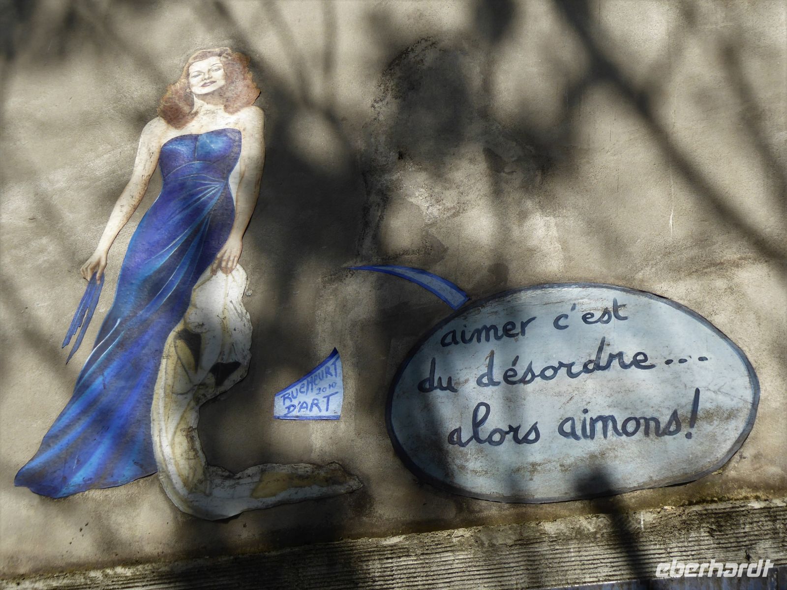 Nach einem leckeren Frühstück im Hotel St. Paul mit frischem Obstsalat, knusprigen Croissants, verschiedenen Säften und leckerem Gebäck, machten wir uns auf den Weg mit der Métro den 130 Meter hohen Berg im Norden von Paris zu entdecken. Stolz thront die Basilika Sacre Coeur hoch oben auf dem Montmartre. Ihre schneeweißen Kuppeln heben sich weithin sichtbar vom Blau des Himmels ab. Nach der Grundsteinlegung der Kirche im Jahr 1875 vergingen fast vier Jahrzehnte bis die im romanisch byzantinischen Stil errichtete Kirche geweiht wurde. In ihrem Glockenturm hängt die größte Glocke Frankreichs, die Savoyarde, die in der Glockengießerei Paccard in Annecy-le-Vieux gegossen wurde. 28 Pferde wurden benötigt, die fast 19 Tonnen schwere Glocke auf den Berg hinauf zu ziehen! Wir entschieden uns für den Aufstieg statt der steilen Treppe den Funiculaire zu nutzen. Bei einem Entdeckerspaziergang über den Montmartre bestaunten wir den berühmten Weinberg, in dem jährlich noch gut 350 Liter Wein produziert werden. In den alten Kabaretts, wie dem „Lapin Agil“ wird noch immer Programm geboten, das an die gute alte Zeit erinnert. Viele berühmte Maler lebten oder arbeiteten auf dem Montmartre: van Gogh, Renoir, Picasso, Matisse, Dalí und natürlich Toulouse-Lautrec dessen Plakatentwürfe bis heute unsere Vorstellung vom dortigen Künstlerleben prägen. Am Ende einer steilen Treppe wurden wir mit dem Denkmal der französische Chansonsängerin Dalida belohnt. Unter dem bürgerlichen Namen Jolanda Cristina Gigliotti in Kairo geboren, hinterließ uns die Sängerin mit der unnachahmlichen Stimme unvergessene Evergreens, wie zum Beispiel Ciao, ciao bambina, Paroles…Paroles… J’attendrai und Besame mucho. Bis zu ihrem Tod 1987 wurden weltweit 140.000.000 ihrer Schallplatten verkauft. in der Auslage eines Immobilienmaklers konnten wir uns von den schattigen Preisen der Appartements auf dem sonnigen Hügel überzeugen. Gleich daneben findet sich eine skurrile Skulptur des Künstlers und Schauspielers Jean Marais: ein Mann geht durch die Wand. Skurril geht es weiter mit einer Skulptur aus leuchtend weißem Kalkstein: es ist Sankt Dionys, der erste Bischof von Paris, der sein auf dem Richtplatz auf dem Montmarte abgeschlagenes Haupt in Händen trägt. Hier oben liegen leben, leiden und lieben nah beieinander. So findet man wenige Meter weiter in einem stillen ehemaligen Klostergarten die „Mur je t´aime“ des Sängers Frédéric Baron und der Kalligraphin Claire Kito, die in 311 Sprachen auf 40 m² blauer Kacheln die berühmtesten drei Worte der Welt pinselten! Tapfer stapften wir treppauf und treppab weiter durch die fabelhafte Welt der Amélie. Der Film mit Audrey Tautou, der sie und das Viertel zur Jahrtausendwende in aller Welt berühmt gemacht hat. Zum Mittagessen kehrten wir in eines der typischen Restaurants neben der Kirche St. Jean ein und verspeisten Salade Parisienne und Croques Monsieur. Auf der Place de Tertre geht es lebhaft zu, 280 Künstler teilen sich die begehrten Standplätze rund um den Platz, der heute ein riesiges Freiluftrestaurant ist.