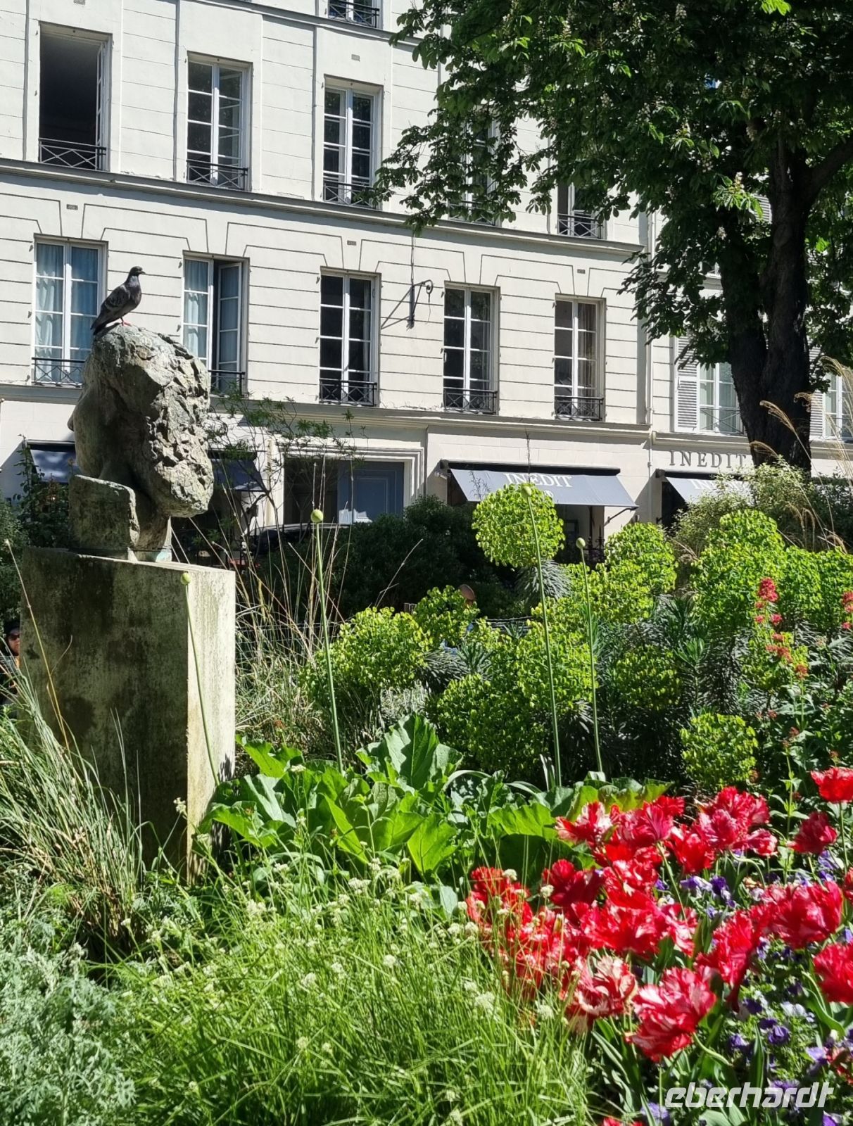 Auf dem Weg wieder abwärts kommen wir noch beim Atelierhaus von Suzanne Valadon und dem kleinen Weinberg vorbei. Ausgerechnet die Leidensgeschichte von Saint-Denis bietet die ersehnte Möglichkeit für eine Rast auf einer Gartenbank, frisches Wasser gibt es auch. Der erste Pariser Bischof wurde für seinen Glauben hingerichtet. Mit dem Kopf unter dem Arm bestieg er die Anhöhe vor den Toren der damals römischen Stadt Lutetia, von seinem Martyrium leitet sich heute der Name des Viertels ab, der Berg der Leiden, Mont-Martre.