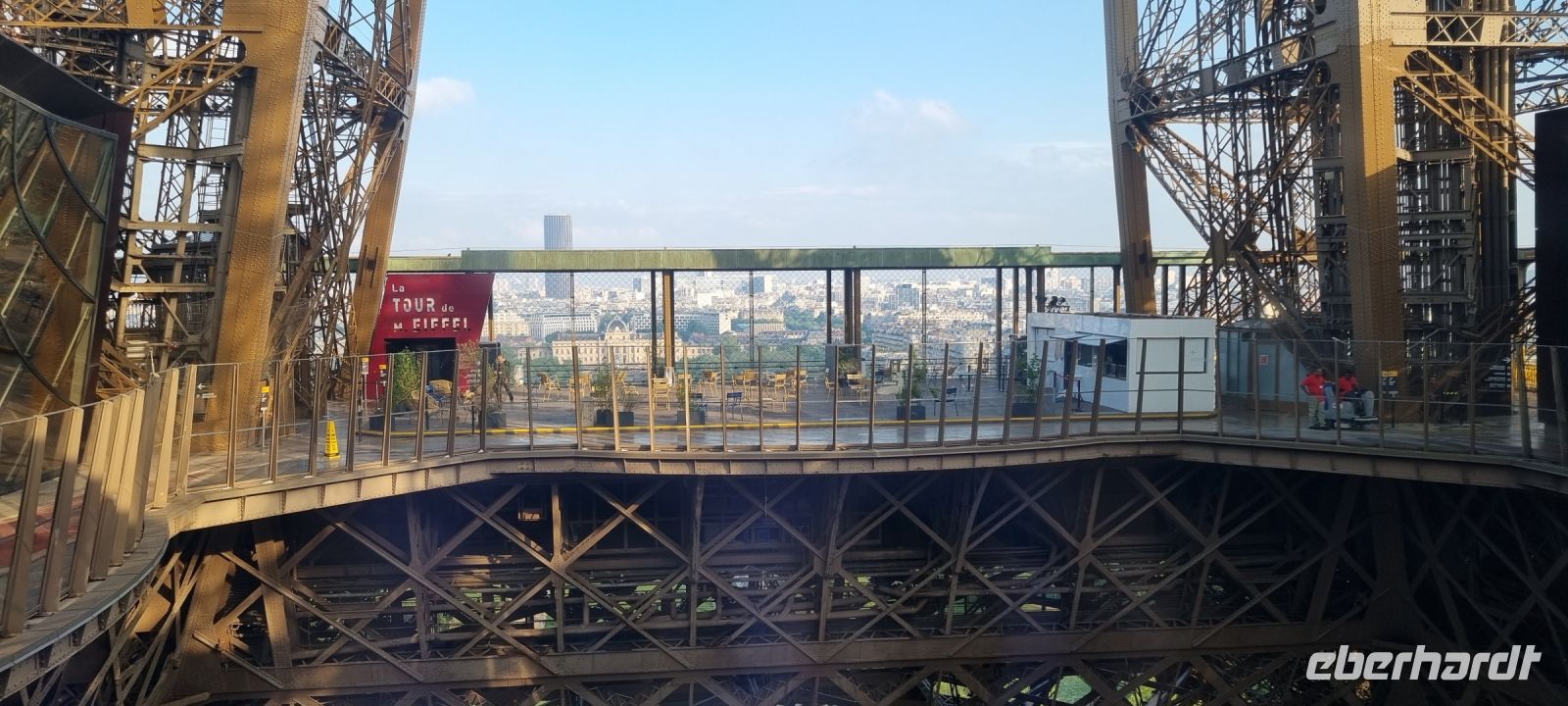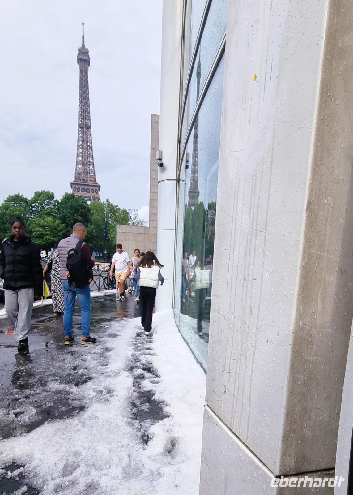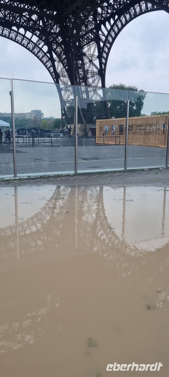 Nachdem sich der Himmel ausgetobt hat, machen wir uns am frühen Abend auf, um nun wieder im Sonnenschein zum Eiffelturm zu fahren. Dort sind die Spuren des Unwetters noch drastischer zu erkennen, überall liegen Haufen zusammengekehrter Hagelkörner und das noch frische Laub hat es von den Bäumen gefegt. Am Eingang des Eiffelturms angekommen, müssen wir mit vielen anderen feststellen, dass das Pariser Wahrzeichen wegen des Unwetters geschlossen ist. Mit unserer Restaurantreservierung macht man uns jedoch Hoffnung. Bevor wir den Sicherheitscheck tatsächlich noch passieren dürfen, müssen wir jedoch noch ein Sportprogramm absolvieren, den Turm von Eingang zu Eingang halb rumrunden und an riesigen Pfützen vorbeibalancieren. Mit etwas Verspätung sitzen wir schließlich doch noch im Madame Brasserie auf der Ersten Plattform und genießen unser Menü von Sternekoch Thierry Marx und den besonderen Ausblick. Unser Glück realisieren wir erst später, denn tatsächlich bleibt der Eiffelturm auch noch am Folgetag mit Ausnahme der Restaurants für Besucher geschlossen. Den in jeder Hinsicht spektakulären Abschuss unseres Reiseprogramms lassen wir etwas später im gemütlichen Gewölbekeller des Hotels noch einmal Revue passieren.