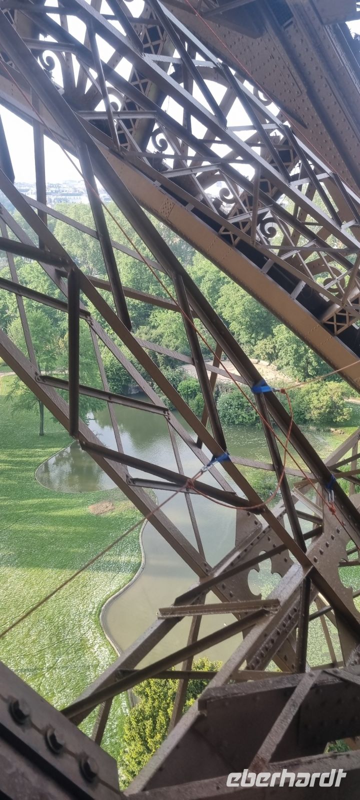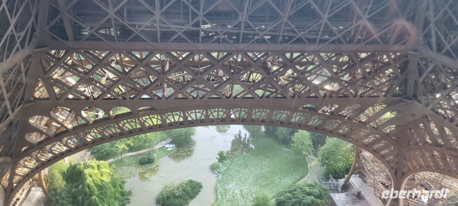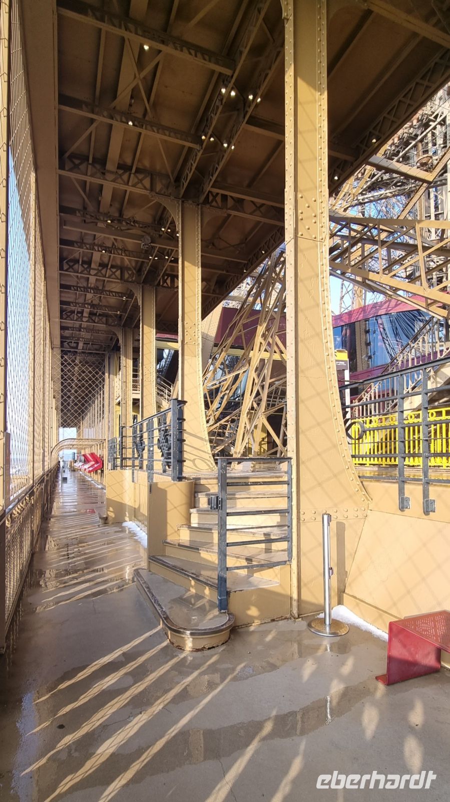 Nachdem sich der Himmel ausgetobt hat, machen wir uns am frühen Abend auf, um nun wieder im Sonnenschein zum Eiffelturm zu fahren. Dort sind die Spuren des Unwetters noch drastischer zu erkennen, überall liegen Haufen zusammengekehrter Hagelkörner und das noch frische Laub hat es von den Bäumen gefegt. Am Eingang des Eiffelturms angekommen, müssen wir mit vielen anderen feststellen, dass das Pariser Wahrzeichen wegen des Unwetters geschlossen ist. Mit unserer Restaurantreservierung macht man uns jedoch Hoffnung. Bevor wir den Sicherheitscheck tatsächlich noch passieren dürfen, müssen wir jedoch noch ein Sportprogramm absolvieren, den Turm von Eingang zu Eingang halb rumrunden und an riesigen Pfützen vorbeibalancieren. Mit etwas Verspätung sitzen wir schließlich doch noch im Madame Brasserie auf der Ersten Plattform und genießen unser Menü von Sternekoch Thierry Marx und den besonderen Ausblick. Unser Glück realisieren wir erst später, denn tatsächlich bleibt der Eiffelturm auch noch am Folgetag mit Ausnahme der Restaurants für Besucher geschlossen. Den in jeder Hinsicht spektakulären Abschuss unseres Reiseprogramms lassen wir etwas später im gemütlichen Gewölbekeller des Hotels noch einmal Revue passieren.