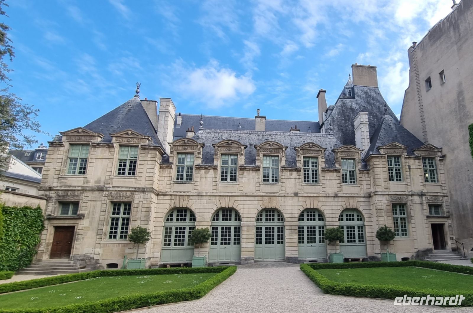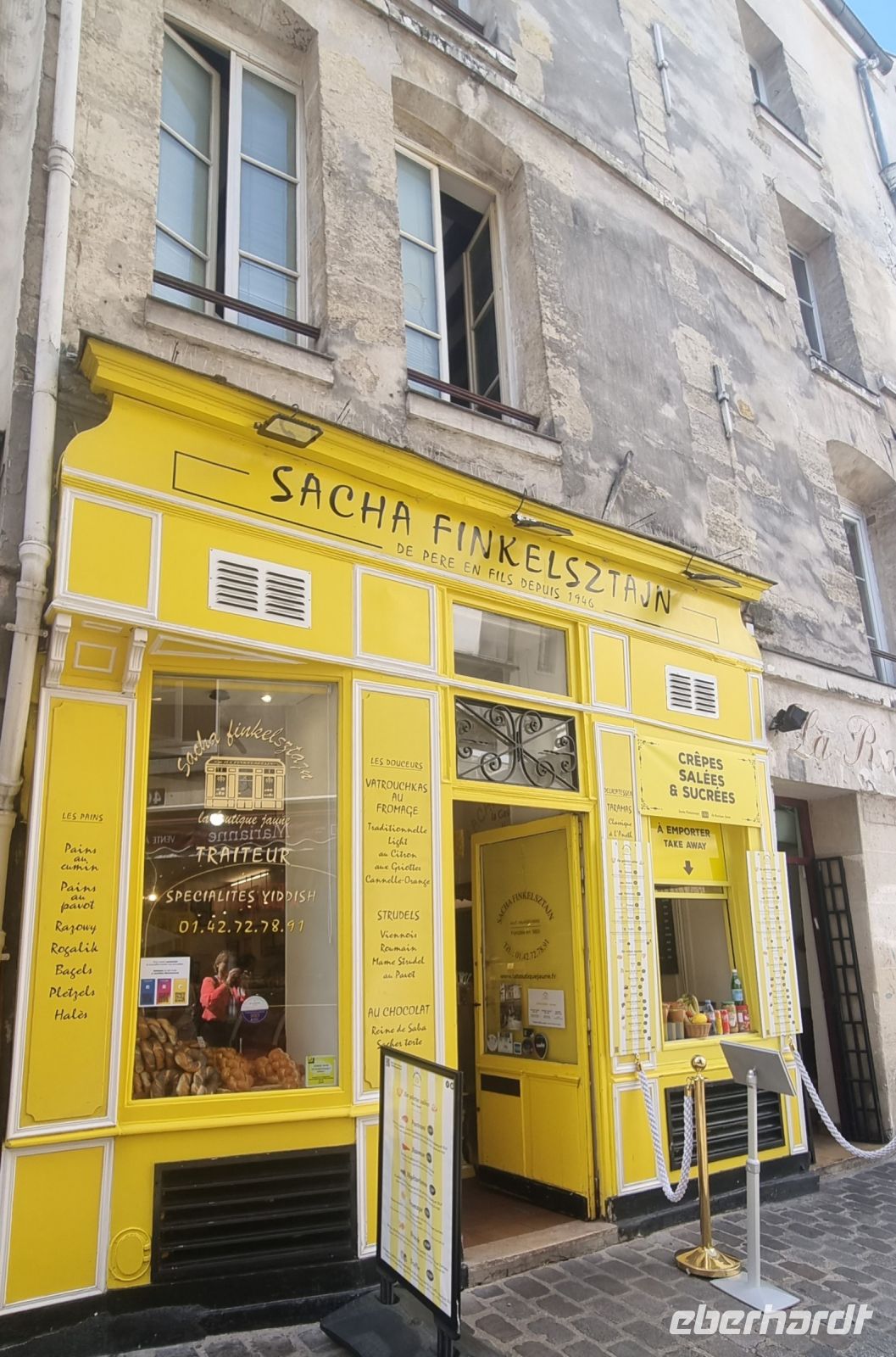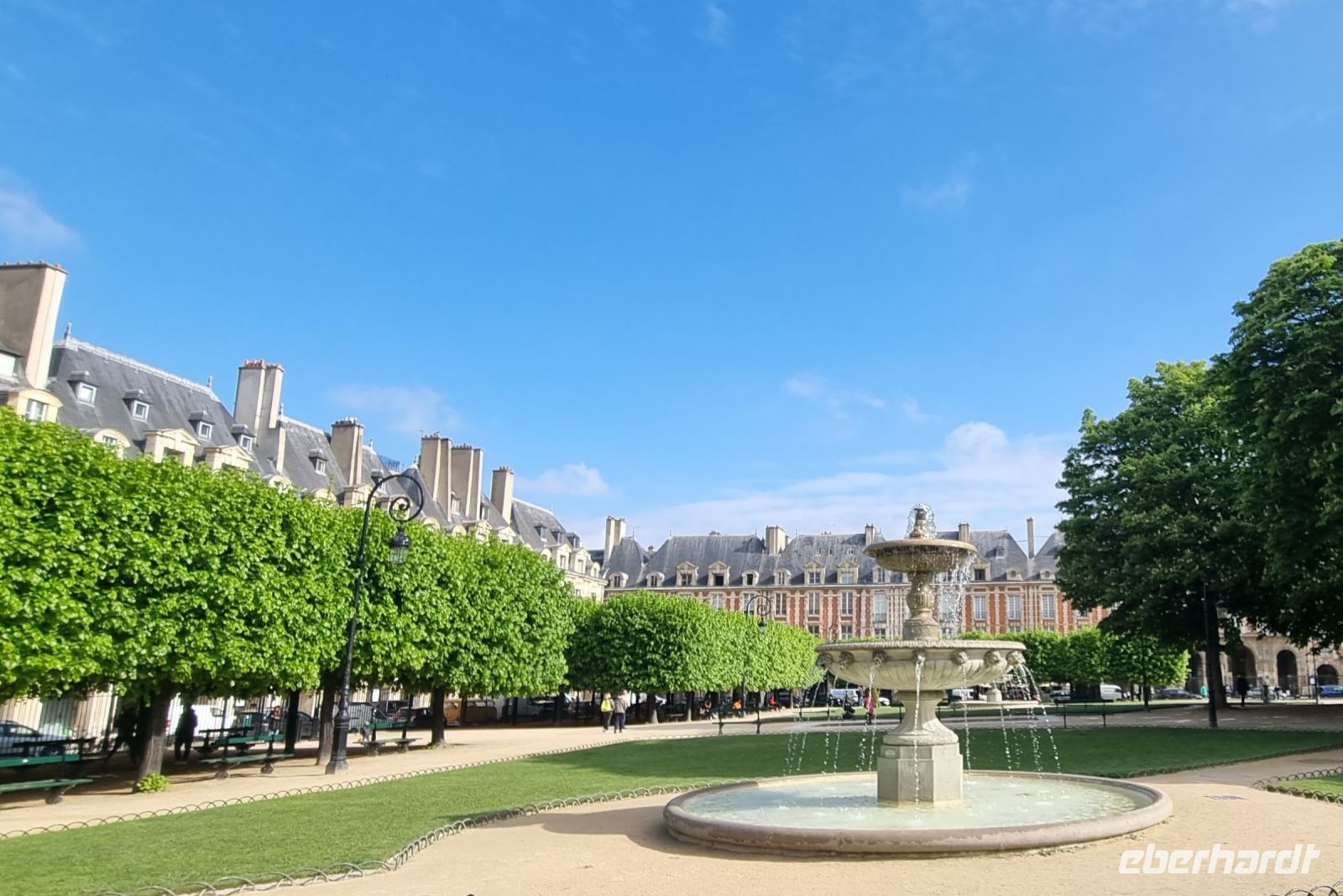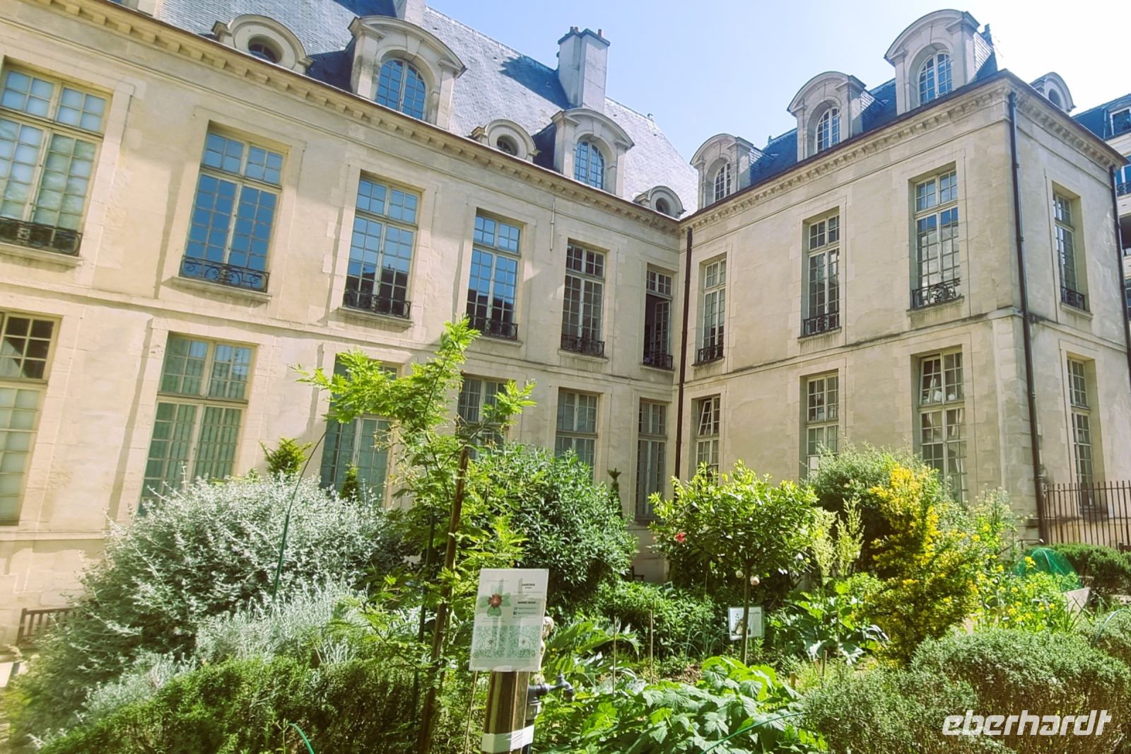 Anschließend bringt uns der Linienbus ins Marais-Viertel, das für seine vielen Stadtschlösser bekannt ist, in dem die Höflinge vor der Verlegung der Residenz nach Versailles lebten. Vom Hôtel de Sully, wo heute die nationale Denkmalverwaltung ihren Sitz hat, huschen wir durch den Garten der Orangerie zum Place des Vosges. Mit seinen Backsteinfassaden und dem grünen Geviert in der Mitte gilt er unbestritten als schönster Platz, der heute oft als Kulisse für Musketier-Filme dient. Es heißt, dass um 1600 König Heinrich IV. selbst Hand an die Pläne gelegt haben soll und so den allerersten Königlichen Platz kreierte. Nur wenige Schritte weiter werfen wir im Hôtel Carnavalet, dem heutigen Stadtmuseum, einen Blick in Hof und Garten. Durch Hinterhöfe und versteckte Gärten mit den Resten der mittelalterlichen Stadtmauer gelangen wir auf die Rue des Rosiers, die das Herz des jüdischen Viertels ist, wo es gegen Mittag aus den Falafel-Läden und Bäckereien schon verführerisch duftet.